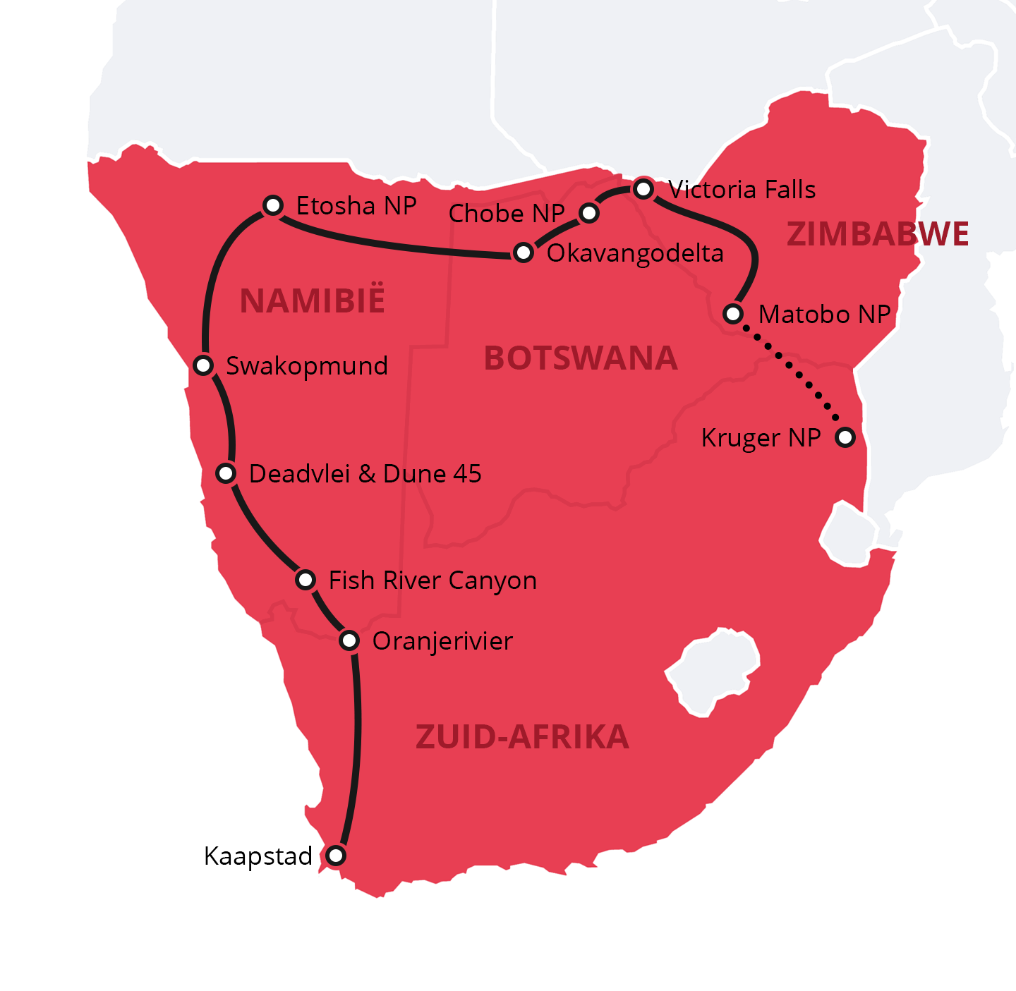Deze route brengt je langs de absolute hoogtepunten van Namibië, Botswana en Zimbabwe. Met Zuid-Afrika als start- en eindpunt van de reis krijg je ook een indruk van dit land. Wij hebben deze reis in maart 2016 met Shoestring gedaan in 23 dagen. Ruim 6.000 kilometer reden we over de hobbelige wegen. Ja, we waren veel onderweg, maar in dat prachtige landschap is dat geen straf!