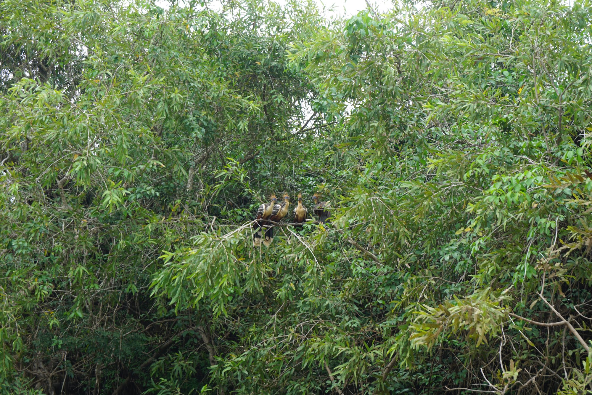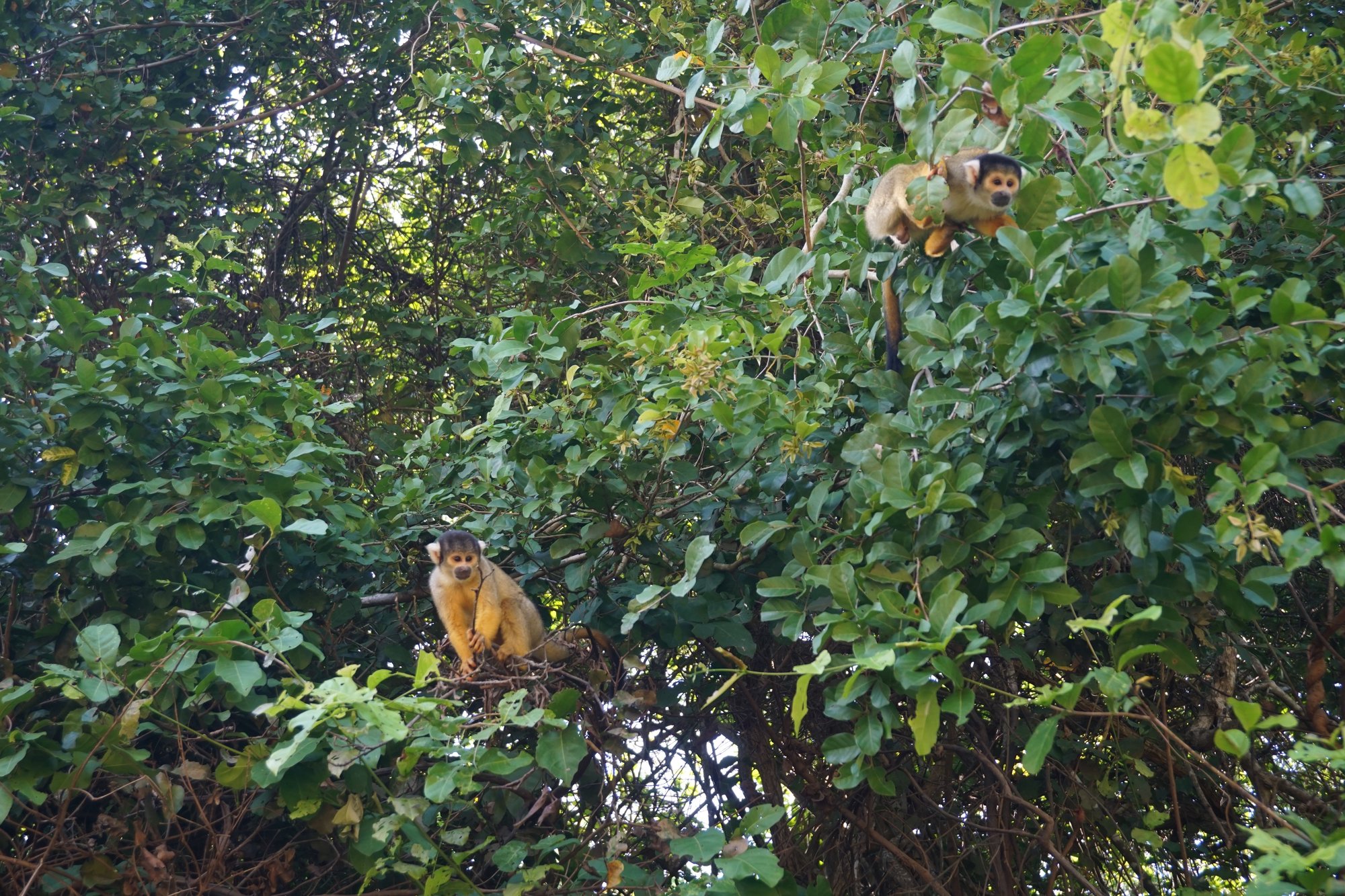 Nadat we een tijdje over de rivier hebben gevaren, zien we opnieuw de dolfijnen. Helaas zijn het er maar twee, onvoldoende om de kaaimannen en piranha's uit de buurt te houden. Onze gids zegt dat we wel mogen zwemmen, maar als we vragen of het helemaal veilig is, antwoordt hij niet heel geruststellend. "Mwaaaah", zegt hij. Oke, we skippen het zwemmen! Ik wil mijn grote teen graag nog langer houden dan vandaag. ;-)
