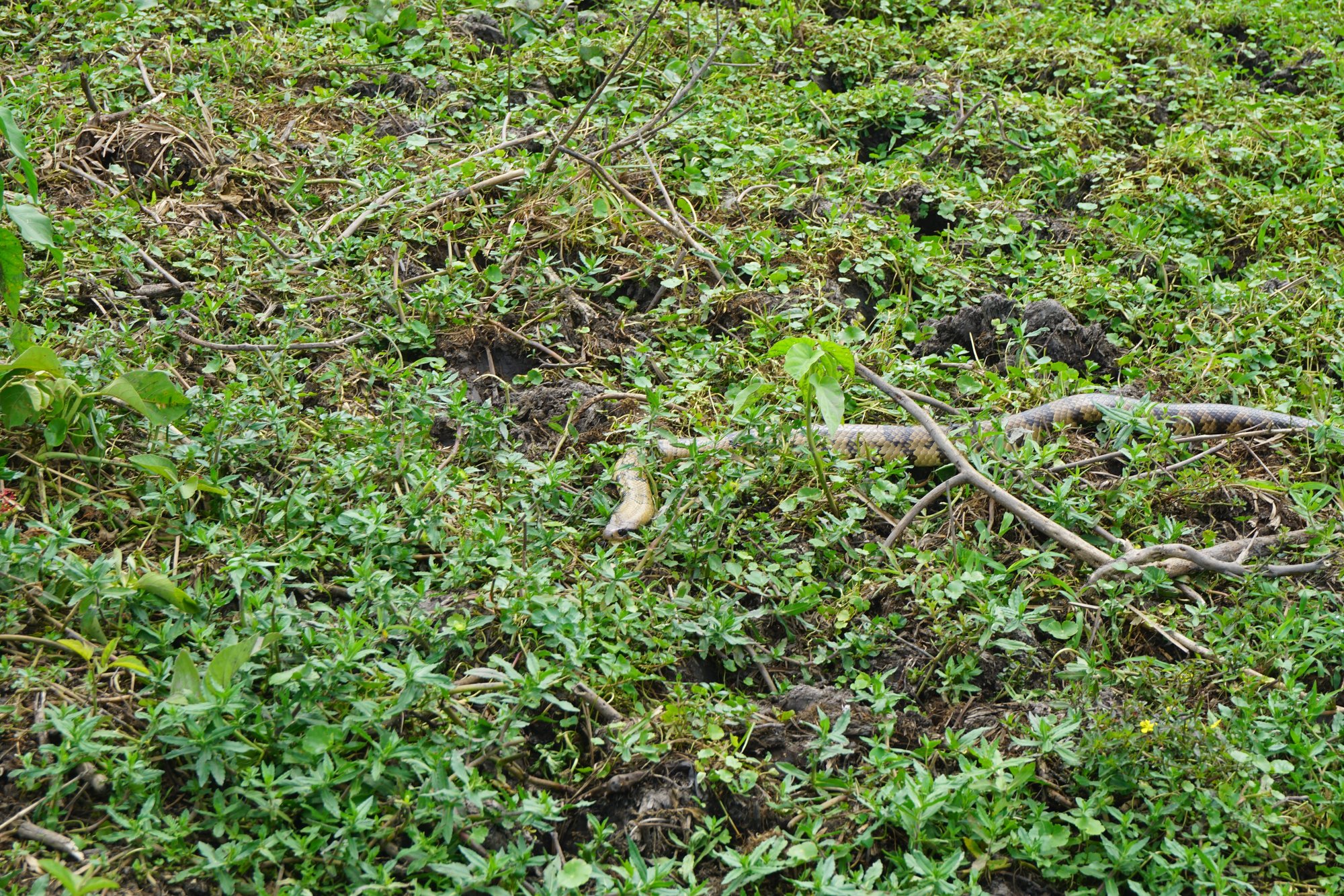 In de waterpoelen zien we opnieuw super veel kaaimannen. Het is echt ongelooflijk hoe goed deze beesten zich kunnen verstoppen, maar tijdens de tour worden we steeds beter in het ontdekken van de krokodillen. Na een paar uur wandelen zien we eindelijk een slang, yes! Het is helaas geen anaconda, maar een 'neppe cobra' zoals onze gids het noemt. De slang ziet eruit als de gevaarlijke cobra, maar deze slang is niet giftig. Toch houden we maar gepaste afstand. ;-)