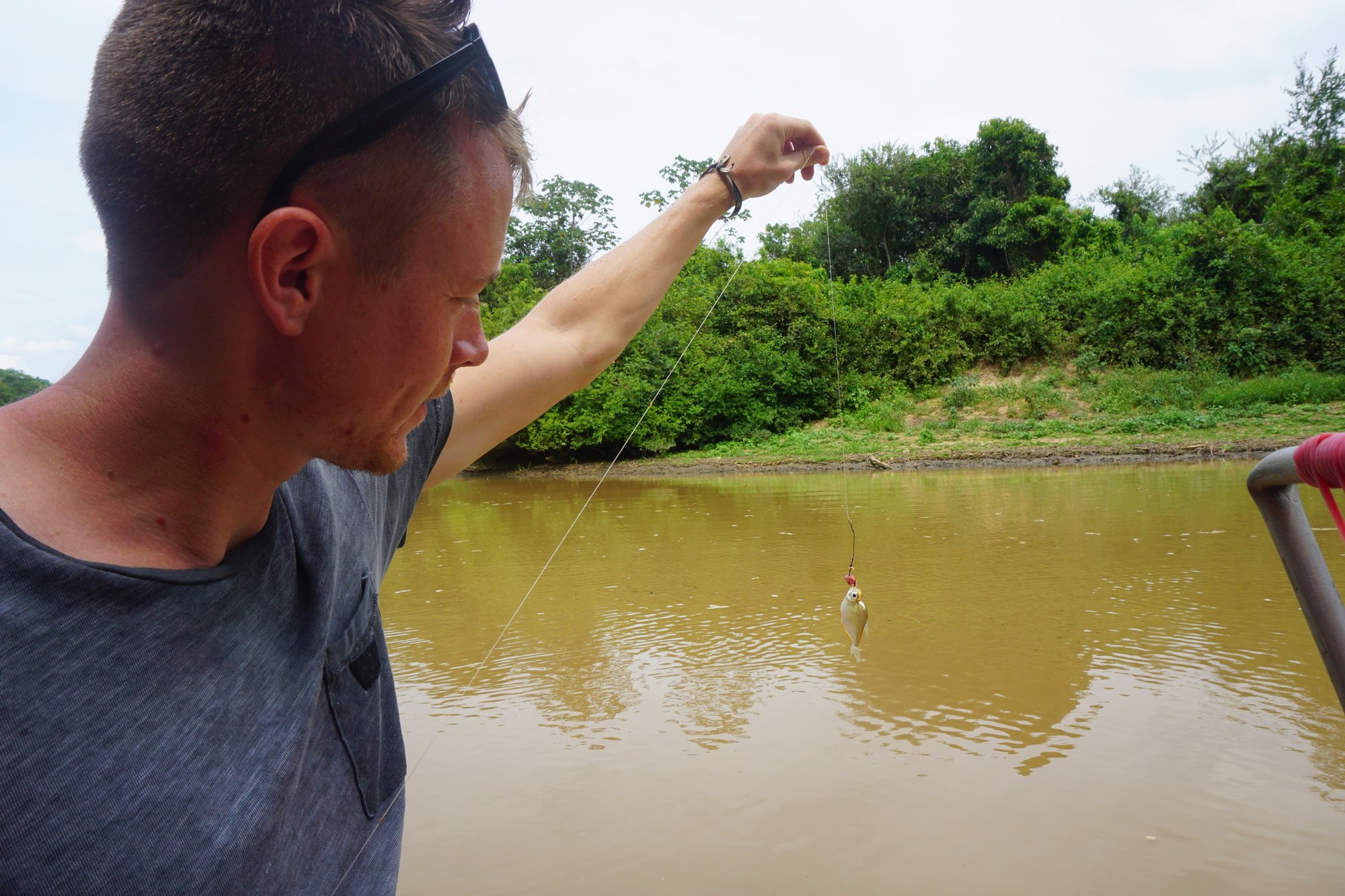 Na de lunch en een welverdiende siësta gaan we vissen. En niet zomaar vissen, nee we gaan piranha's vangen! Althans, dat is de bedoeling. Met een stukje vlees aan ons haakje is het veel misgrijpen. We voelen de piranha's wel knabbelen aan het vlees, maar ze zijn slim genoeg om niet in het haakje te bijten! Helemaal rustig staan we ook niet op de oever. Op enkele meters achter ons liggen de krokodillen in de bosjes en soms zwemt er eentje wel heel dichtbij langs. Bij één iemand uit de groep wordt het vlees aan zijn vishaak zelfs opgesmikkeld door een kaaiman!