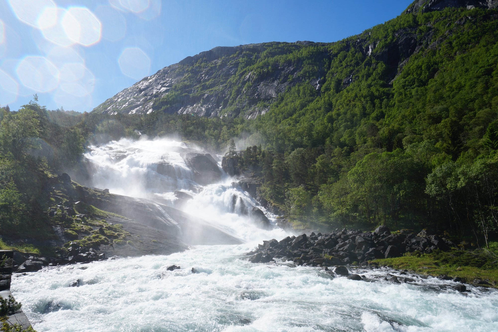 Na Tveitafossen blijkt het makkelijk inkomen klaar te zijn. Langs een grote pijp waar ze water doorheen laten stromen om elektriciteit op te wekken klimmen we over natte rotsen omhoog. Het duurt niet lang voordat we de volgende waterval alweer horen. Tussen de bomen door vangen we af en toe al een glimp op van Nyastølfossen. De twee watervallen liggen maar 1,2 kilometer uit elkaar, maar intussen zijn we wel 220 meter in hoogte gestegen.
