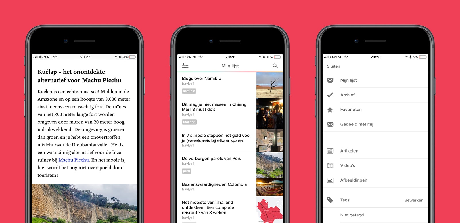 Voordat ik op reis ga, lees ik altijd onwijs veel artikelen en blogs over mijn bestemming. Nuttige informatie wil ik opslaan, maar ik wil niet constant een onoverzichtelijk mailtje naar mezelf sturen met daarin linkjes naar de artikelen. En ik wil ook tijdens het reizen – als ik geen internet heb – deze informatie kunnen checken. De app Pocket is hiervoor dé oplossing. In deze app kun je artikelen offline opslaan en taggen op onderwerp. Zo vind je alles wat je wilt bewaren makkelijk terug en kun je de informatie ook offline teruglezen. Dus: app downloaden en al die handige tips van Travly opslaan in je Pocket voor je volgende reis! ;-)