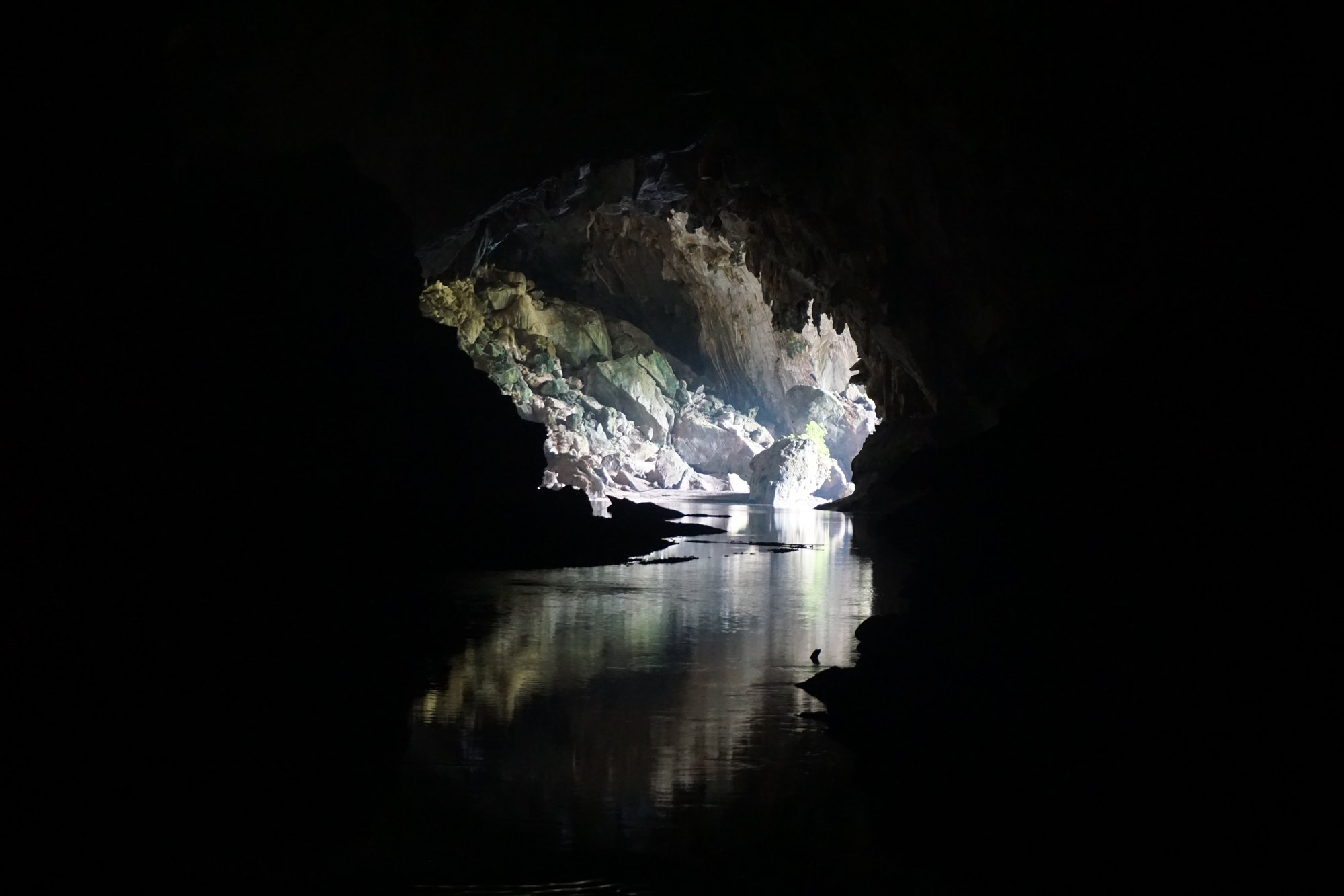 De Konglor grot is onwijs groot en er loopt een rivier doorheen, waardoor je met een bootje door de donkere grot kunt varen. Cool! Bij de ingang huren we een bootje met gids en 2 hoofdlampen, want anders zie je echt he-le-maal niks. Voordat we de grot inlopen komen we langs het felgroene water en de grijze karstbergen. Wauw!