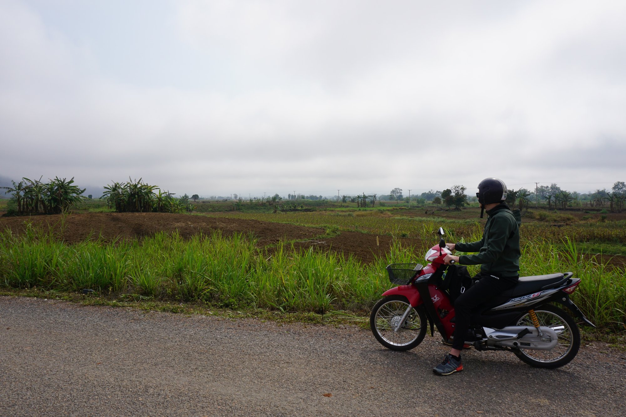 Toen we wakker werden, hebben we snel onze spullen gepakt om dit vieze kamertje te kunnen verlaten. Eenmaal buiten gekomen merken we dat het regent! Hmm, regen is echt niet fijn als je de hele dag op een scooter zit... Veel anders is er in Thakhek niet te doen en dus laten we ons toch afzetten bij één van de vele scooterverhuurders in de stad. Daar bestellen we in een restaurant nog even ontbijt, maar de 'French toast' blijkt hier uit de frituurpan te komen in plaats van de toaster. Blegh!