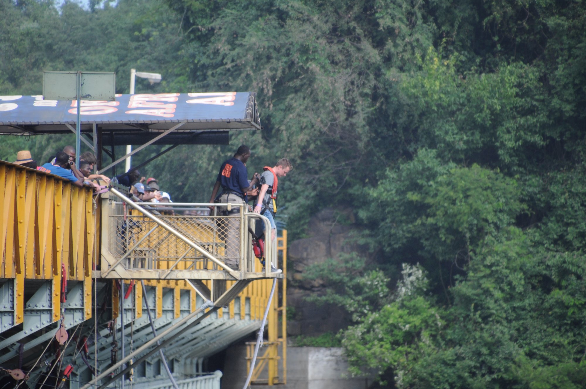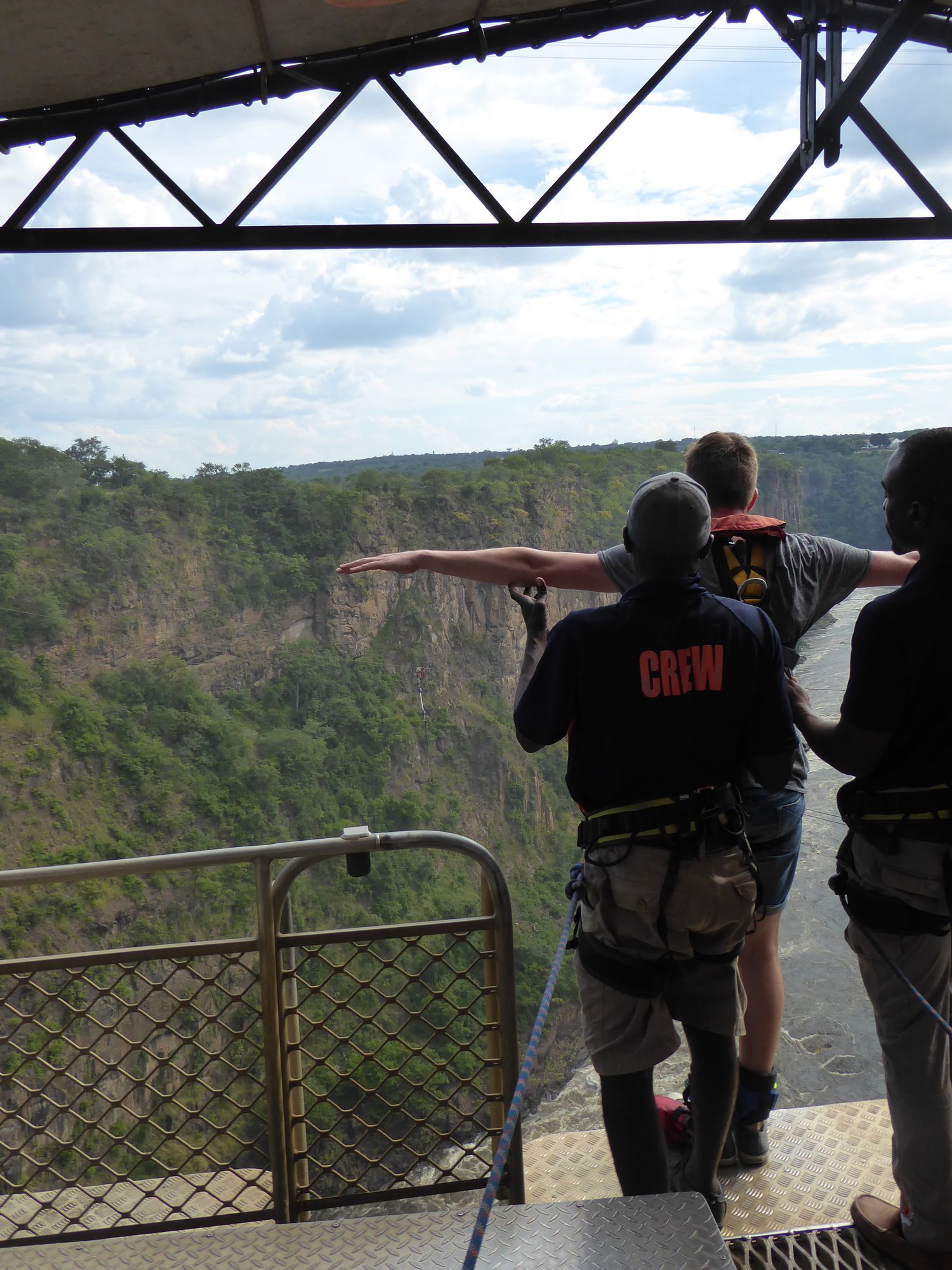 Na 10 minuutjes rijden komen we aan bij de grote brug. Net voor de brug worden onze paspoorten nog even gecheckt, omdat we officieel Zimbabwe hier verlaten. De brug ligt precies tussen de grens van Zimbabwe en Zambia. Na een korte briefing en het tekenen van de nodige papieren (altijd fijn als je moet tekenen dat je op de hoogte bent van de risico’s) lopen we naar het midden van de brug. We worden door de kijkende Afrikanen onthaald als helden. Ze klappen en iedereen van het groepje is druk met het geven van high fives. Ik kijk over de reling en zie iemand de sprong wagen. Wat een diepte! Veel tijd om het kunstje bij anderen af te kijken is er niet, want vrij snel wordt het nummer dat op mijn arm werd geschreven omgeroepen.