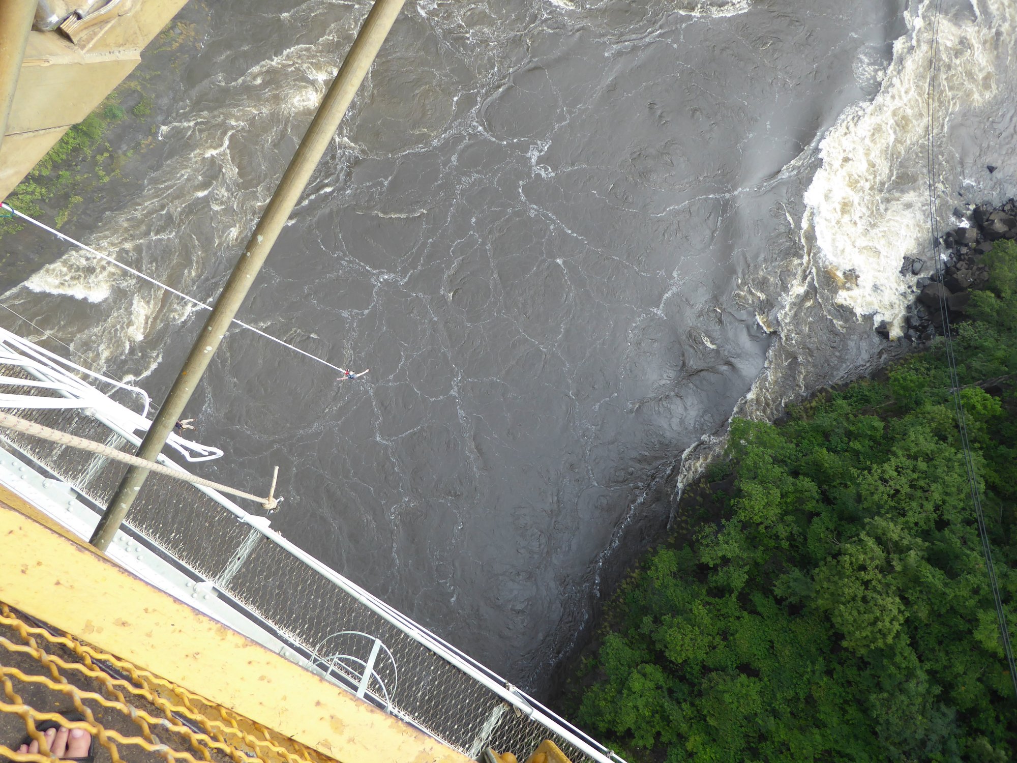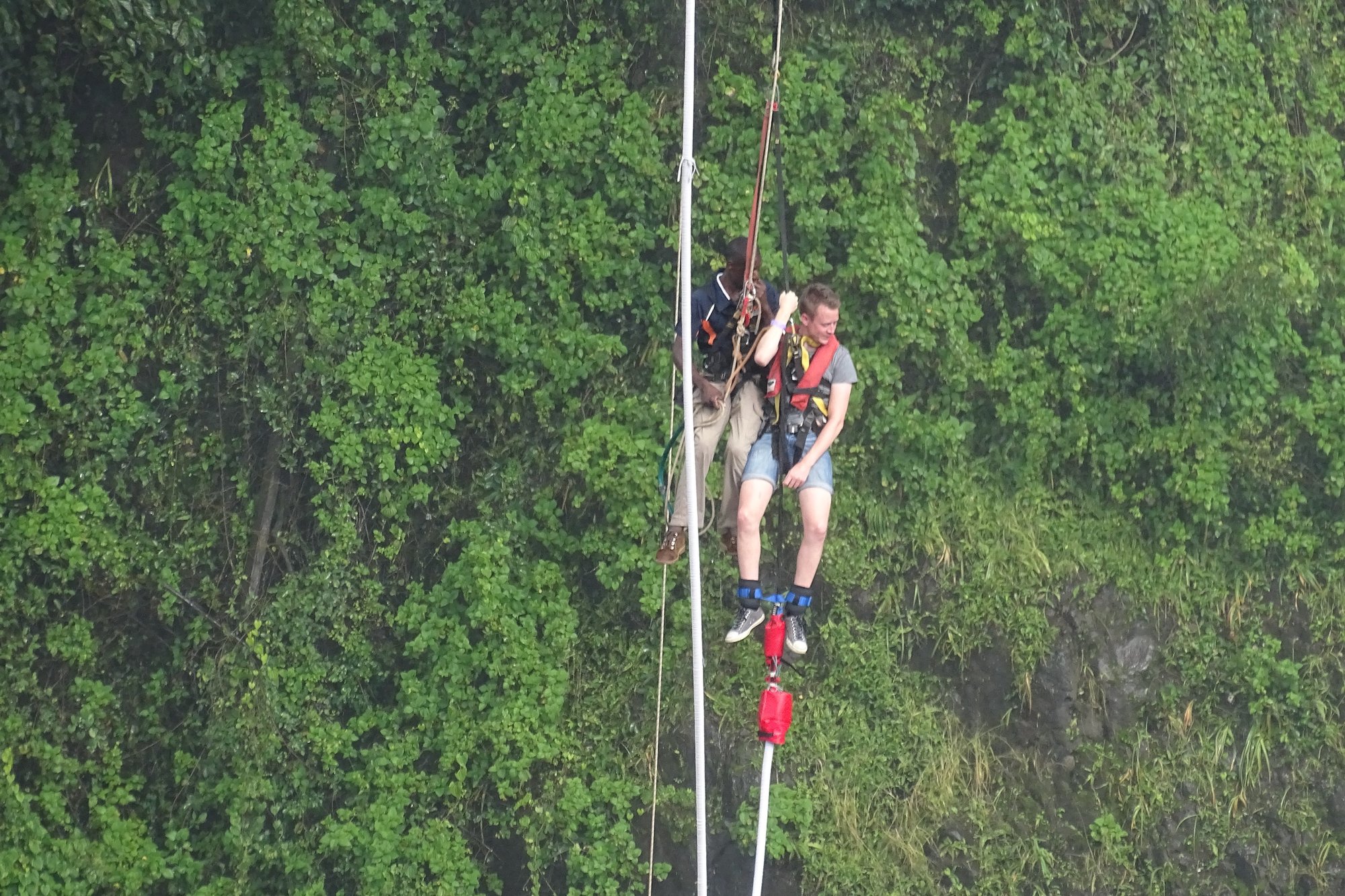 Ik voel me zo vrij als een vogeltje en zie de rivier heel snel op me af komen. Voor ik het door heb word ik weer door het elastiek omhoog getrokken. Wat een kick! Dit herhaalt zich een aantal keer en na enkele seconden bungel ik een beetje aan het elastiek. Ik zie een man aan een touw afdalen en hij steekt zijn hand naar me uit. Ik pak zijn hand en hij helpt me omhoog te komen. Even later worden we opgetakeld en komen we aan bij een stalen pad onder de brug. Ik koppel me vast aan de touwen aan de brug en klim een trapje op. Boven me hoor ik weer “one, two, three, bungee” en zie ik Djura voorbij vliegen. Wat een bikkel!
