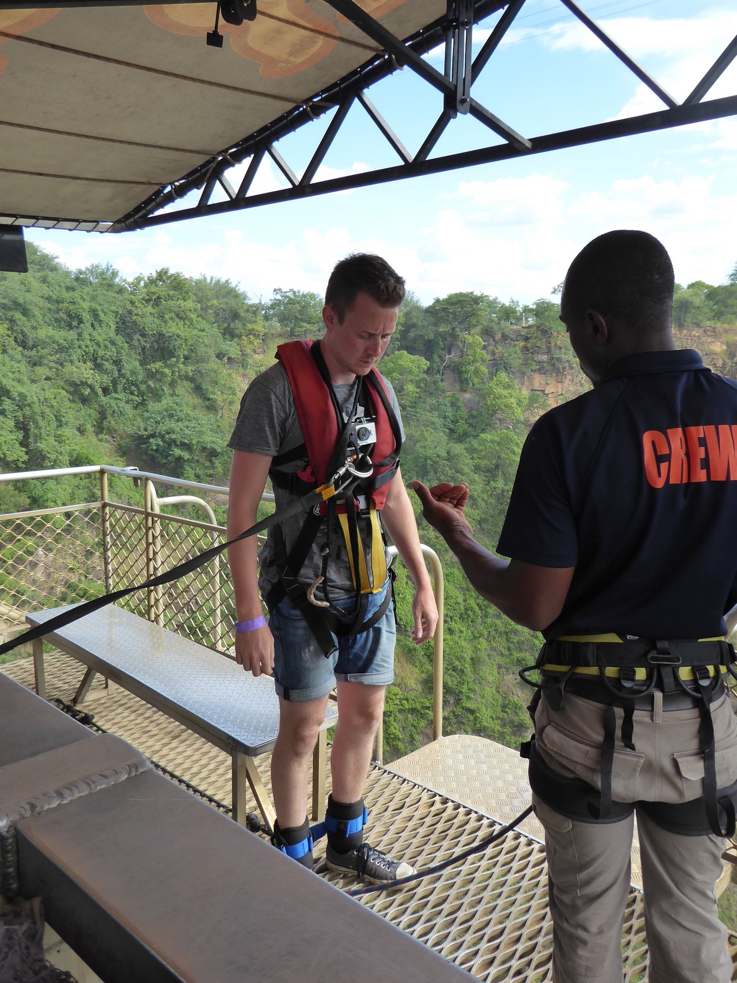 Snel doe ik het tuigje aan en trek alle koorden goed aan. Ik strik mijn veters extra strak en bind de action cam aan mijn borst. Ik ben er klaar voor! Enkele ogenblikken later betreed ik het stalen hokje aan de rand van de brug en moet op een bankje gaan zitten. Het elastiek wordt aan mijn benen vastgemaakt en hoewel ik er geen verstand van heb, kijk ik goed mee. Als ik vast zit mag ik gaan staan en wordt alles door twee personen gecheckt. “Yes, you’re good to go” en de Afrikaan wijst naar het plateautje.