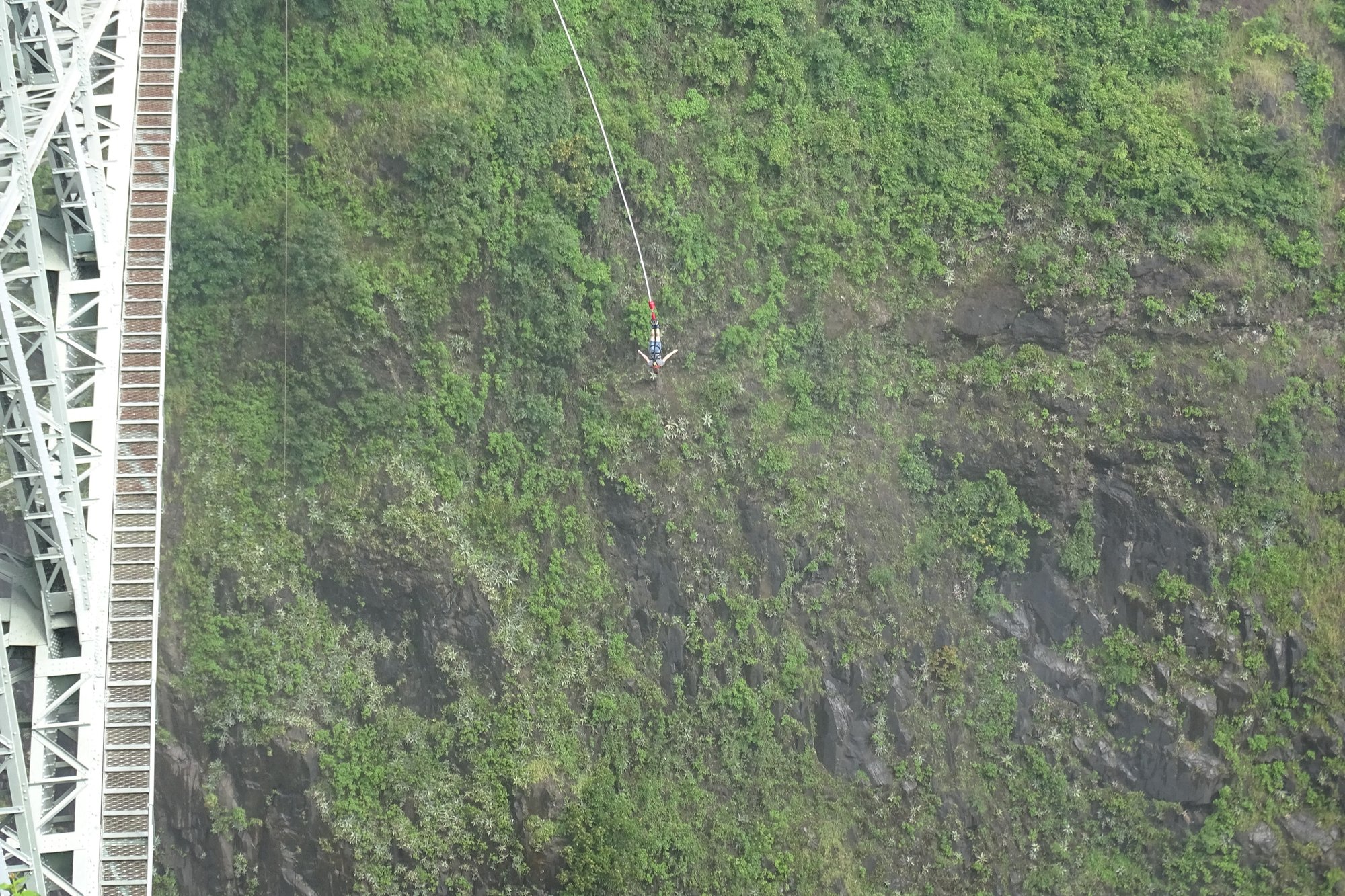 Met mijn samengebonden benen hink ik richting de afgrond. Ik sta met mijn tenen over de rand en spreid mijn armen. Ik hoor de gigantische waterval achter me kletteren en ik voel de nevelige wind. Wauw, dit voelt tof! Ik heb er enorm veel zin in. Dan roepen de mannen achter me “one, two, three, bungee”. Ik zet me af en spring vol enthousiasme de diepte in.