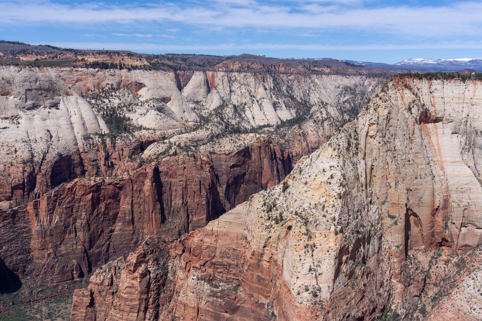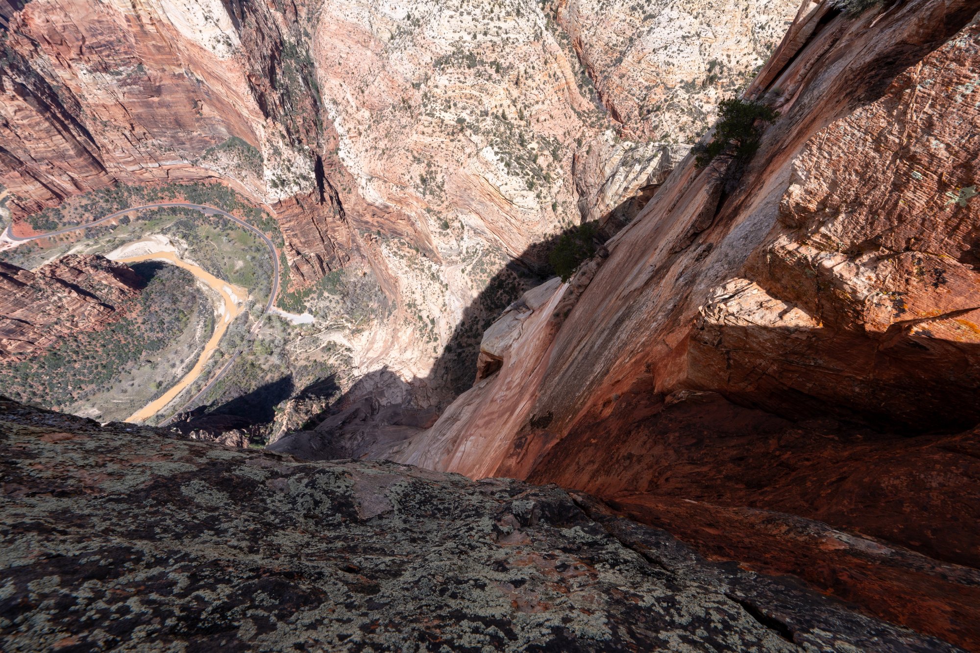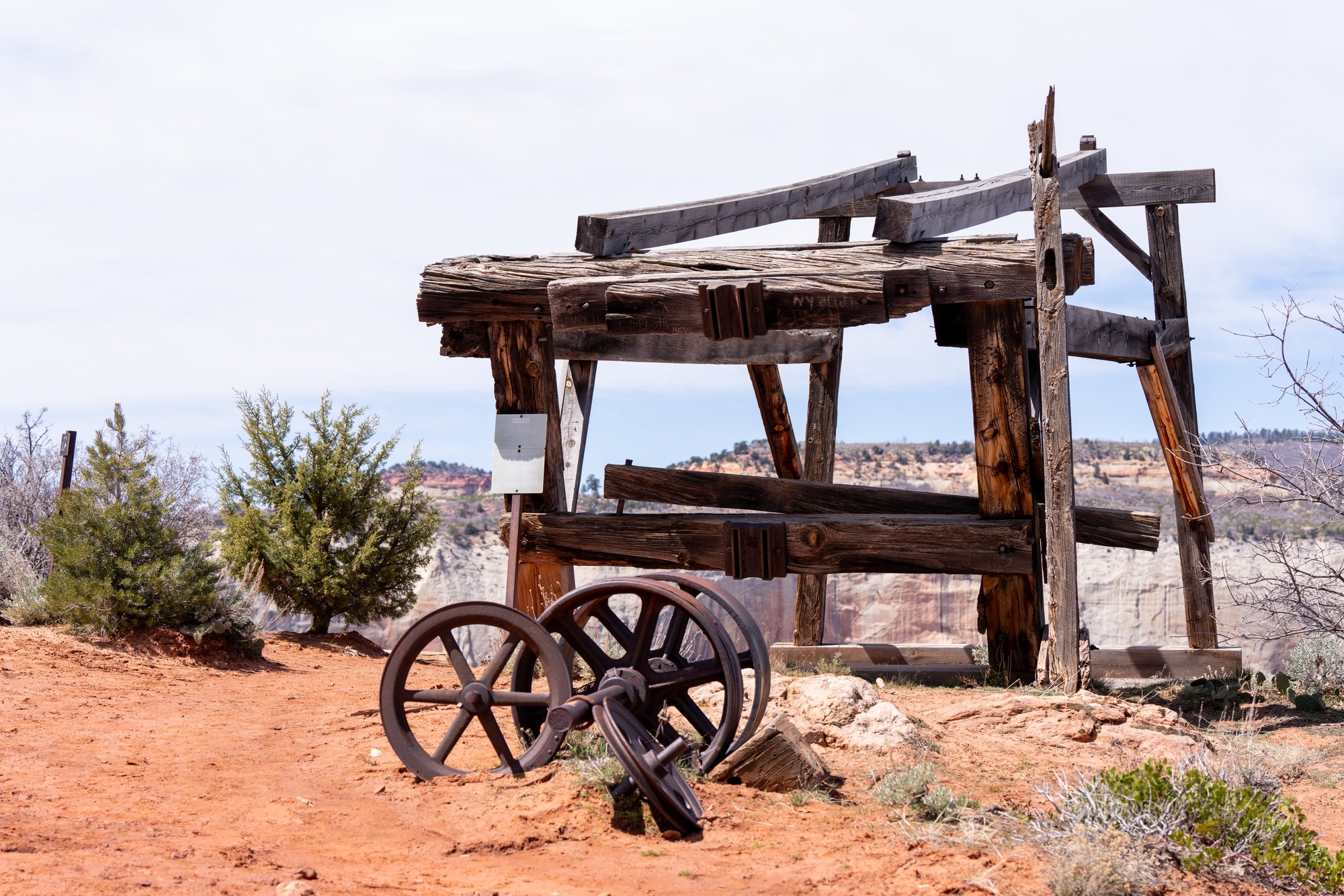 De oude stellage is uiteraard een blikvanger in het geheel. Via een bordje ontdekken we dat in het begin van de 20e eeuw met deze constructie goederen naar boven en beneden werden gebracht. Nu is de constructie oud en vervallen en word je gewaarschuwd om er niet op te klimmen of op te hangen. Tel daar het gegeven bij op dat er in 2019 een paar brokstukken vanaf Cable Mountain naar beneden vielen bij Weeping Rock en je weet dat je voorzichtig moet zijn bij de randjes. Maar ook zonder die gedachte boezemen de afgronden al genoeg angst in hoor. Ze gaan kaarsrecht naar beneden!
