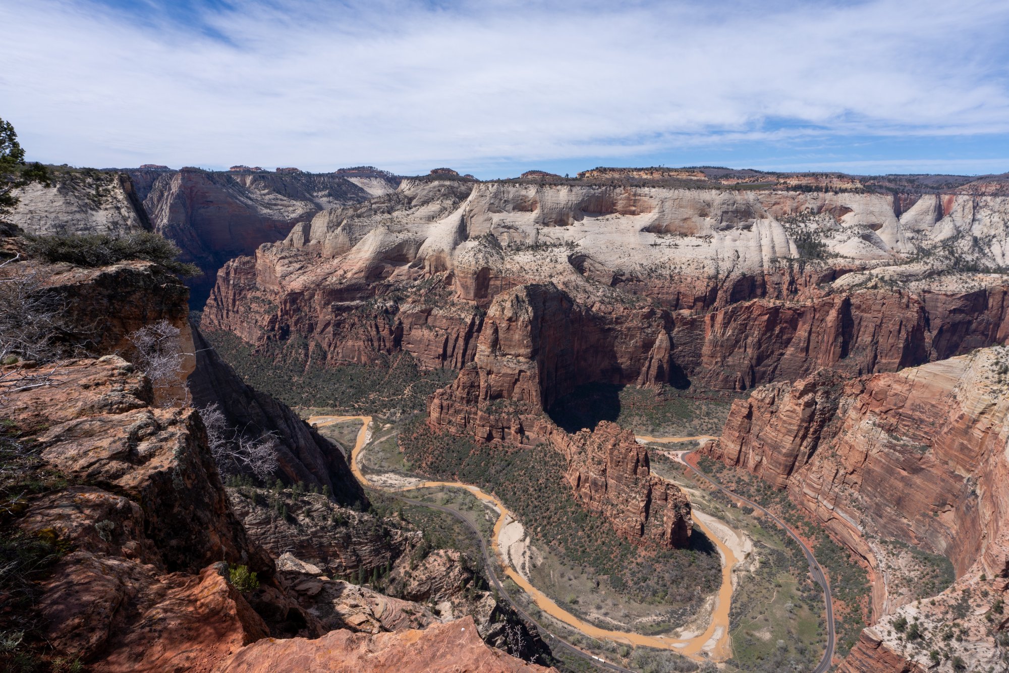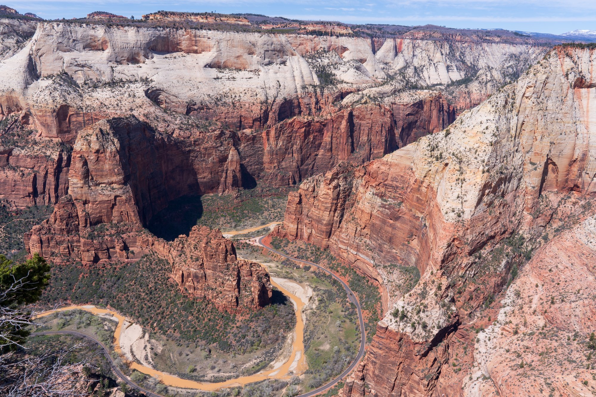 We kijken nu vanaf de andere kant dan Observation Point de Zion kloof in en hebben mooi zicht op de bocht in de rivier. We zien de weg door de canyon beneden met de beruchte shuttlebussen en natuurlijk kijken we ook weer op Angel’s Landing en zien we Observation Point - de plek waar we gisteren stonden - liggen.