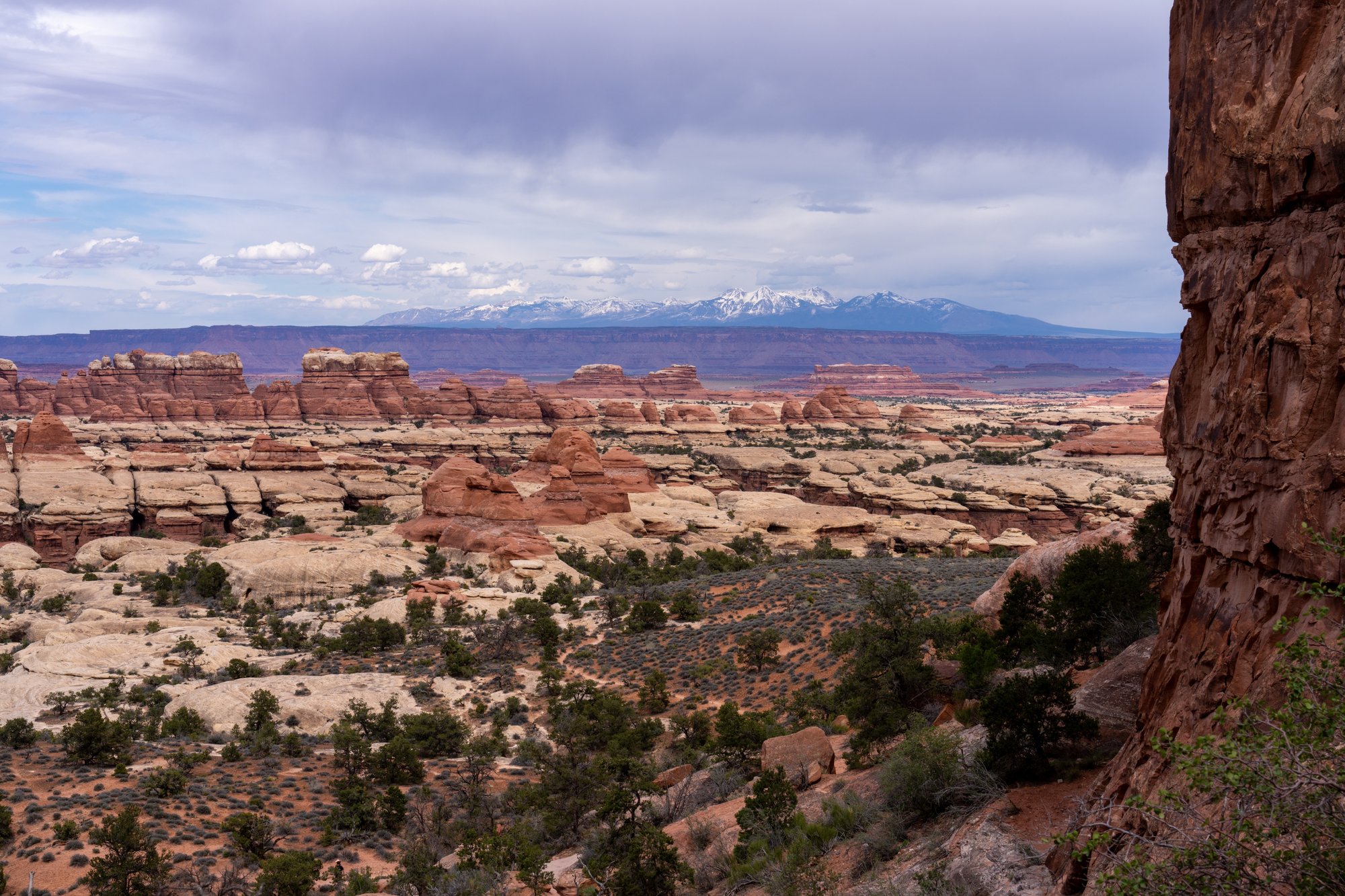 Vanaf het Chesler Park Viewpoint heb je zonder twijfel mooi uitzicht op de rotsformaties die dit gebied kenmerken. Ook de kleuren in de rotsen zijn tof en de besneeuwde bergtoppen in de verte (als we achterom kijken) zijn een leuk extraatje. Toch krijgen we niet het wauw-gevoel bij dit uitzichtpunt. Het grijpt ons niet helemaal. We vinden het leuk en mooi, maar zijn niet heel erg onder de indruk. Nou hoeft dat ook niet altijd. We hebben het wel goed naar onze zin samen, dat is het belangrijkste.