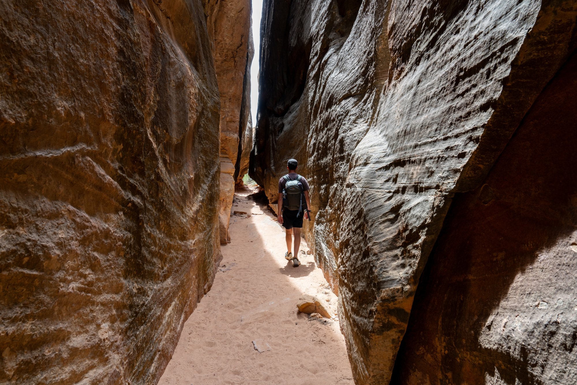 Vanaf deze picknickplaats begint de Joint Trail, het - volgens anderen - mooiste deel van de Chesler Park Loop. De Joint Trail begint met wat geklauter door smalle doorgangen en brengt ons dan in een lange slot canyon. Op sommige stukjes is de slot canyon heel smal en zien we boven ons slechts een dun spleetje daglicht. Een bijzonder en leuk gedeelte van deze hike! Het is sowieso een welkome afwisseling na zo’n 8 kilometer in een minder gevarieerd landschap.