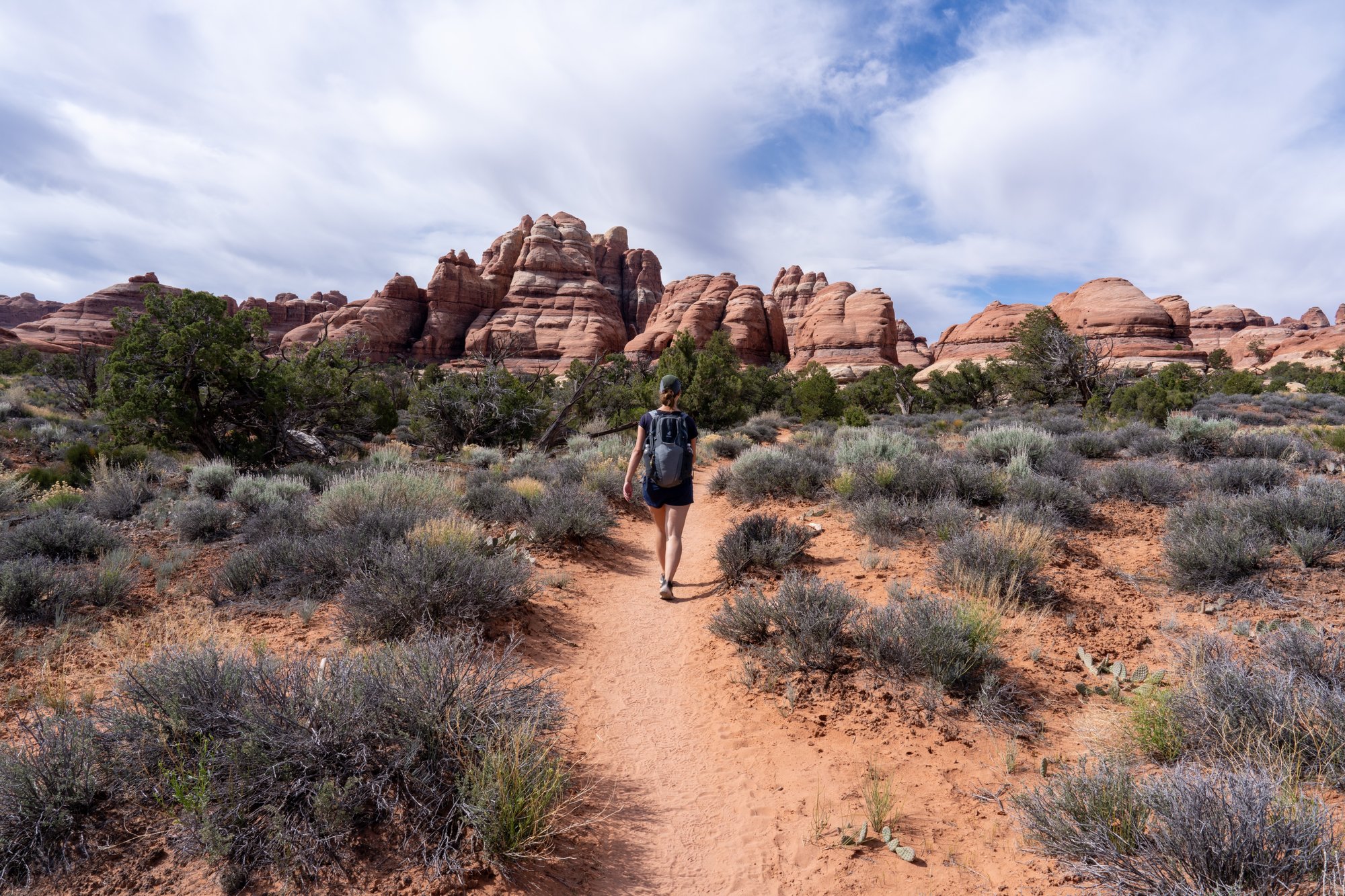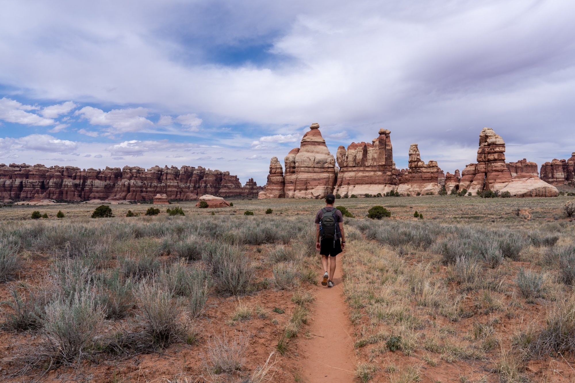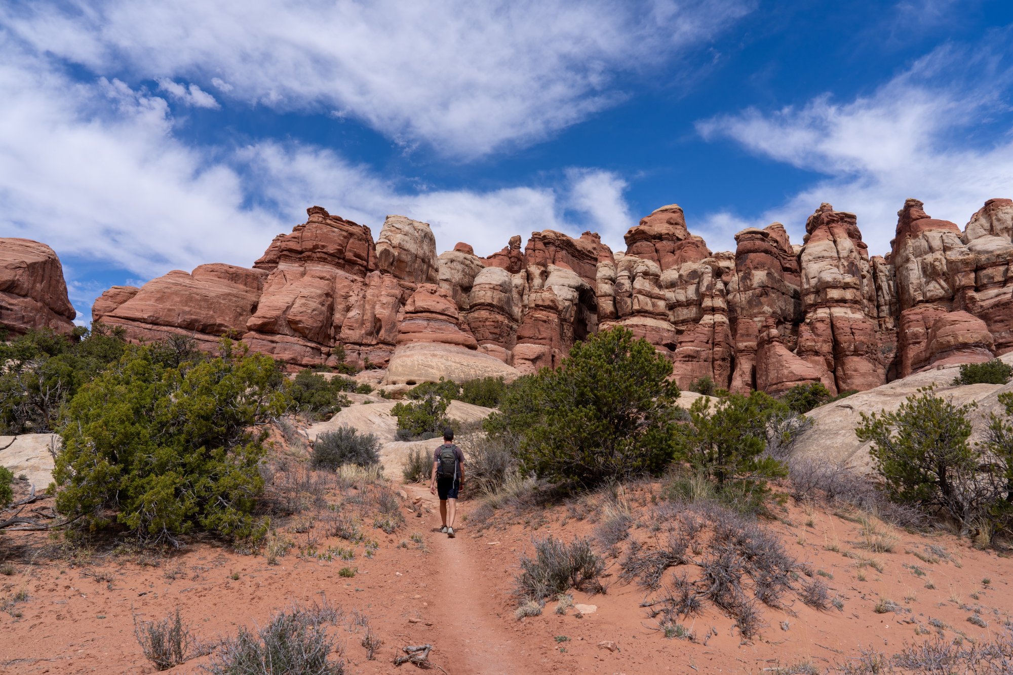 Er zijn twee populaire hikes in The Needles, namelijk de Chesler Park Loop in combinatie met de Joint Trail en de hike naar Druid Arch. Beide hikes zijn vrij lang en ze beginnen op hetzelfde punt, maar lopen na een tijdje uit elkaar. Omdat we een paar dagen later naar Arches National Park gaan en daar al genoeg bogen van rotsen gaan zien, kiezen wij voor de Chesler Park Loop.