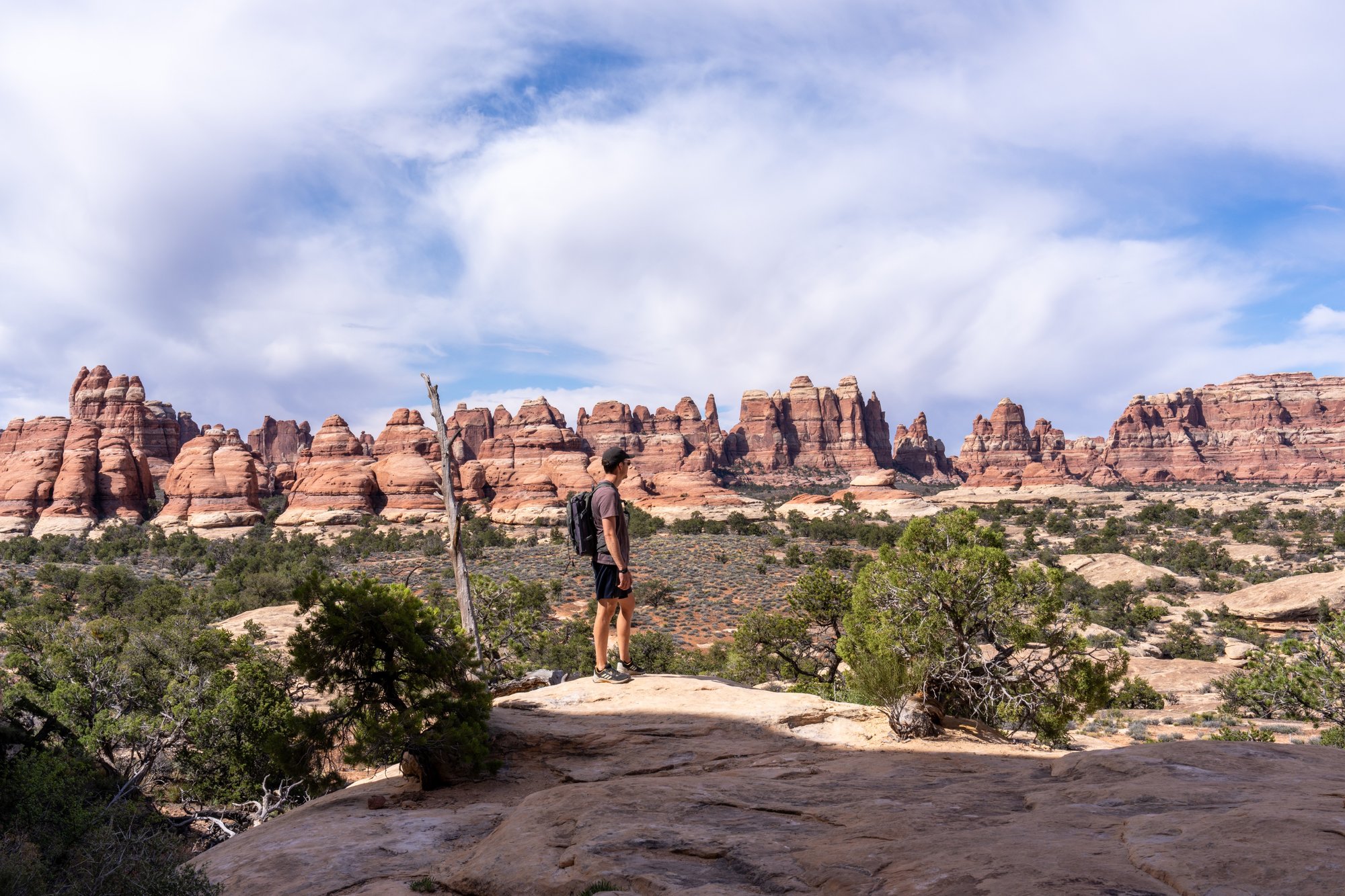 Het pad is veelal rotsachtig en regelmatig moeten we een grote stap omhoog of naar beneden zetten. Het is best intensief, zeker als je daar de sterke zon en de warmte bij optelt. Toch proberen we de pas erin te houden, want we hebben nog heel wat kilometers voor de boeg. Het laatste stuk tot Chesler Park Viewpoint is opnieuw een flinke klim, maar daarna worden we wel beloond met een uitzicht over The Needles.