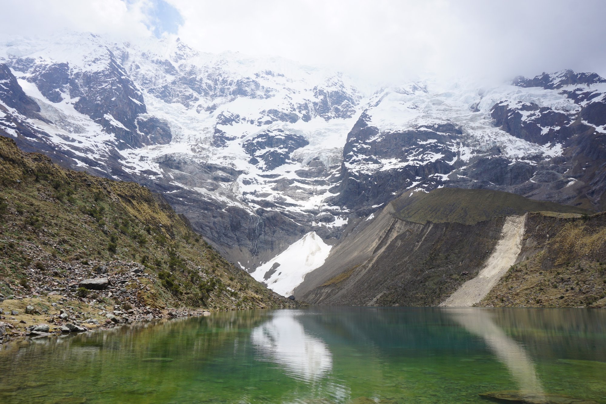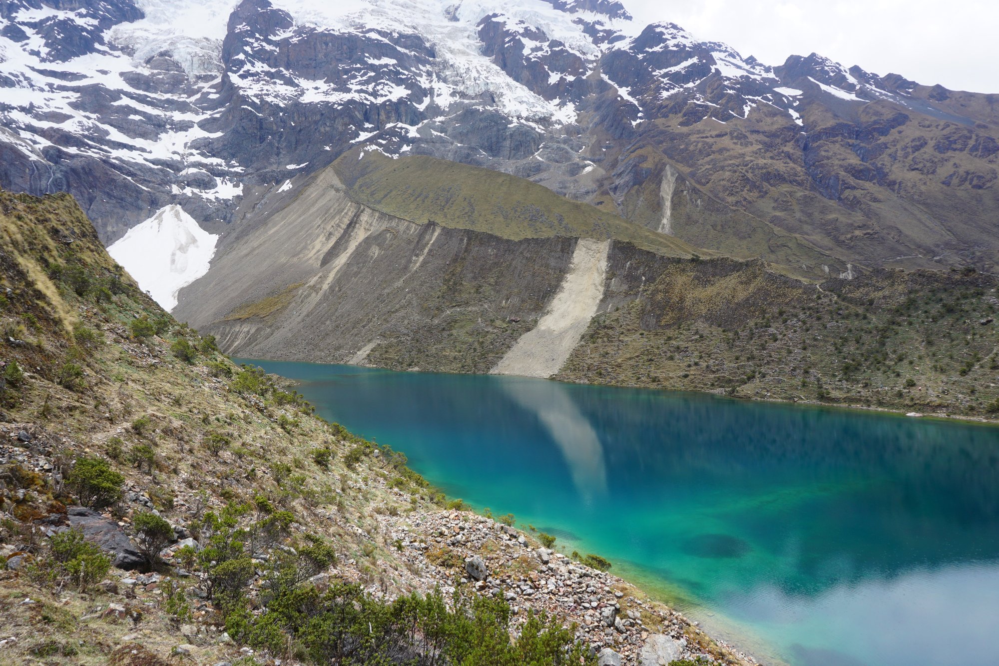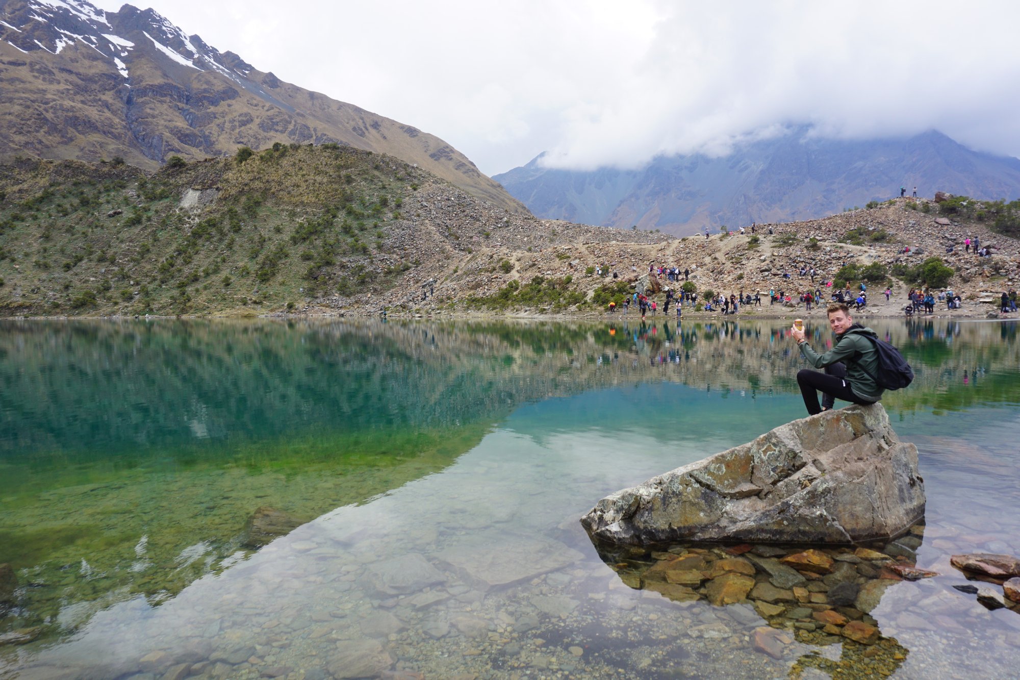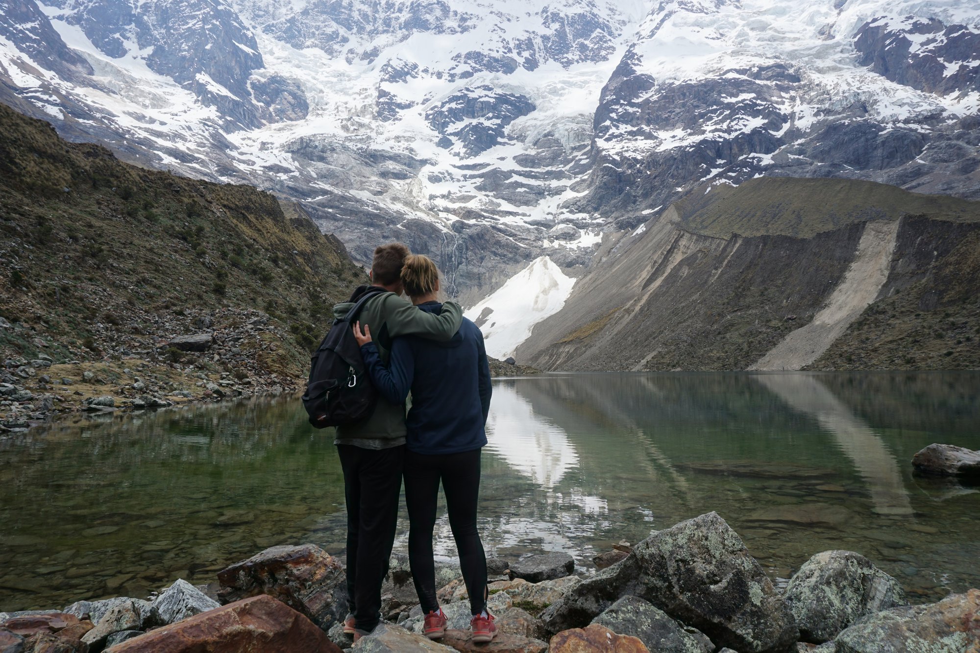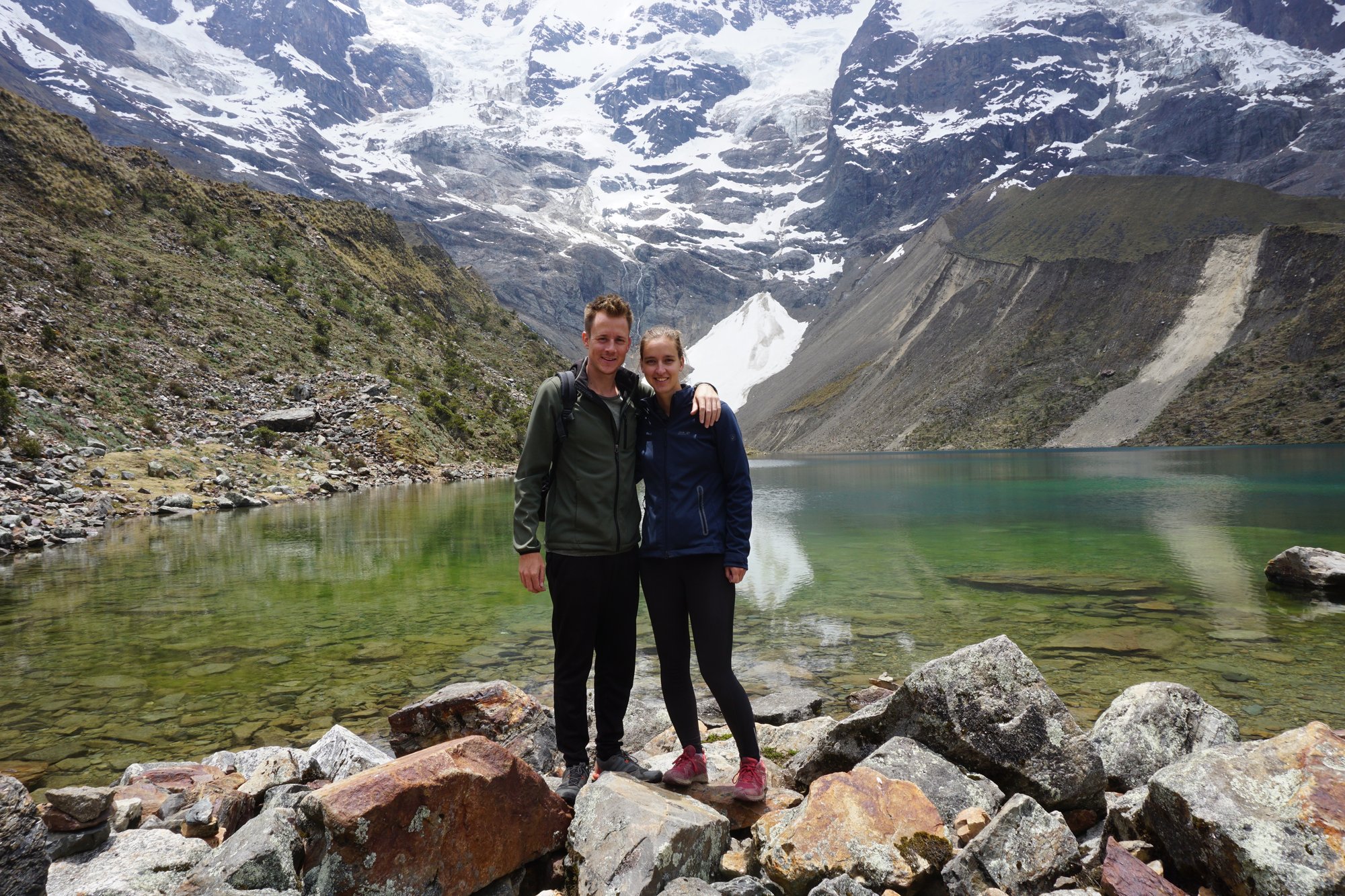 Ronny heeft gelukkig geen last van de hoogte en kan wat makkelijker omhoog lopen. Een klein stukje draagt hij mijn tas, zodat ik even wat vrijer kan hiken. Fijn! Na ongeveer 1,5 uur hiken bereiken we het Humantay Lake, yes! We hebben het toch maar mooi gedaan. Het water is onwijs helder en de gletsjer en besneeuwde bergtoppen achter het meer maken er een schitterend totaalplaatje van. Tijd om een plekje te zoeken op de rotsen om even te zitten en uit te rusten. Want helemaal lekker voel ik me niet. Ik voel een druk op mijn borst en ben een beetje misselijk. Gek dat ik nu toch last heb van de hoogte, want we zijn afgelopen weken al wel tot 4.800 meter geweest...