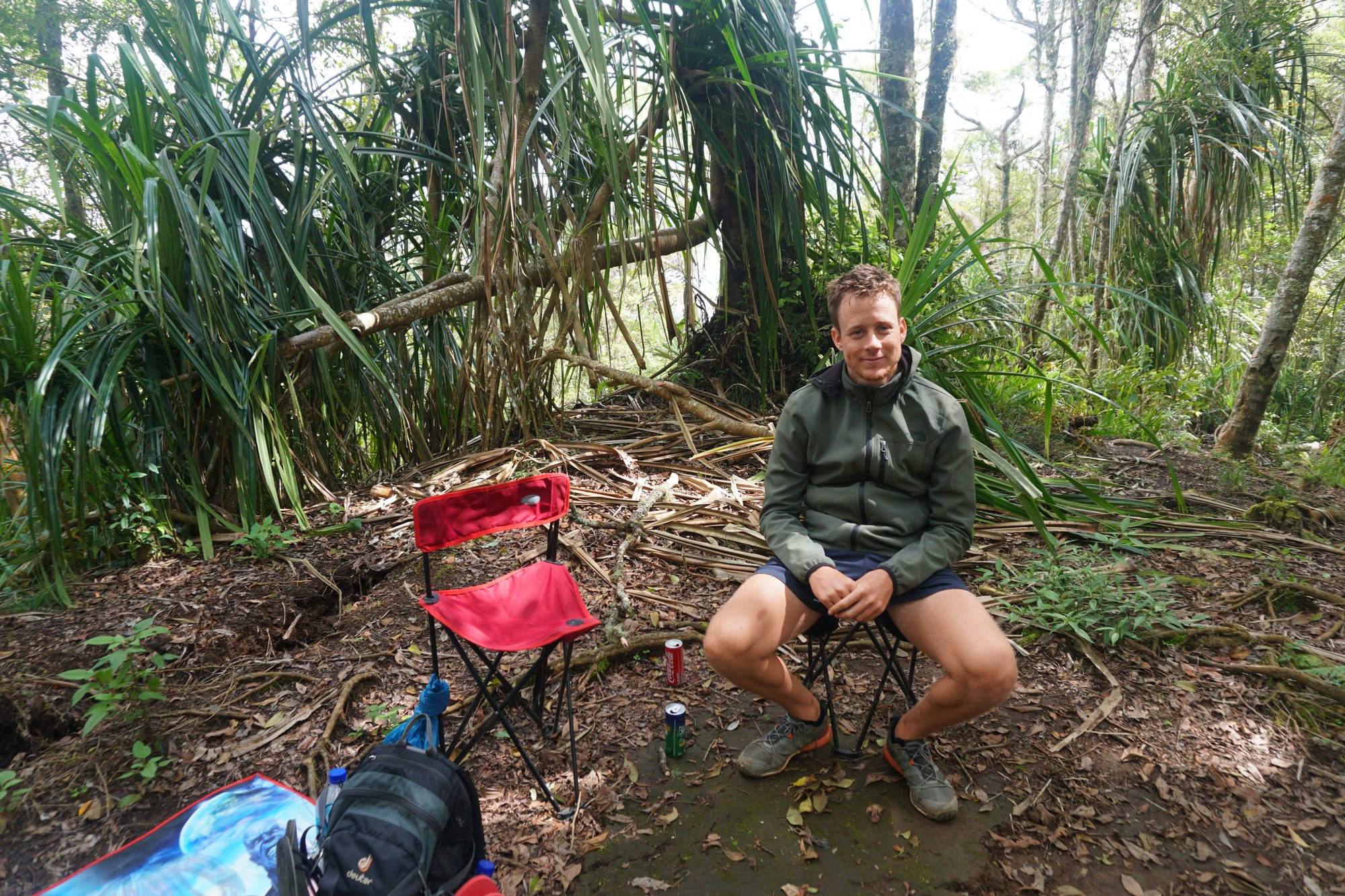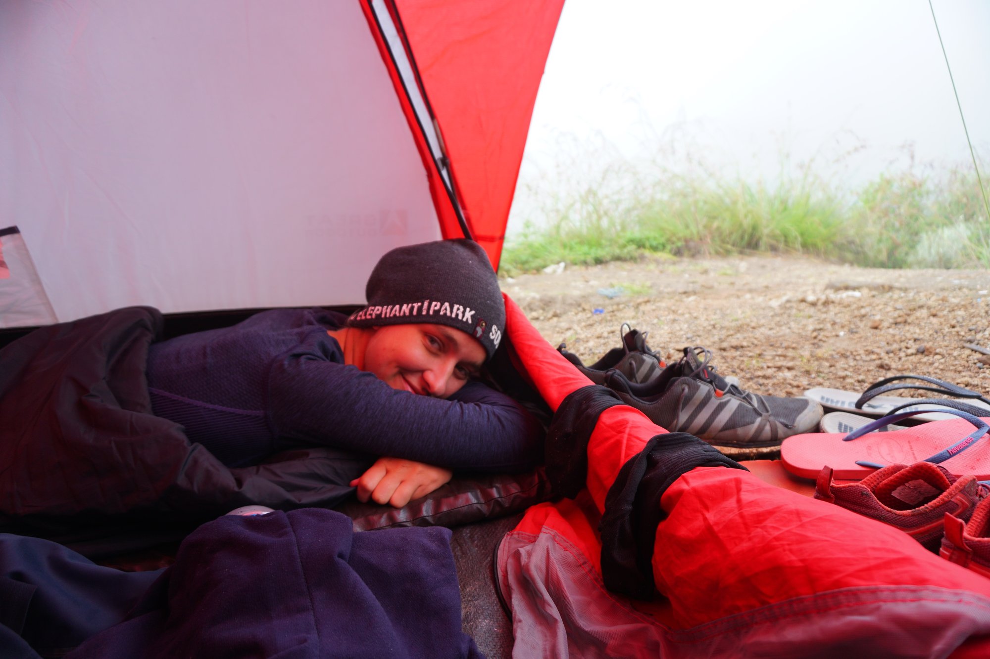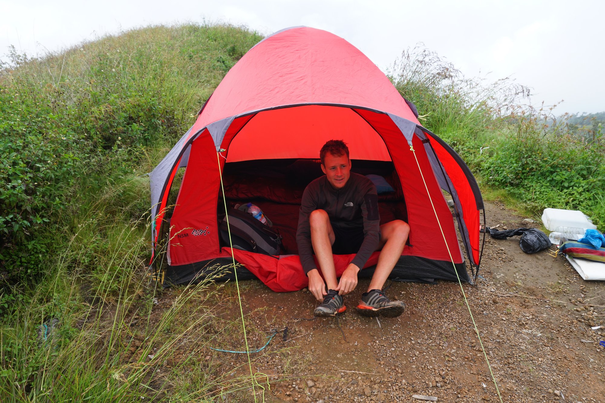 Helaas wil het maar niet opklaren. We zijn inmiddels behoorlijk doorweekt en doordat we steeds hoger zitten, is de temperatuur veel minder hoog. Als je stil zit, krijg je het snel koud en dus gaan we na een kwartiertje rusten maar weer door. Het laatste stuk tot de campsite is steil en het pad is brokkerig. Door de aanhoudende regen stroomt het water inmiddels over het pad naar beneden en hebben we een behoorlijk zwembad in onze schoenen. Het is doorbijten nu. 1 uur en 10 minuten na ons vertrek bij Pos 3 zijn we er: de campsite!