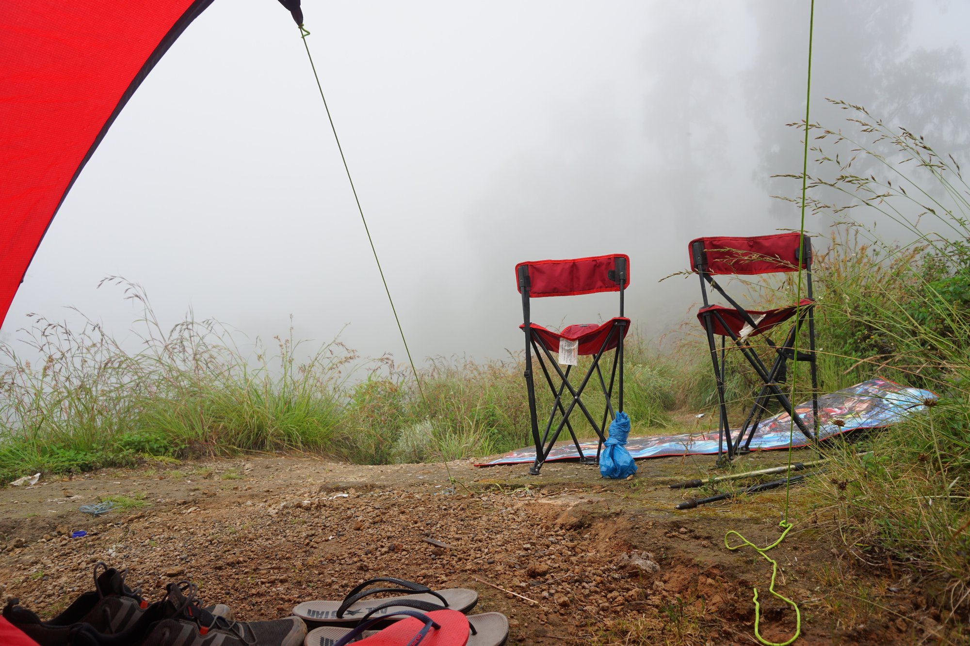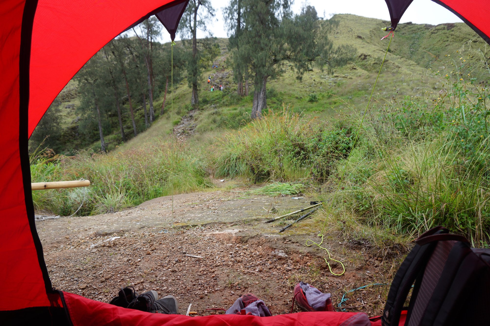 Onze gids stelt voor om niet óp de kraterrand te slapen, maar net iets eronder. Mocht er dan een aardbeving komen, dan schuiven we in ieder geval niet met ons tentje en al de krater in. Hoewel andere tourbedrijfjes hun gasten gewoon op de kraterrand laten slapen - het uitzicht is daar natuurlijk mooier - vinden wij het juist goed dat zij veiligheid voorop stellen. In een half uurtje kunnen wij vanaf onze tent ook op de kraterrand zijn. Helaas is het weer zo slecht die middag dat het geen zin meer heeft om naar de kraterrand te klimmen voor de zonsondergang. Het zit zo dicht dat we het kratermeer toch niet zouden zien en onszelf alleen maar vermoeien zonder daar iets voor terug te krijgen. In de ochtenden is het vrijwel altijd helder op de Rinjani vulkaan, dus we zorgen dat we er met zonsopkomst wél zijn.