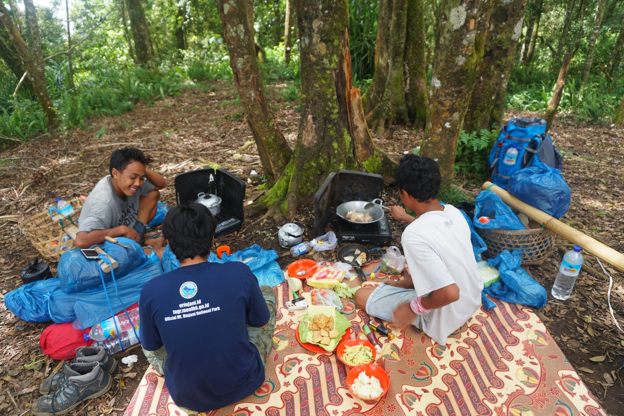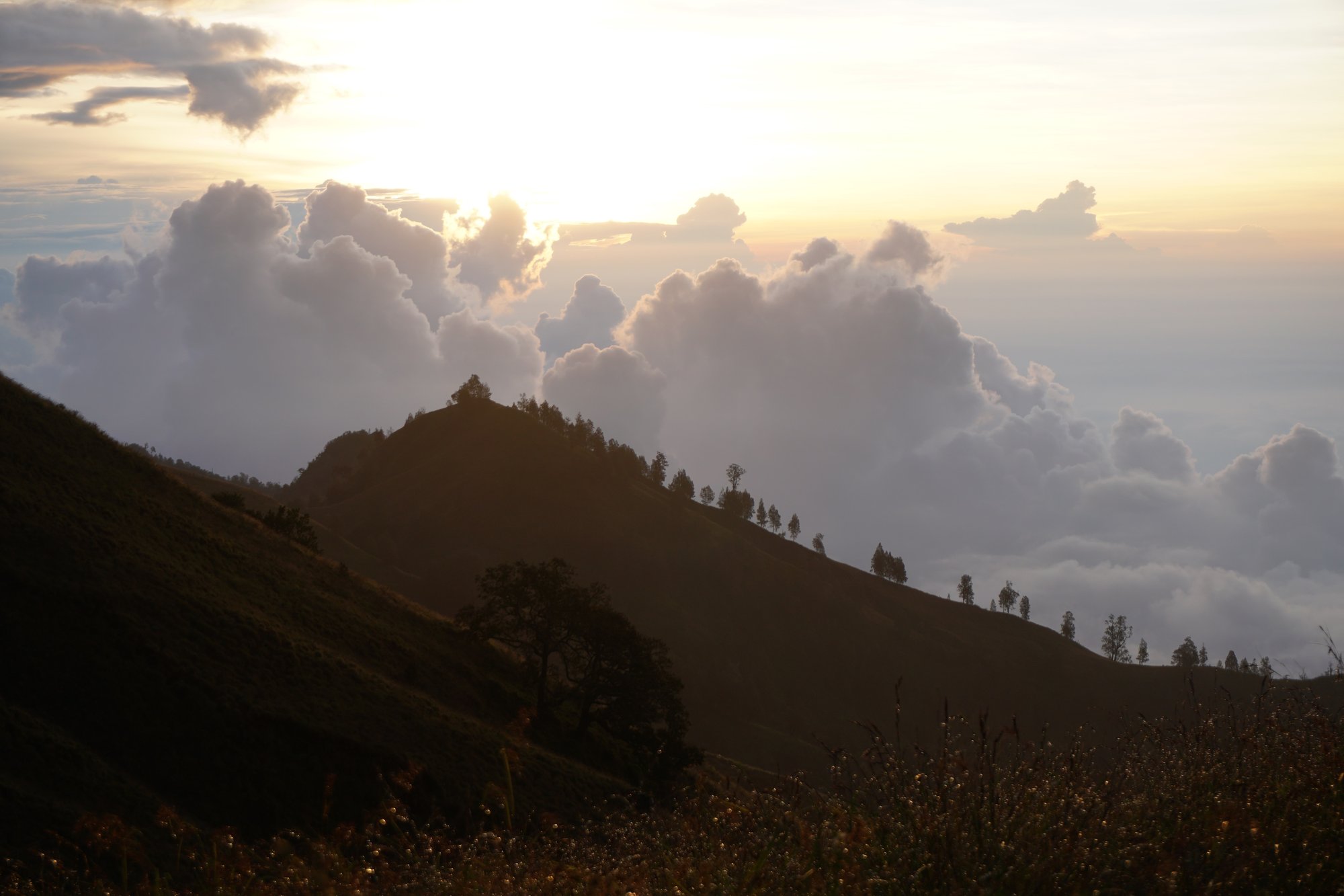 Wederom worden we goed verwend door onze gids en de dragers. In de middag krijgen we gebakken banaan als snack en als avondeten hebben ze een lekkere curry gemaakt. En precies als de zon bijna ondergaat, klaart het eventjes op op de Rinjani vulkaan. Het zorgt voor een prachtig uitzicht. We zijn boven de wolken! Met een tevreden gevoel duiken we op tijd onze tent in. Morgen moeten we weer vroeg in actie komen!