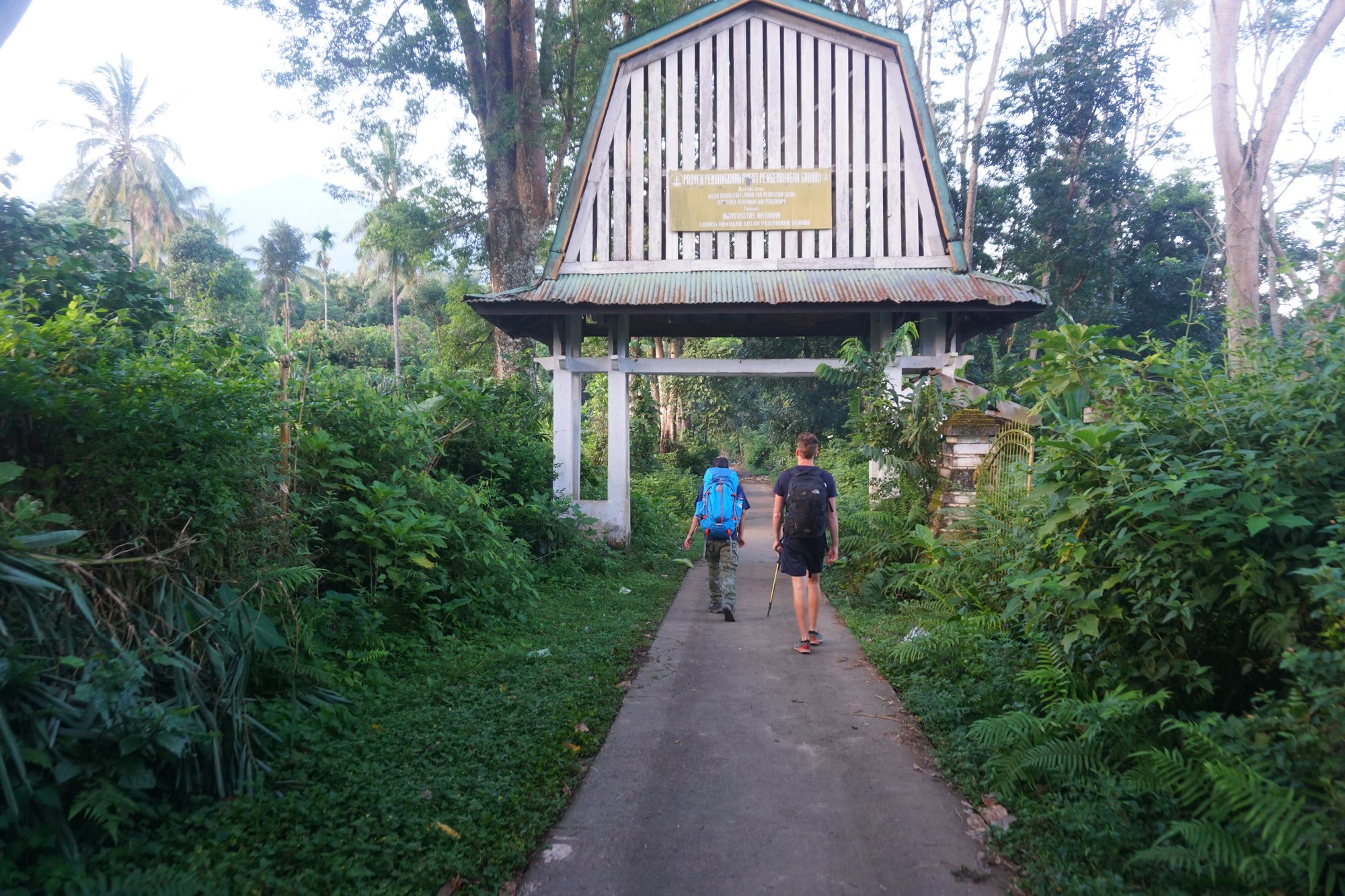 Als we na een ritje van 3 minuten uit de auto stappen, is het niet even rustig inkomen. Het pad gaat vrij steil omhoog. We zijn begonnen! Rond 7:15 uur komen we bij de officiële toegangspoort naar het nationaal park, maar het ziet er nu allemaal vrij vervallen uit. Onze gids Hendri vertelt ons dat de overheid de ingang na de vorige aardbeving van half maart had gebarricadeerd, maar dat de locals de barricade hebben weggehaald. Zonder tours naar de Rinjani hebben de bewoners van Senaru geen inkomsten en het belang om de vulkaan op te gaan is voor hen groot. Helemaal officieel open is deze wandelroute dus blijkbaar niet... Ik kan het niet helpen dat ik het eerste half uur van onze hike in mijn hoofd bezig ben met de risico's en niet met genieten. Het zou natuurlijk wel heel toevallig zijn (en heel erg pech hebben) als er precies nu een aardbeving komt als wij op de vulkaan zijn, maar toch.