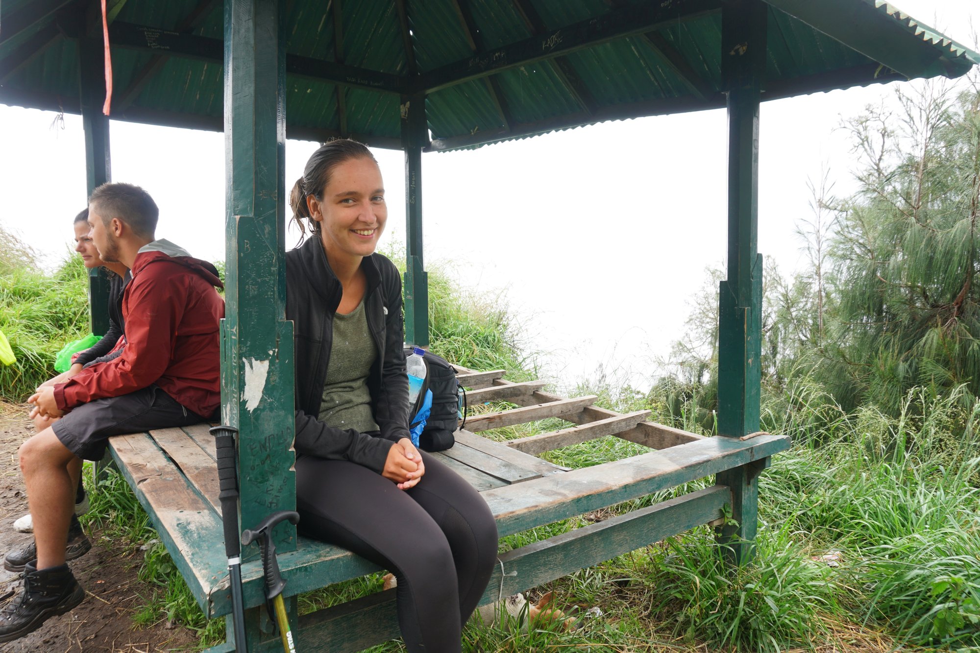 Na een lange lunchpauze vertrekken we iets voor half 12 weer. Als we weglopen, begint het zacht te regenen. Een beetje regen is niet zo erg. Maar we zijn nog geen 10 minuten verder en het komt echt met bakken uit de lucht. Zelfs het dichtbegroeide bos waar we in lopen geeft nu geen beschutting meer. Naar Pos 3 is het weer flink klimmen en door de regen is het op sommige delen extra glibberig. Het is een pittig stuk en we zijn dan ook blij als we na 5 kwartier hiken aankomen bij Pos 3 waar we even rust nemen.