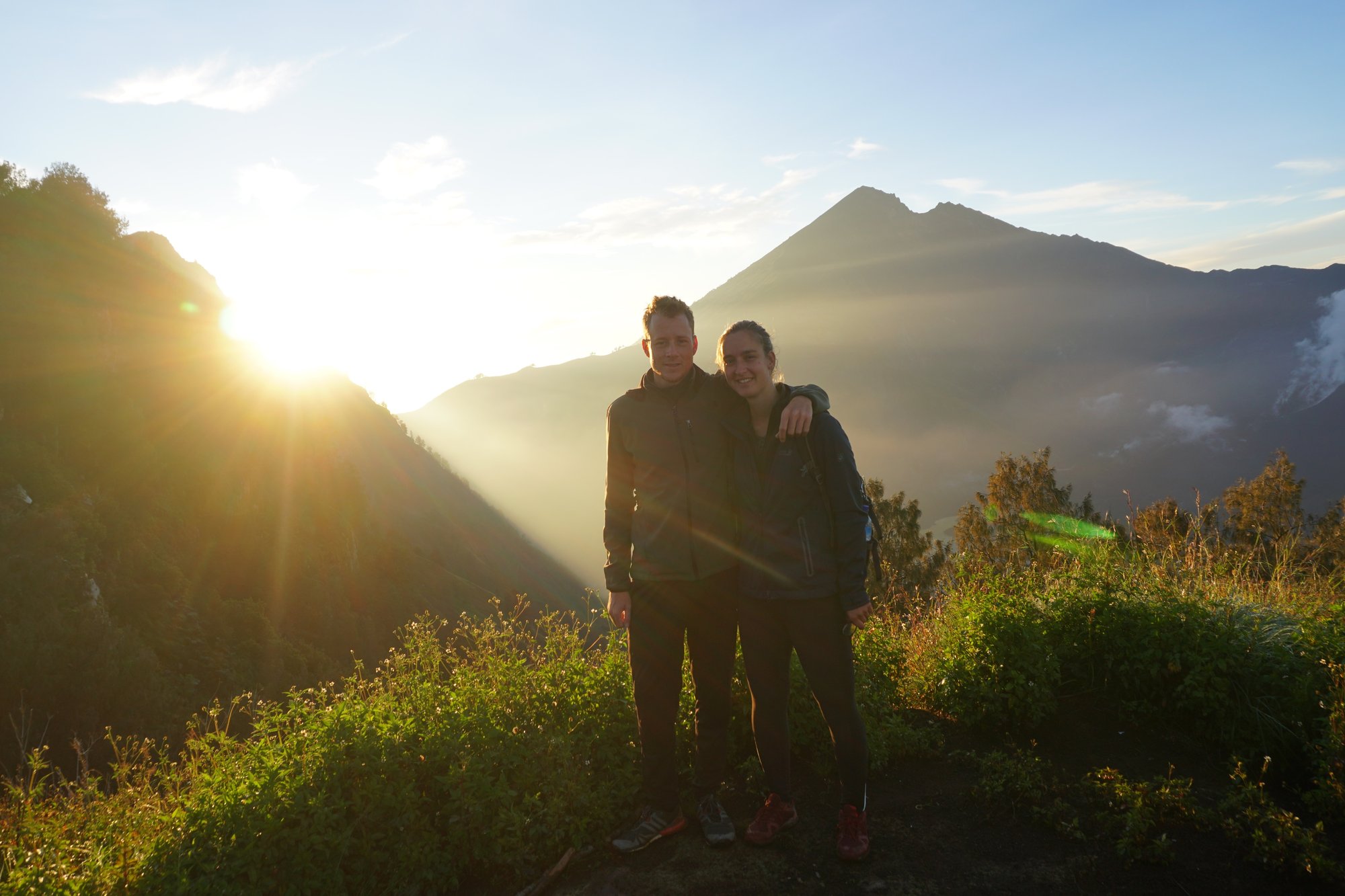 De zon komt vroeg op in Indonesië, al rond 6:15 uur 's ochtends. Hendri staat dus al vroeg bij onze tent om te zeggen dat het tijd is om wakker te worden. Het is een korte maar steile klim tot de kraterrand, maar dan heb je wel wat. We zien de top van Rinjani, het kratermeer met wat wolken die erin hangen en de rokende Barujari vulkaan die in het kratermeer ligt. Langzaam komt de zon op en wordt het landschap meer en meer verlicht. Dít is waar we gisteren de hele dag voor hebben gewerkt!
