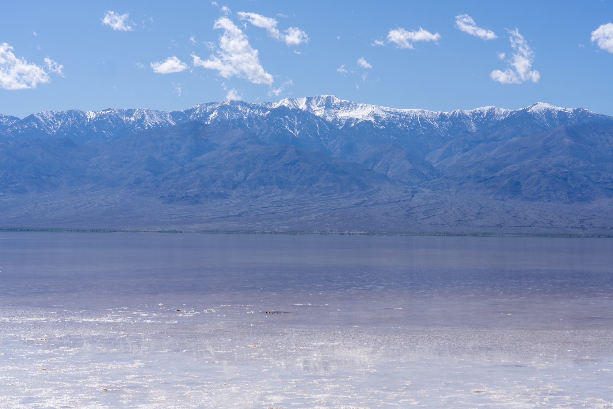 Achter het Badwater Basin liggen bruine bergen met nog wat sneeuw op de toppen. Bizar om te zien, want wij smelten bijna weg in de middaghitte van Death Valley. Het contrast kan haast niet groter zijn!
