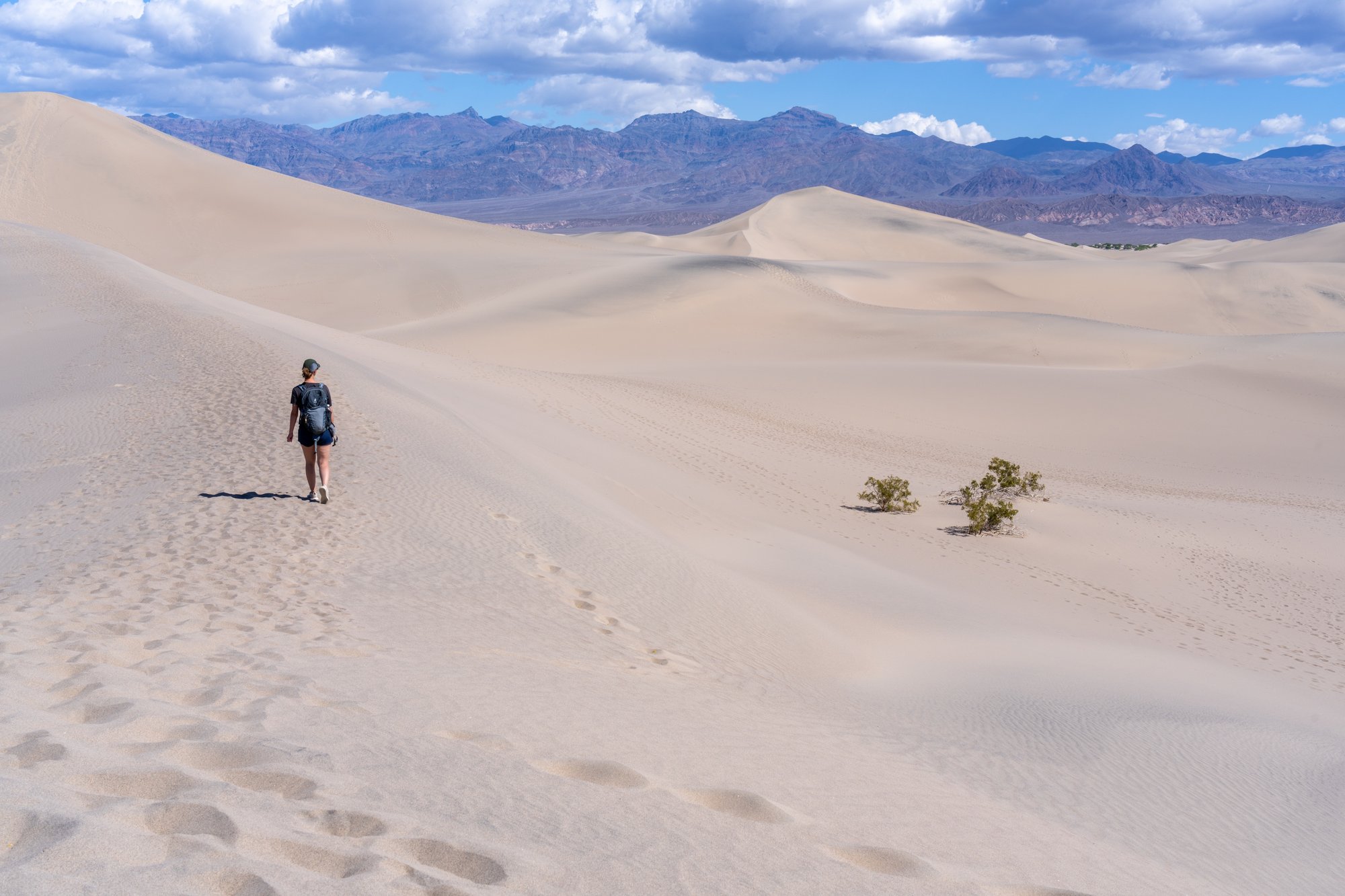 De volgende dag beginnen we met een wandeling bij de Mesquite Sand Dunes. Vanaf de parkeerplaats kom je eerst bij de lagere duinen en we zien al snel dat het mooiste deel een stuk verderop ligt. Alhoewel we ons vooraf niet hadden ingesteld op een pittige wandeling, lopen we in ons enthousiasme de ene na de andere zandduin over totdat we uiteindelijk bij de achterste (en mooiste) zandduin zijn. De zon is sterk en het ploeteren in het losse zand pittig. Bij elke stap omhoog schuif je weer een stukje naar beneden. Zo is deze eerste stop vermoeiender geworden dan gedacht!
