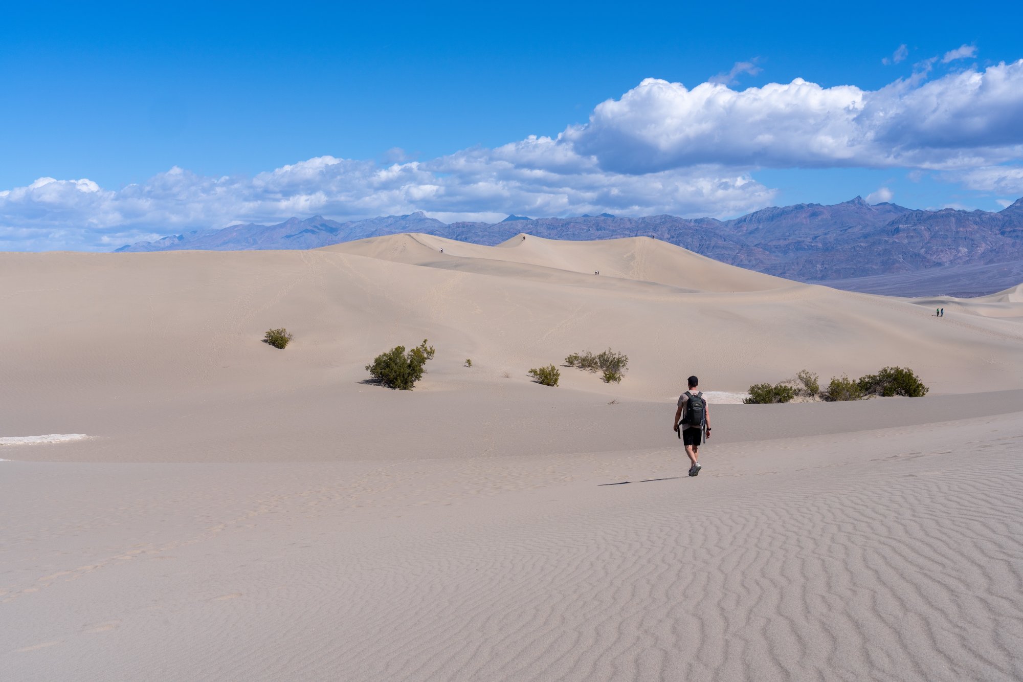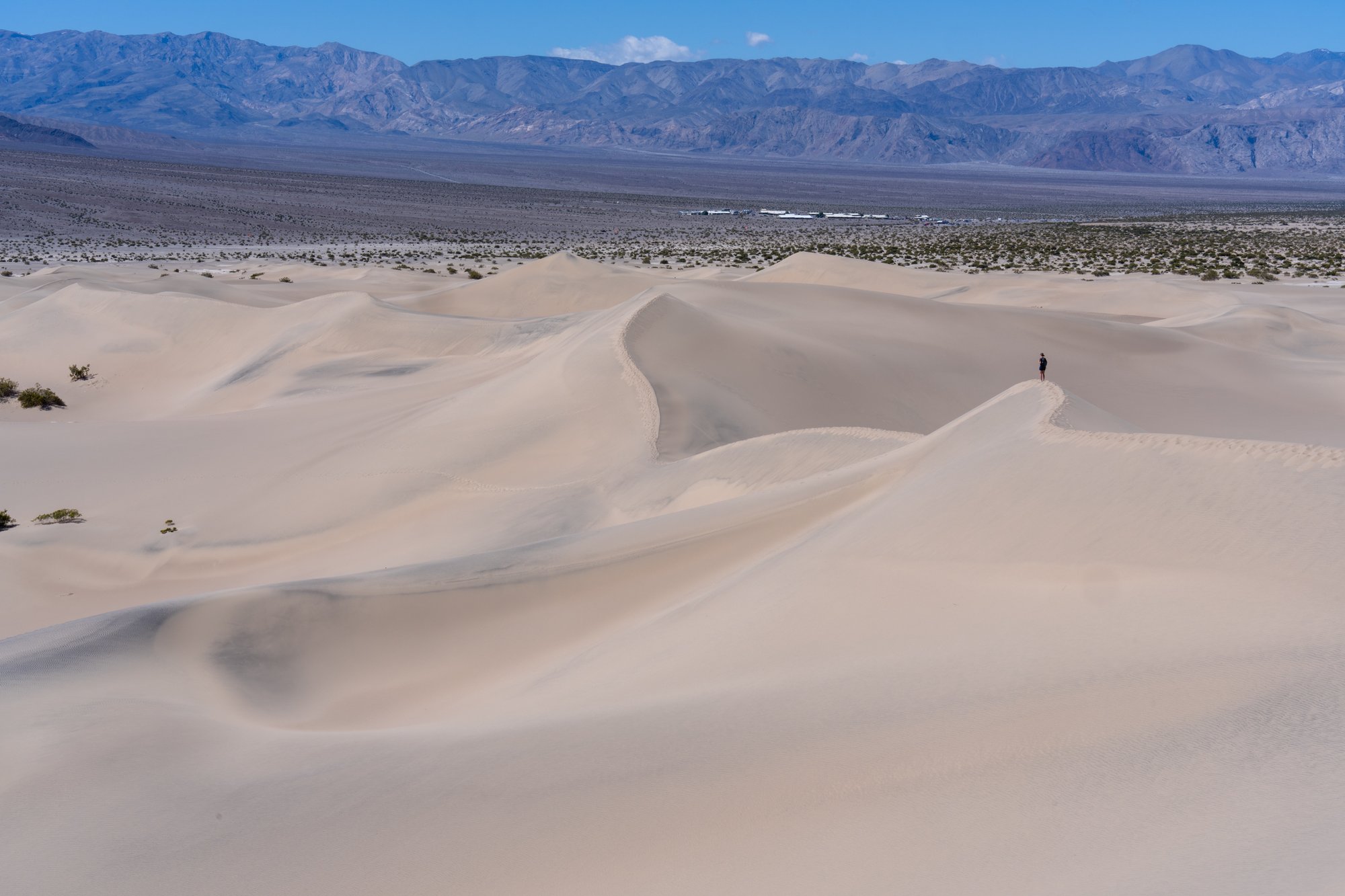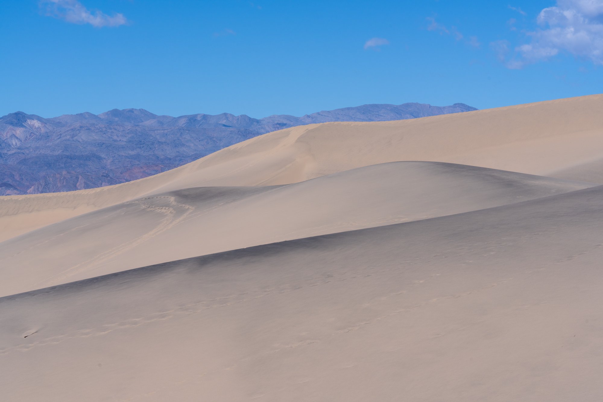 Het is het ploeteren trouwens wel waard, want de achterste duinen zijn prachtig. De glooiende lijnen en het maagdelijke zand (zonder voetstappen) vormen samen met de donkerbruine bergen erachter een fotogeniek geheel.
