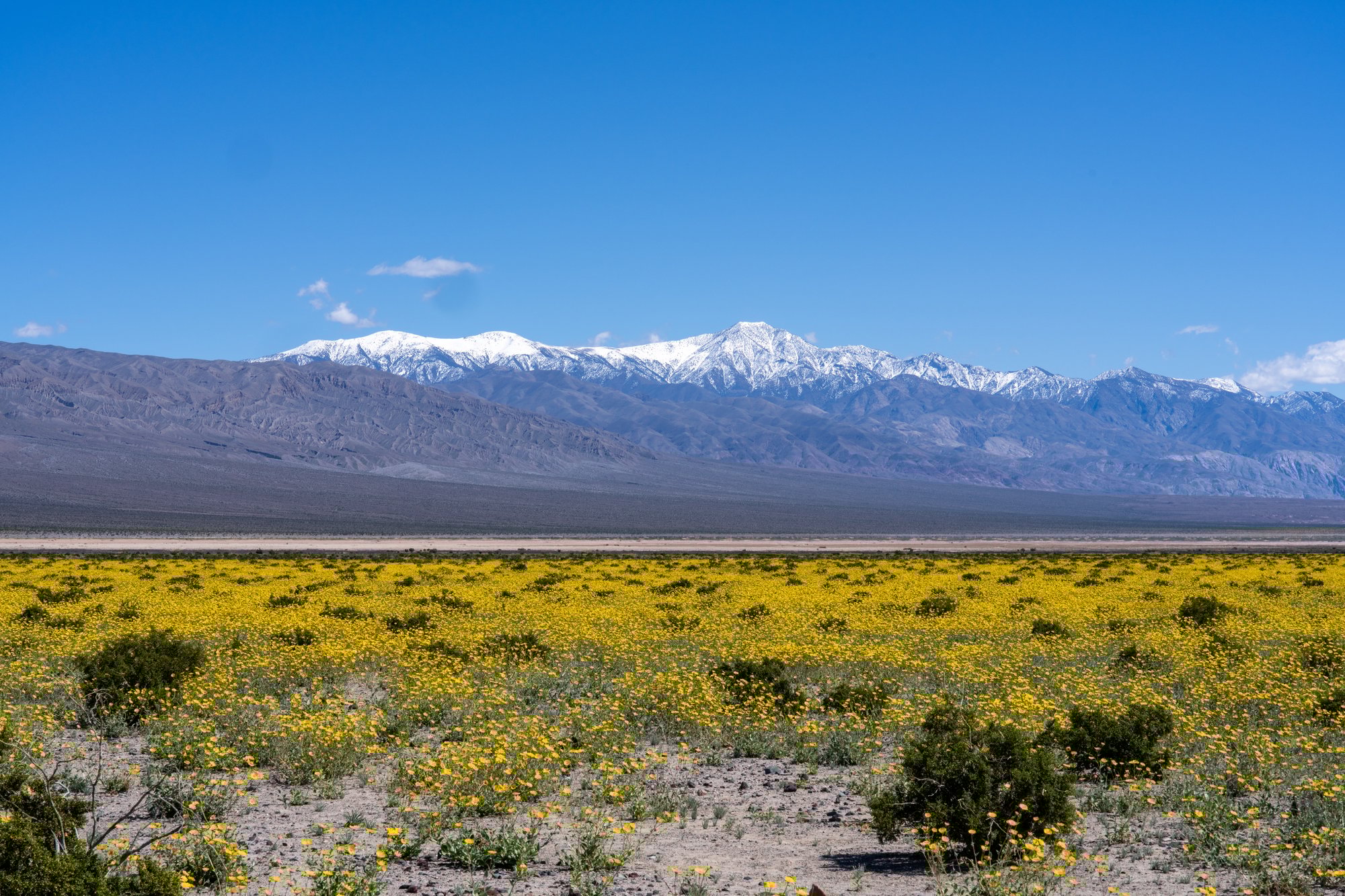 Als we eenmaal de Panamint Valley in rijden, worden we verrast door een hoos van kleur. Het staat hier vol met gele bloemetjes! Deze veldbloemen schijnen alleen te bloeien als de omstandigheden precies goed zijn. De juiste hoeveelheid neerslag in de herfst en winter, genoeg warmte van de zon en een gebrek aan droge wind. Dan kunnen deze bloemen floreren. Hebben wij even geluk dat ze precies nu zo mooi in bloei staan!