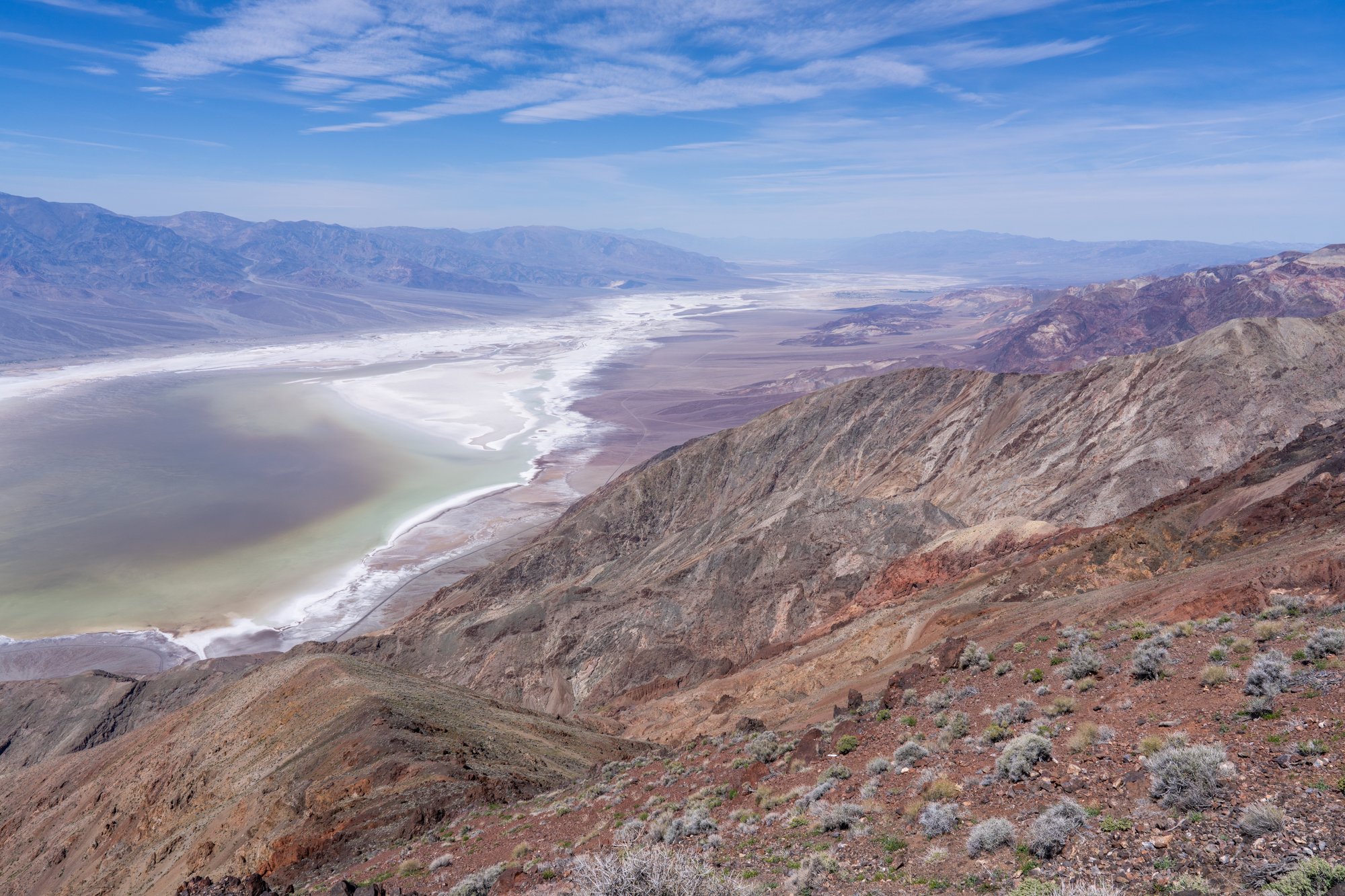 We zijn blij dat Bruno ons naar Dantes View heeft gebracht, want het uitzicht vanaf deze plek is erg mooi. Pas nu krijg je een idee hoe groot Death Valley is. We zien de witte afzetting van het zout, het tijdelijke meer bij Badwater Basin en de besneeuwde bergen aan de overkant van de vallei. Een plek vol extremen en contrasten. Intrigerend!