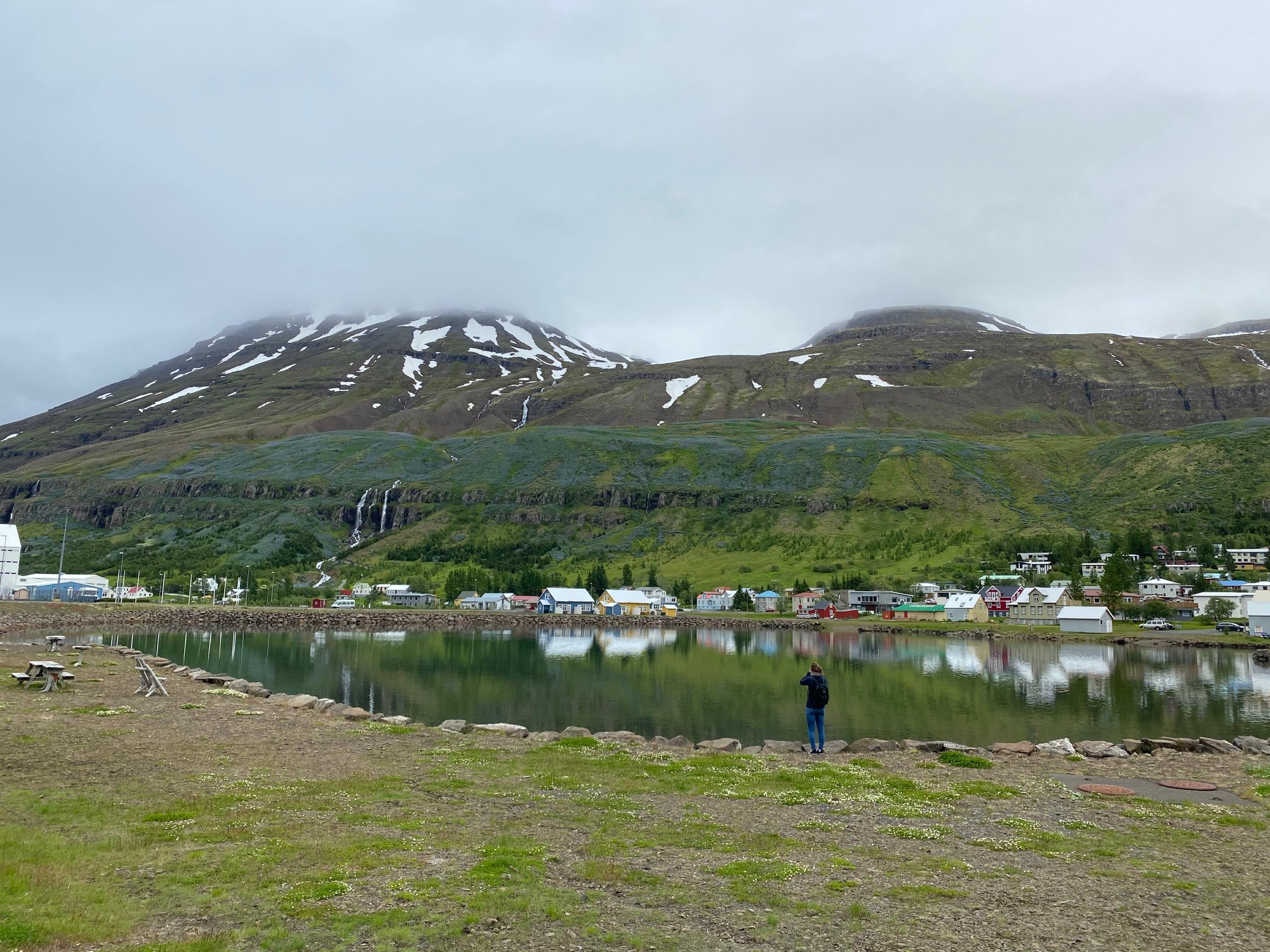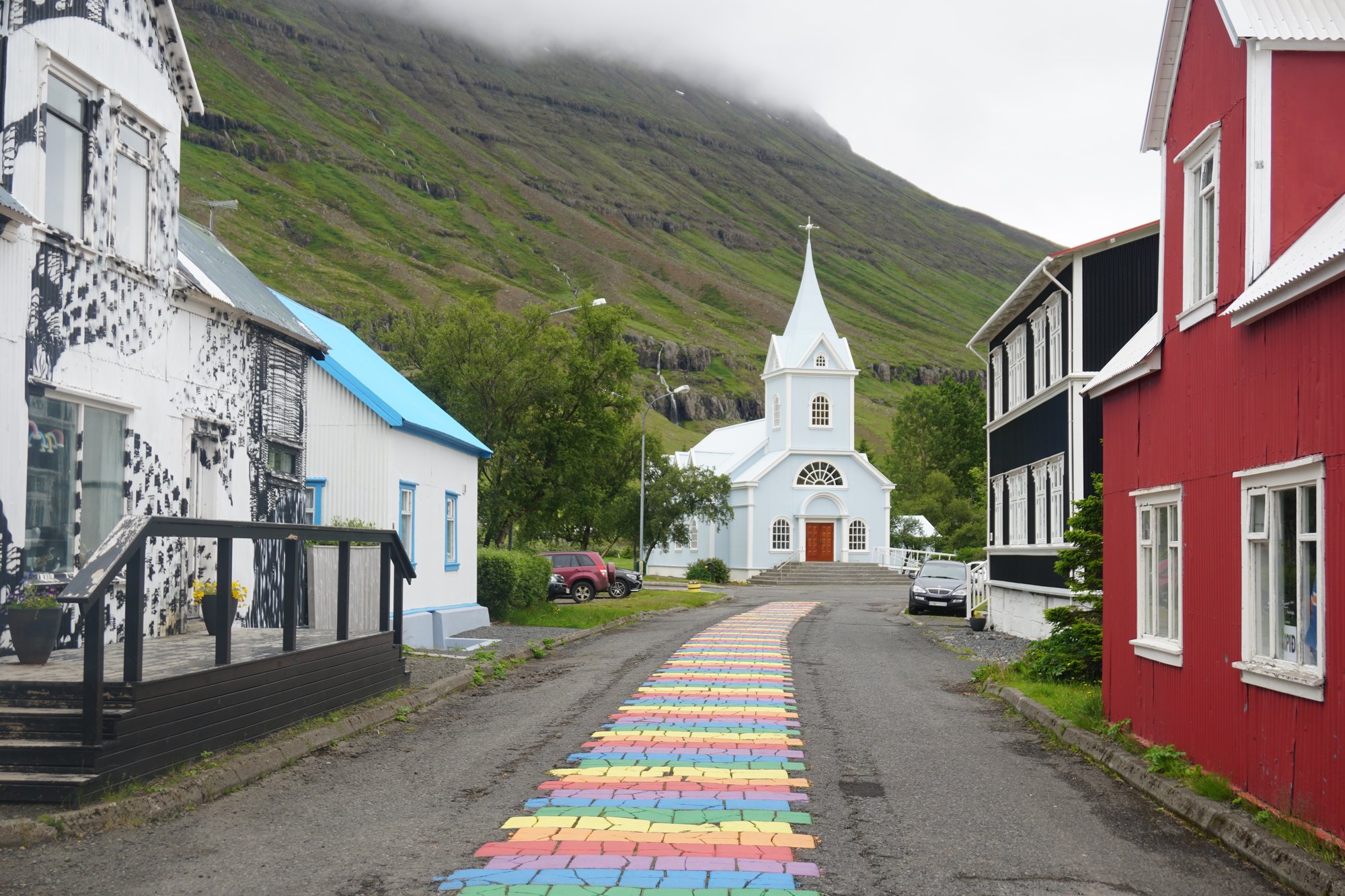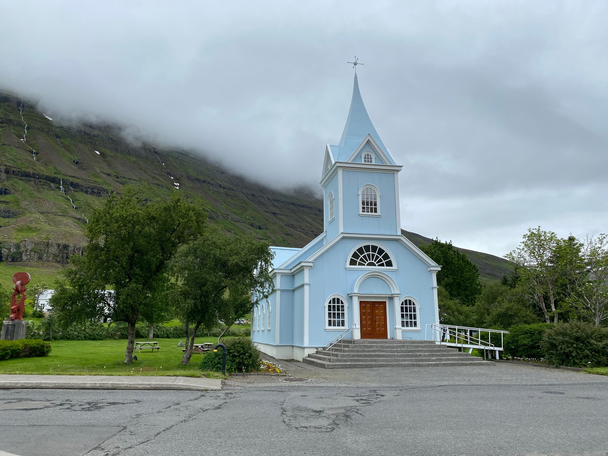 Of je onderweg naar Seydisfjördur mooie uitzichten hebt, dat weten we dus niet. ;-) Eenmaal in Seydisfjördur wandelen we wat door het dorp, langs de blauwe kerk en rondom het meer. Grappig dorpje wel en vooral de ligging is prachtig, maar dat dit het artistieke hart van IJsland is, dat zien we niet zoveel terug eigenlijk. Misschien komt dat ook wel doordat het nu - de grenzen zijn pas net open voor toeristen - behoorlijk verlaten is en we daardoor die kunstzinnige sfeer niet helemaal mee kregen. Ben benieuwd naar jouw ervaringen als je in Seydisfjördur bent geweest!