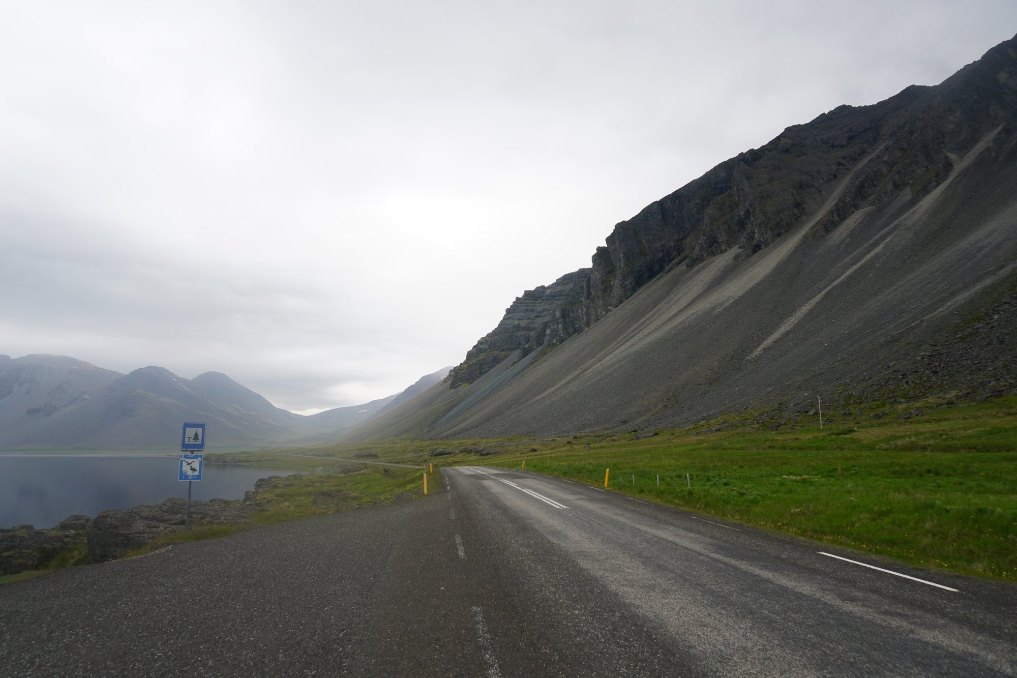 Vanaf Vestrahorn is het nog een behoorlijk stuk rijden naar de Eastfjords, maar gelukkig is het rijden door dit landschap totaal geen straf. We rijden langs de gekleurde bergwanden en besneeuwde toppen en stoppen onderweg regelmatig om hiervan te genieten. Helaas treffen we het niet echt met het weer. Het is grijs, regenachtig en de wolken hangen laag. Dat zorgt ervoor dat we niet heel ver kunnen kijken, maar dan nog is het een mooie trip naar Egilsstadir. Dat is de hoofdstad van de Eastfjords en de plek om nog even wat boodschappen te doen voordat we verder het dunbevolkte gebied in rijden.