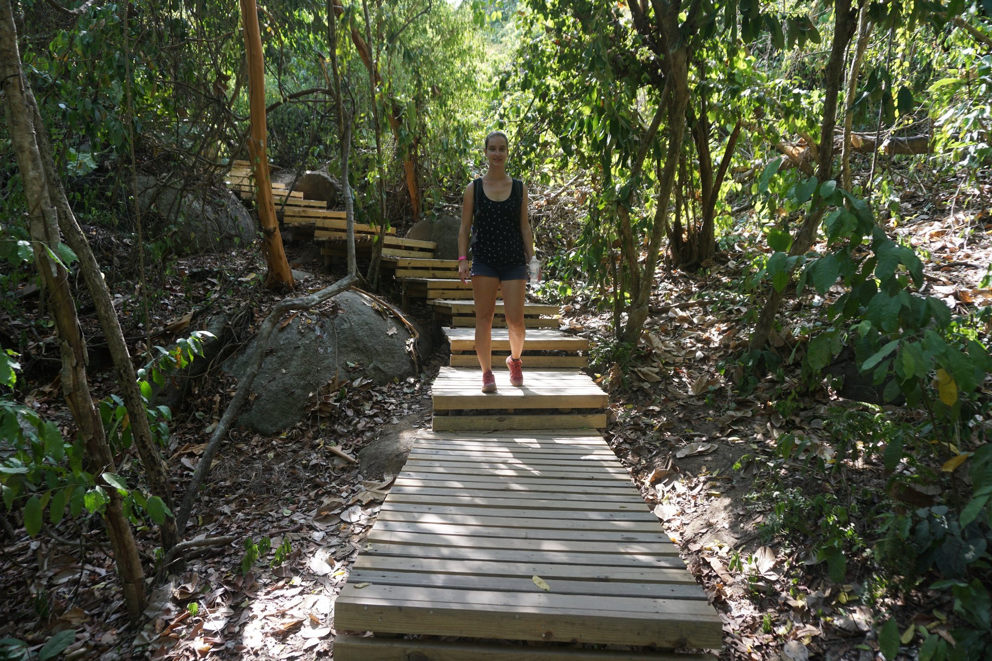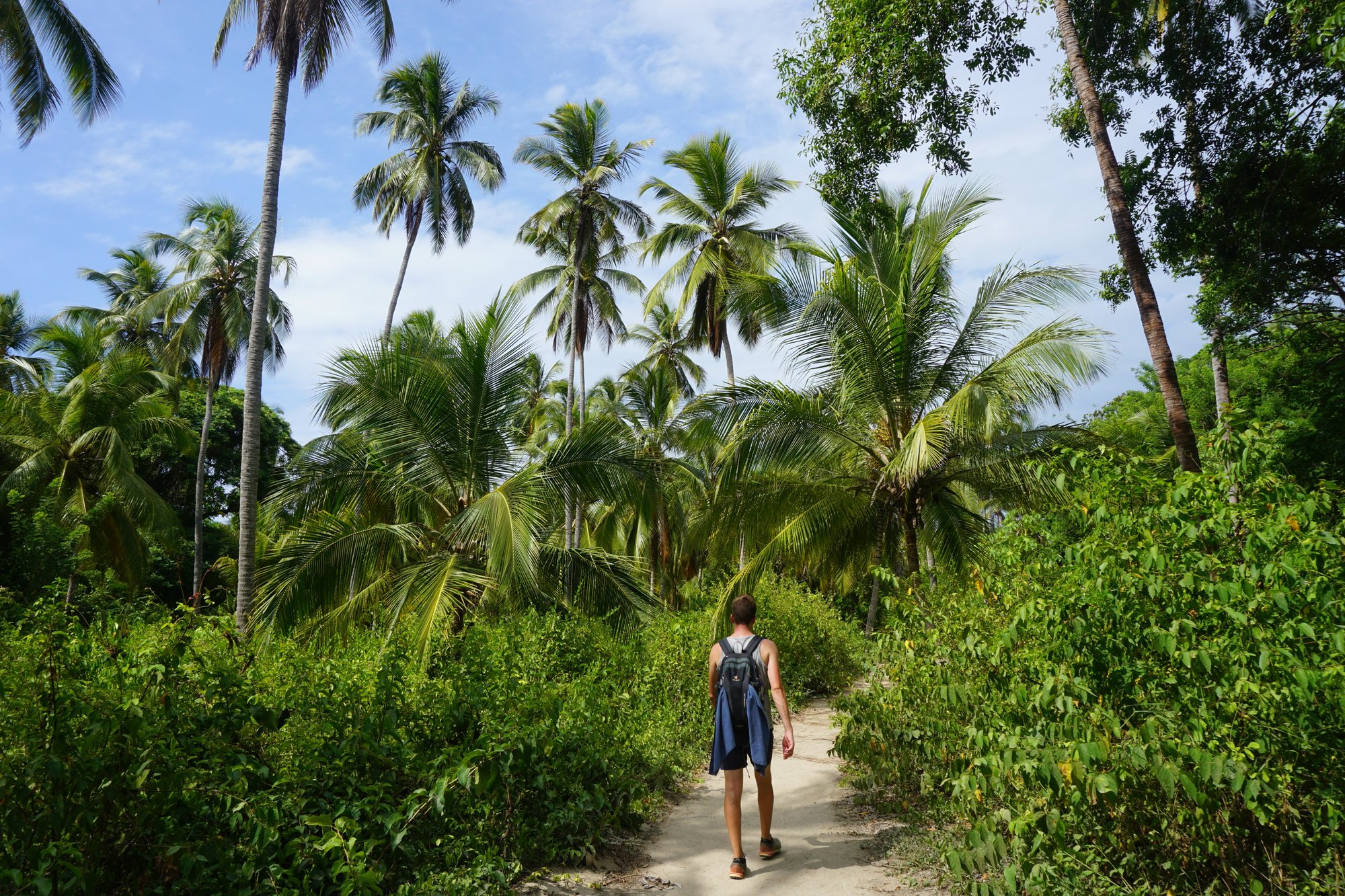 Nu begint hetgeen waar we voor gekomen zijn. We wandelen door een dichtbegroeid bos, moeten regelmatig stijgen en dalen en lopen door mul strandzand. In combinatie met de hoge luchtvochtigheid en temperatuur is het best pittig, maar het landschap maakt dat allemaal goed. De eerste blik op de Caribische Zee laat ons hart een sprongetje maken. Er liggen grote rotsblokken op de stranden en de zee is behoorlijk wild. Je ziet hier de kracht van de natuur. Indrukwekkend!