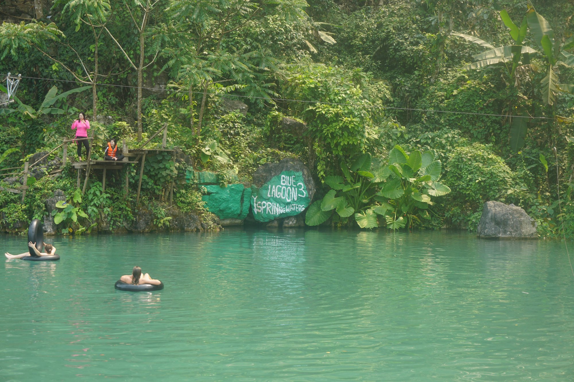 Na deze inspanning is het tijd voor een wat relaxter hoogtepunt. We fietsen naar Blue Lagoon 1. Onze verwachtingen zijn laag, want overal horen we al dat deze lagune behoorlijk 'verpest' is door toeristen en activiteiten. En dat blijkt te kloppen. Na 5 minuten zijn we snel weer weg bij deze plek. De lagune zelf is inderdaad mooi blauw, als je het kunt zien door alle zwemmende toeristen. Daarnaast is het de plek waar je kunt ziplinen en waar alle buggy-rijders een stop maken. Blue Lagoon 1 is overgenomen door schreeuwende Aziatische toeristen. Een plek die je gerust over kunt slaan!