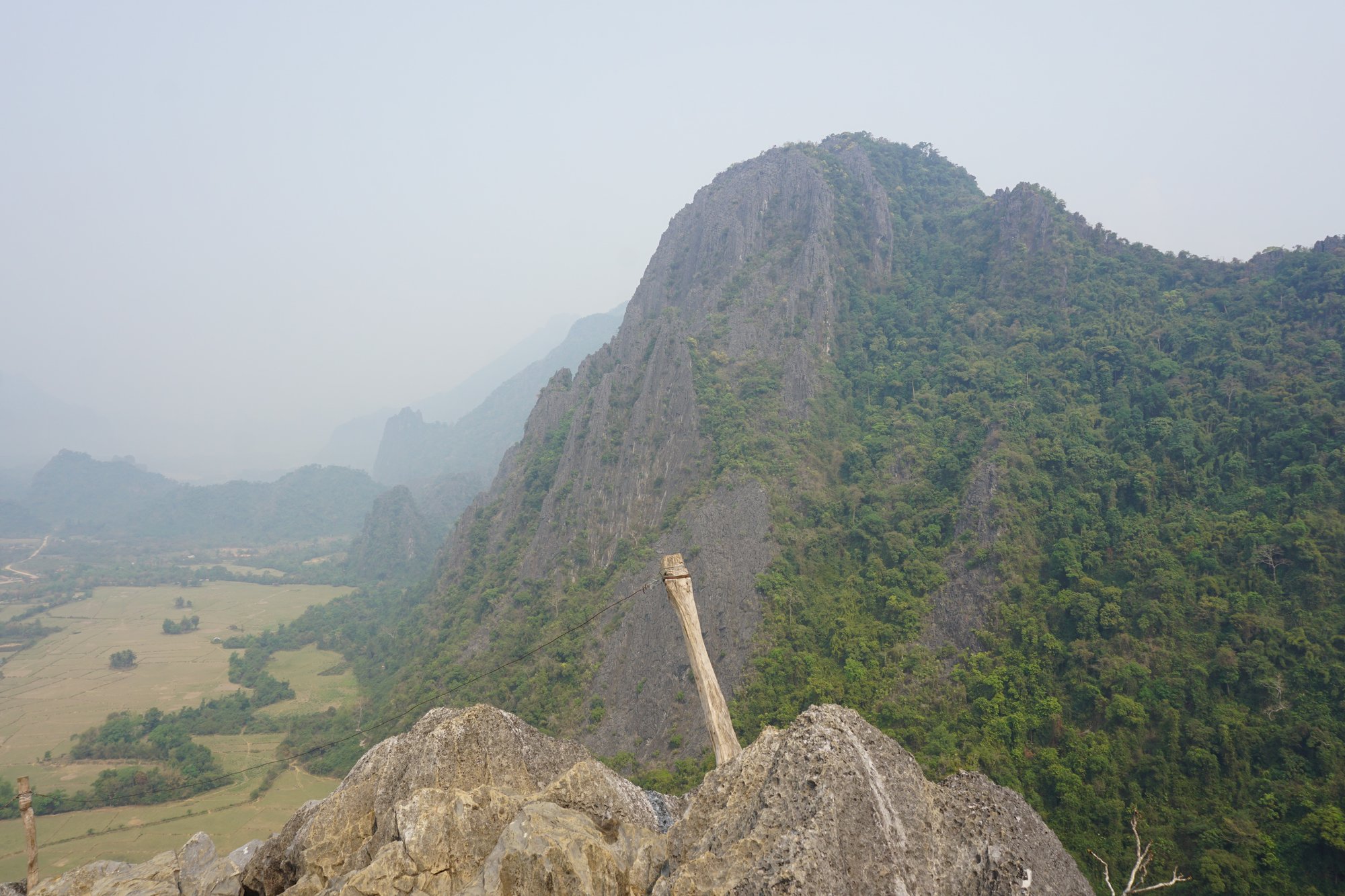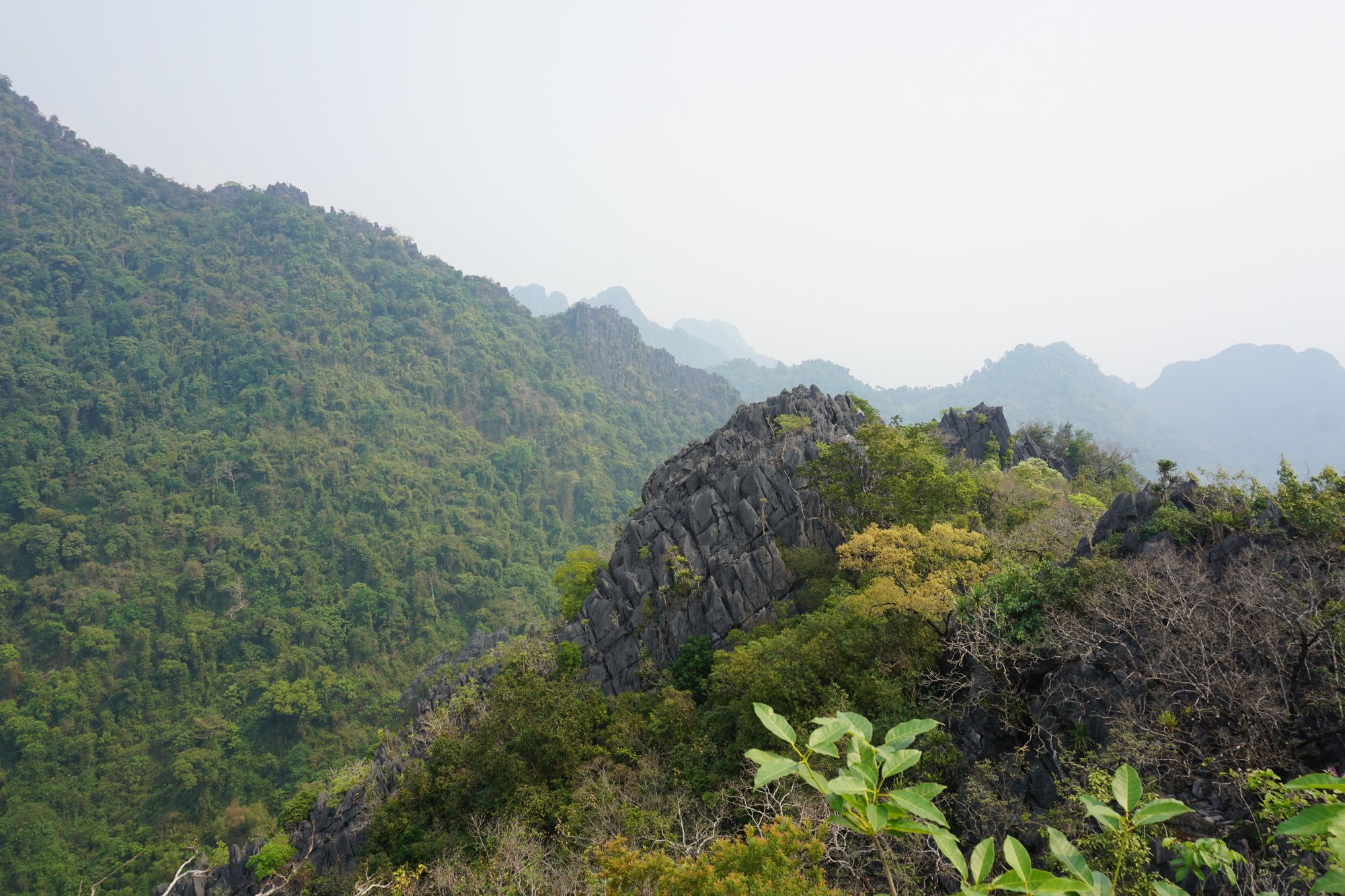 We fietsen naar het eerste hoogtepunt van vandaag: het Pha Ngeun Viewpoint. We parkeren de fietsen, betalen een klein bedrag aan entree en volgen het pad naar boven. Het is een pittige en zware klim, mede door de warmte en de muggen die om je hoofd zoemen, maar het uitzicht is de ultieme beloning! Karstgebergte is echt één van mijn favoriete landschappen.