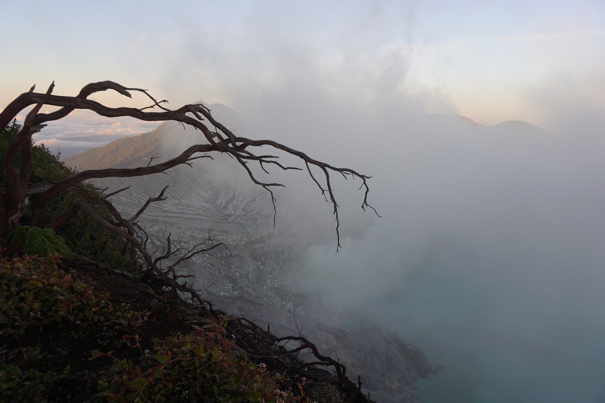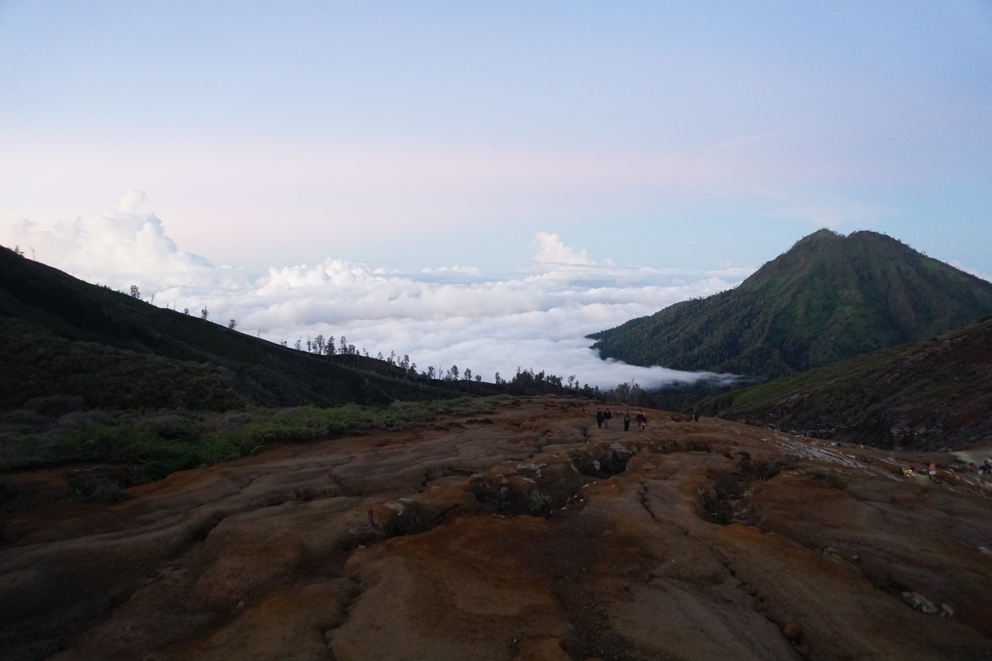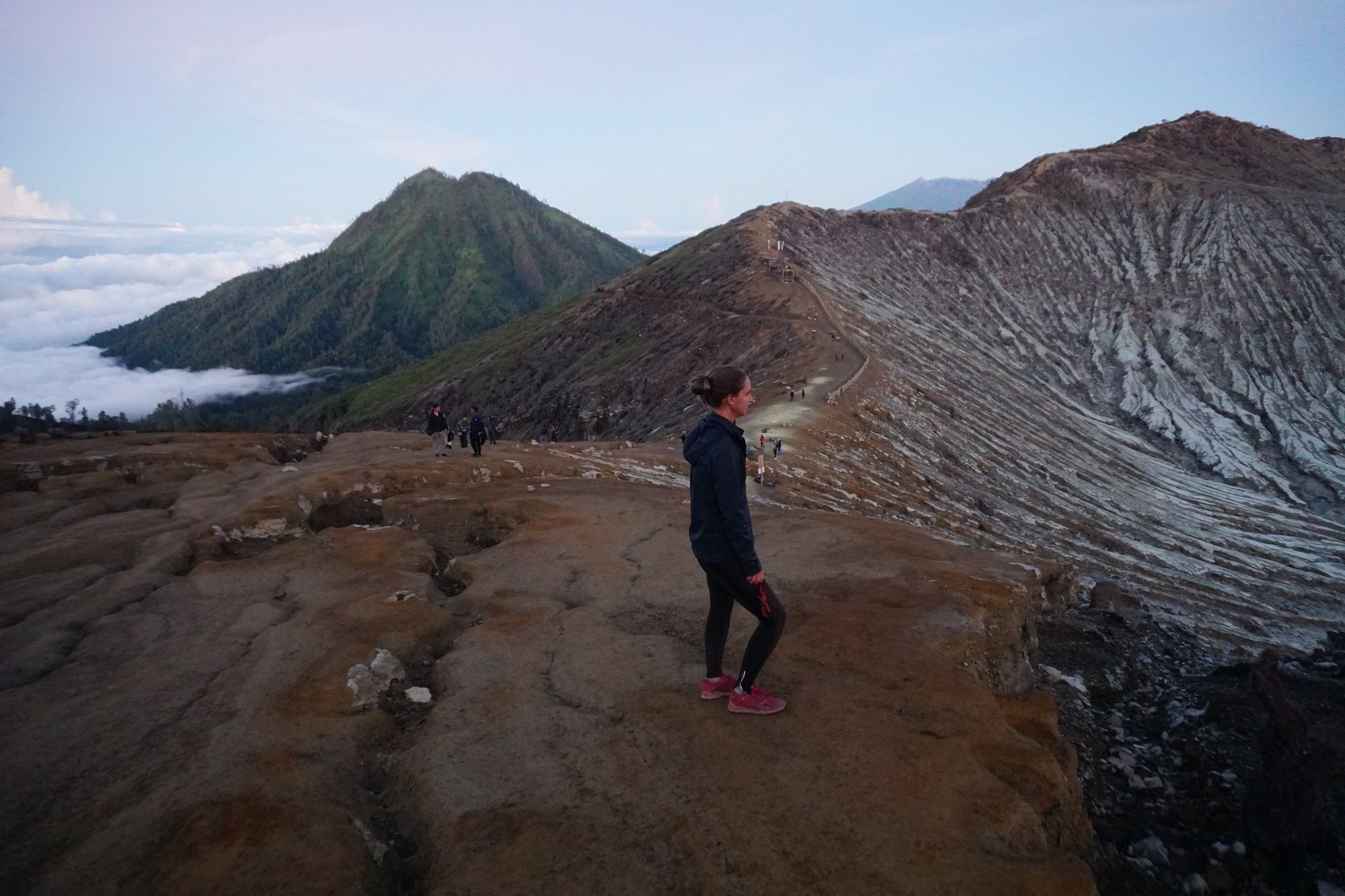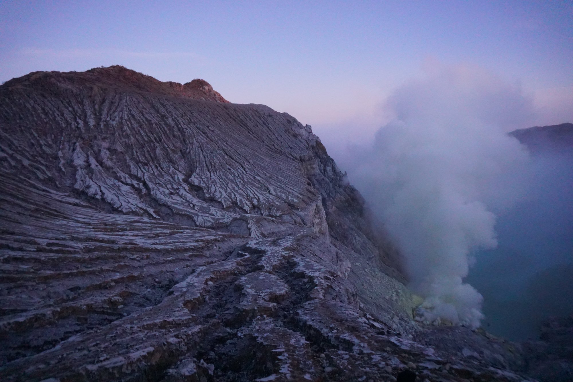 Nadat we een paar flinke gaswolken in ons gezicht geblazen hebben gekregen, vinden we het welletjes geweest. Als groep gaan we weer naar boven, zodat we vanaf de kraterrand de zonsopkomst kunnen zien.