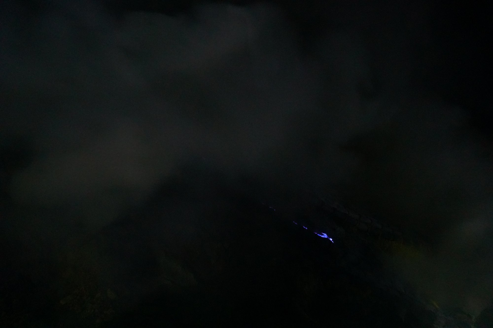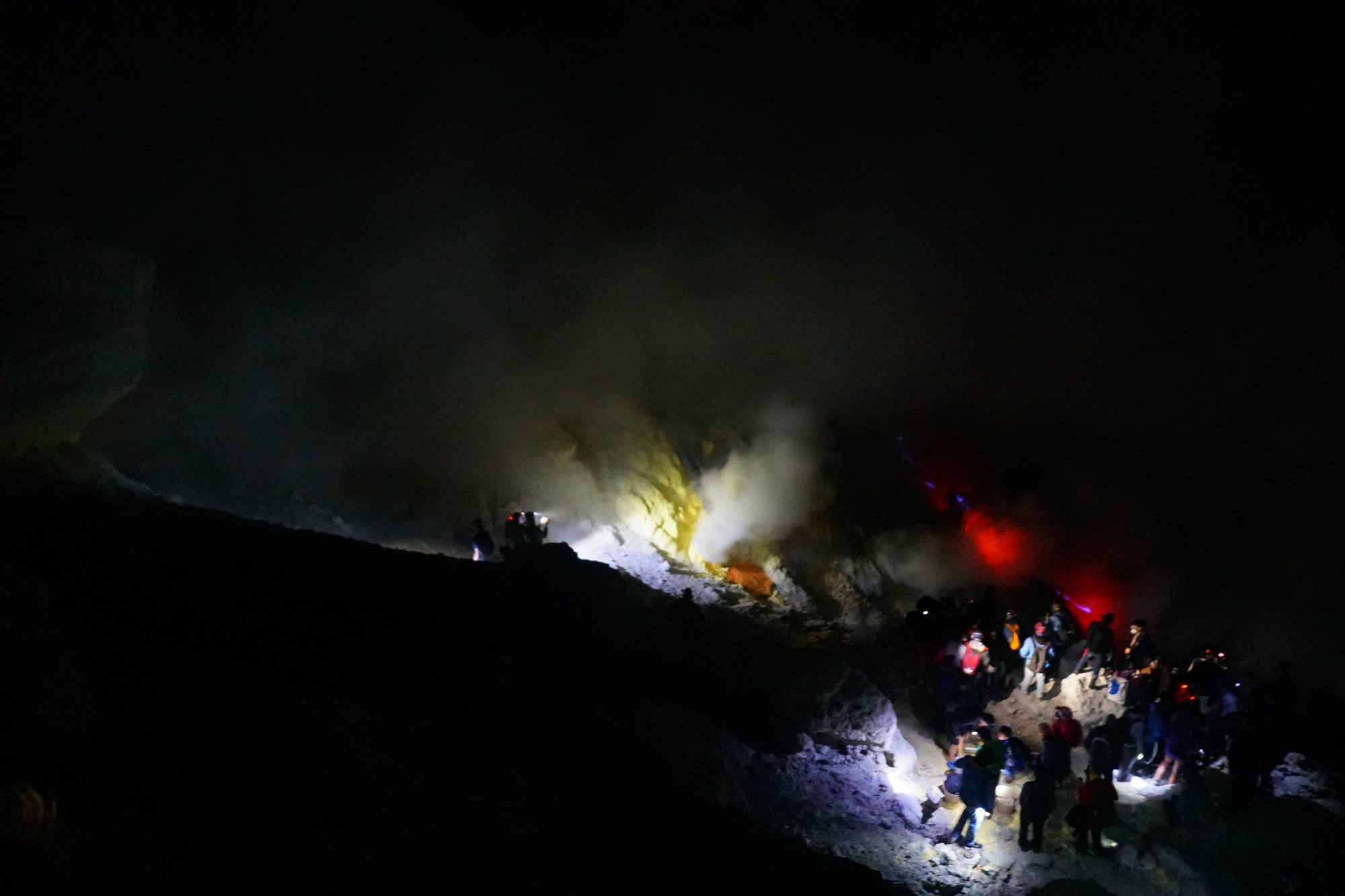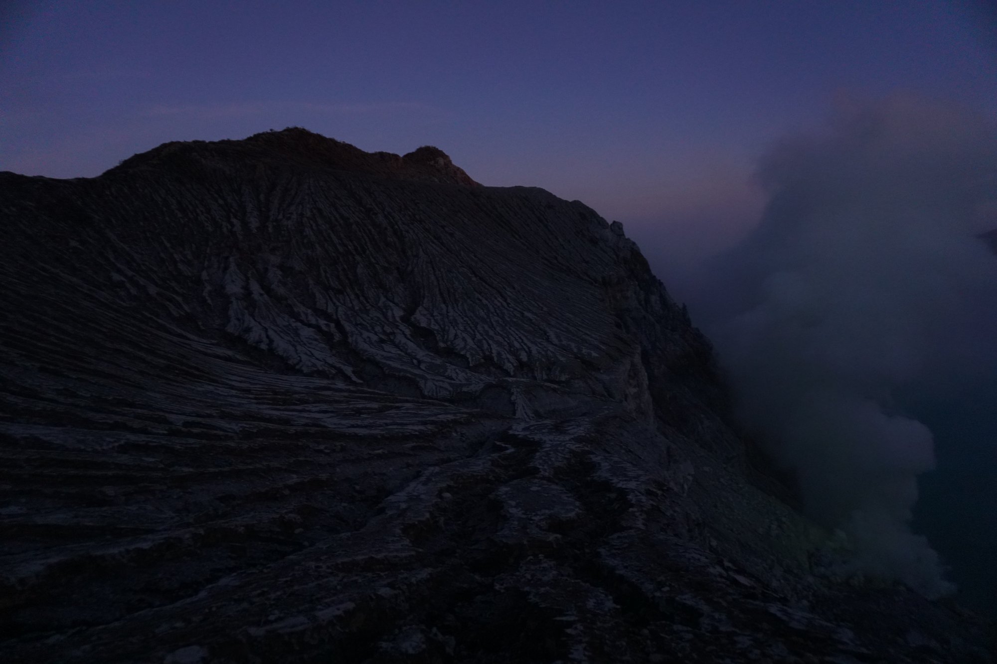 Na ongeveer 1,5 uur bereiken we de kraterrand van de Ijen vulkaan. In de krater ligt het grootste zure meer ter wereld. Het meer kunnen we door de donkerte nu nog niet echt zien, maar we zien wel de dikke wolken gas opstijgen vanuit de krater. Dit wordt veroorzaakt door de aanwezigheid van zwavel en de ontbranding van dat zwavel zorgt weer voor het blauwe licht wat op vuur lijkt. Vandaar de bijnaam 'blue fire'.