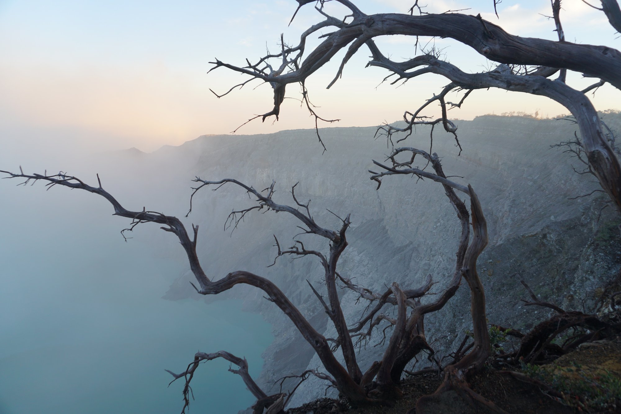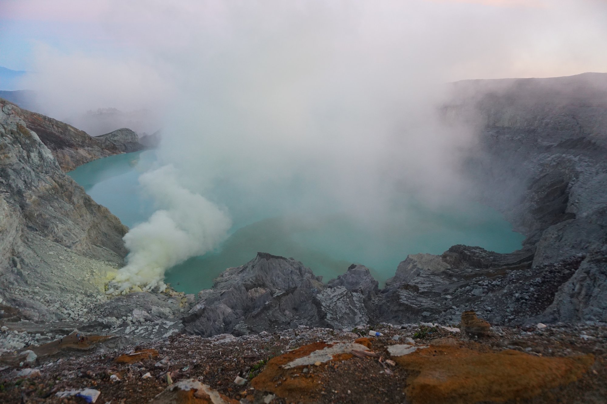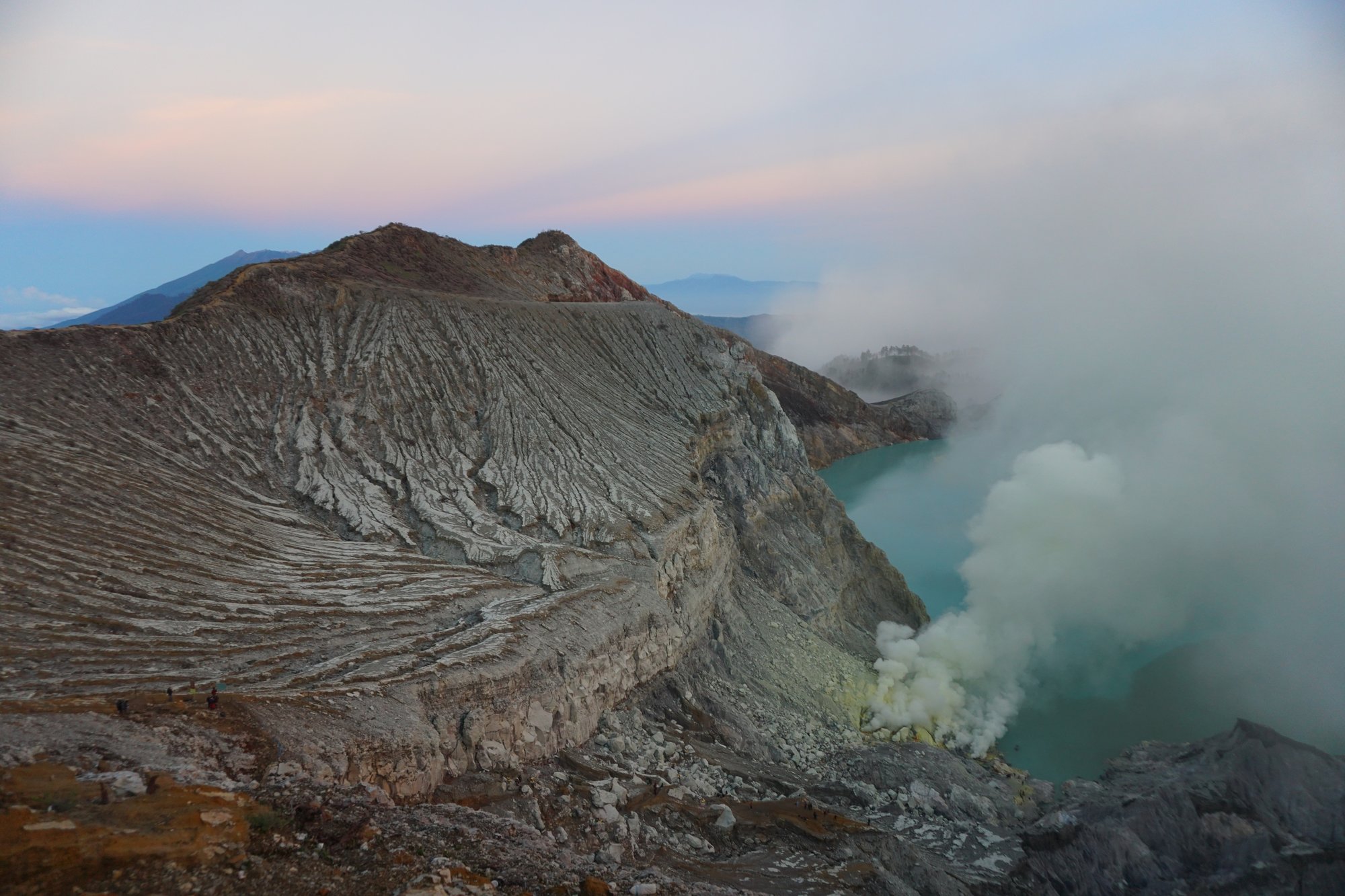 Nu het langzamerhand licht begint te worden, zien we eindelijk wat meer van de omgeving waarin we ons al de hele nacht bevinden. En wat is die prachtig! De krater is enorm groot en het meer onwijs blauw. Dus ook zonder het bekijken van het blauwe vuur is de Ijen vulkaan meer dan de moeite waard!