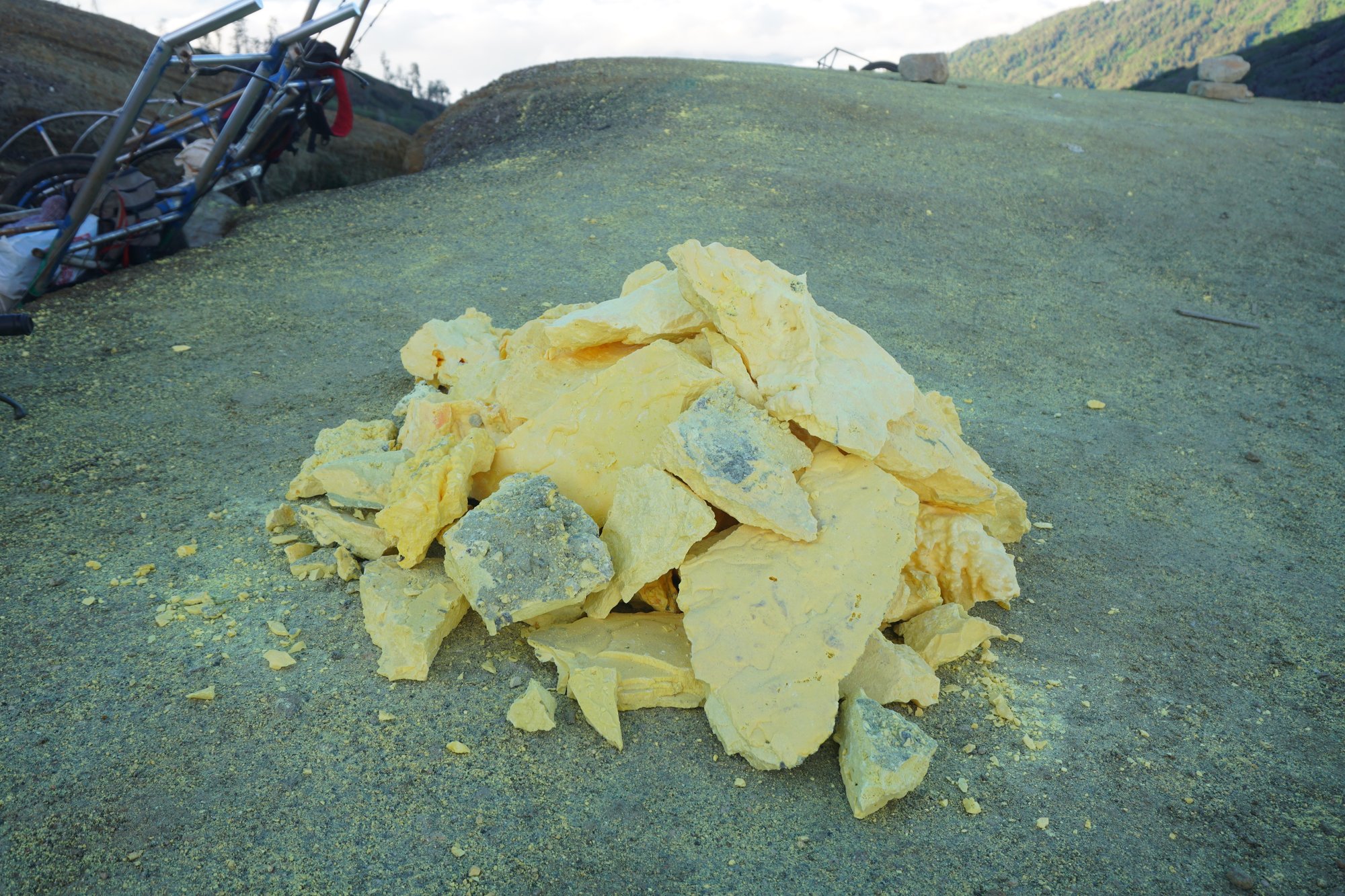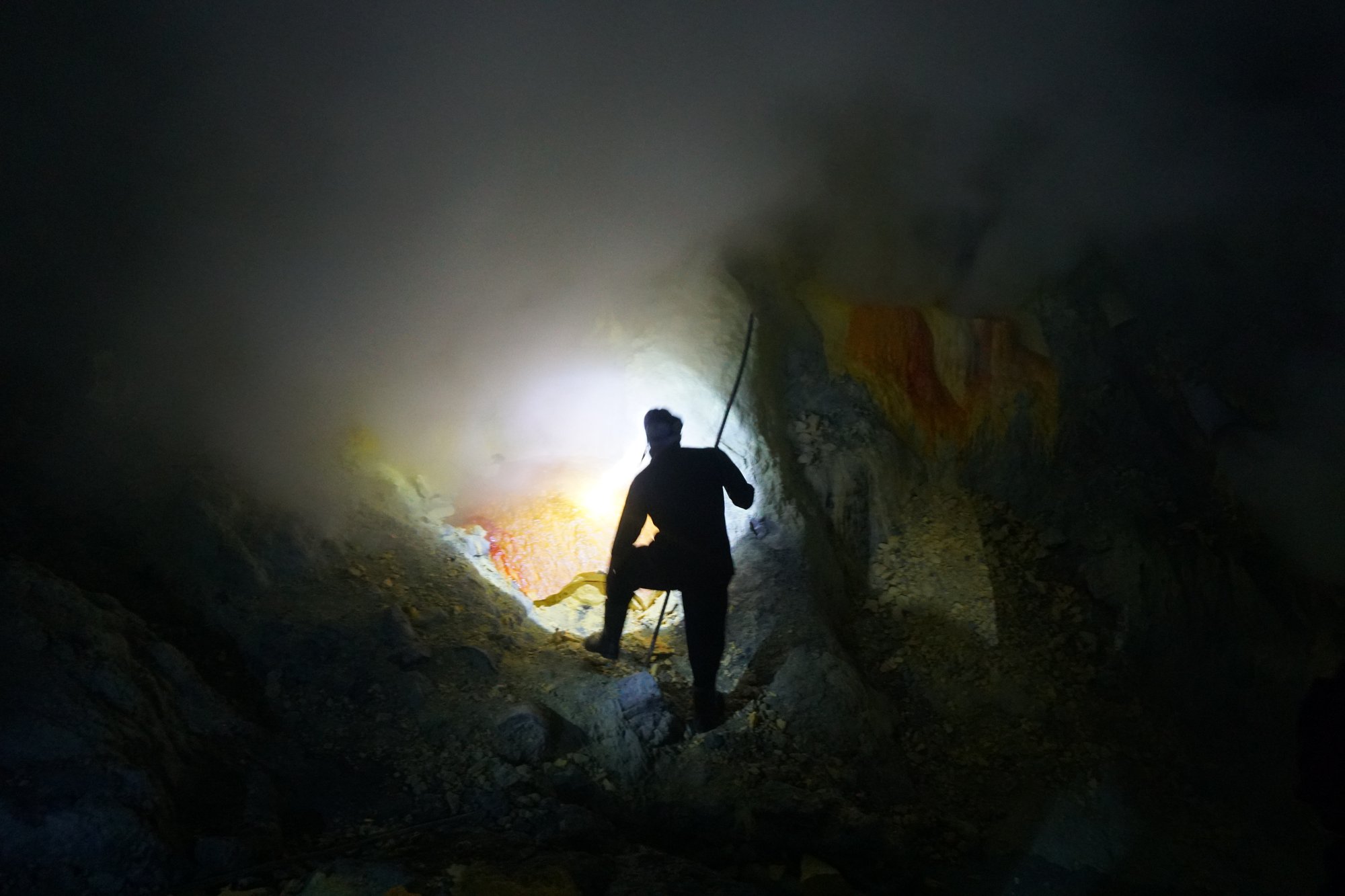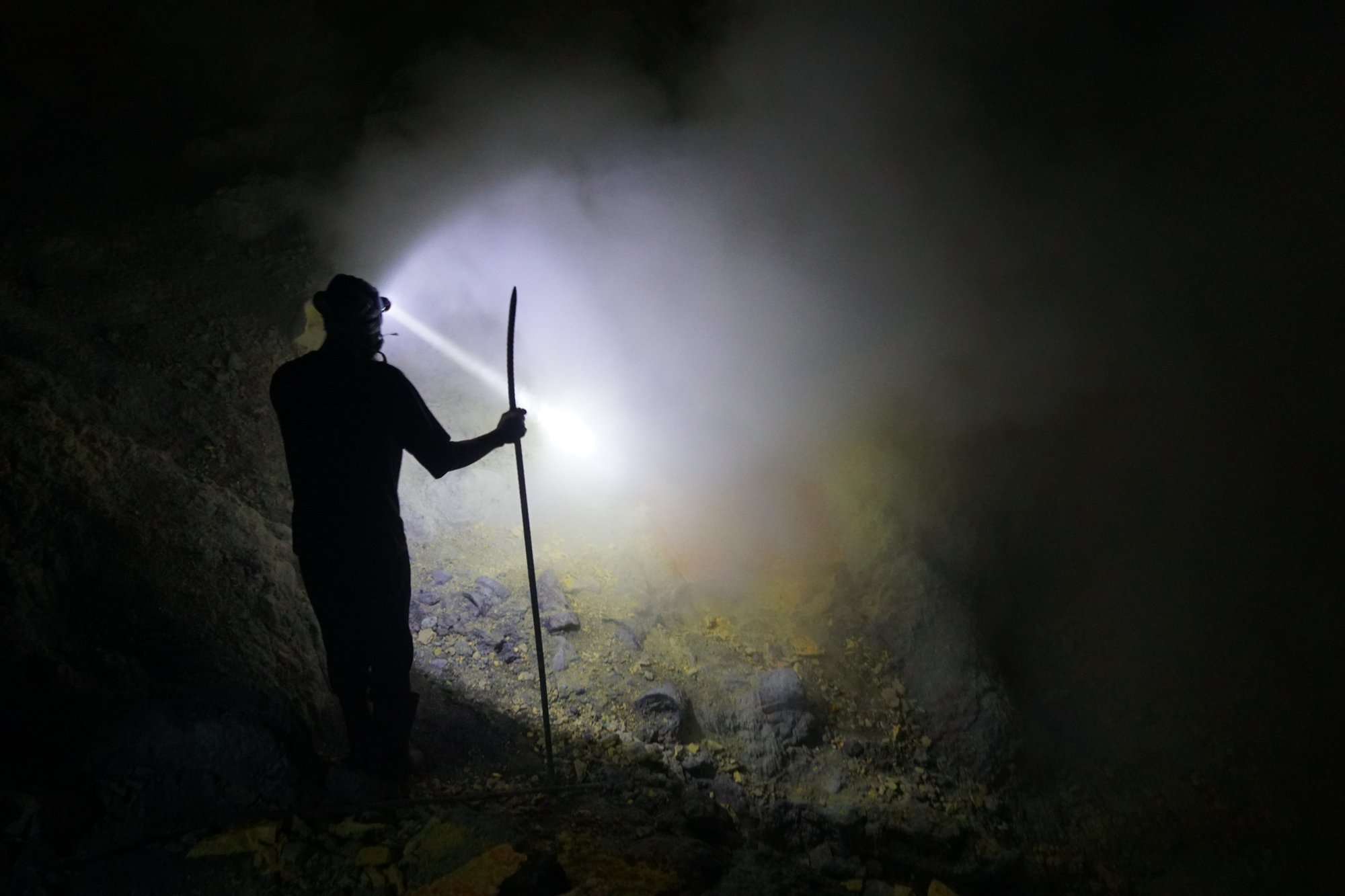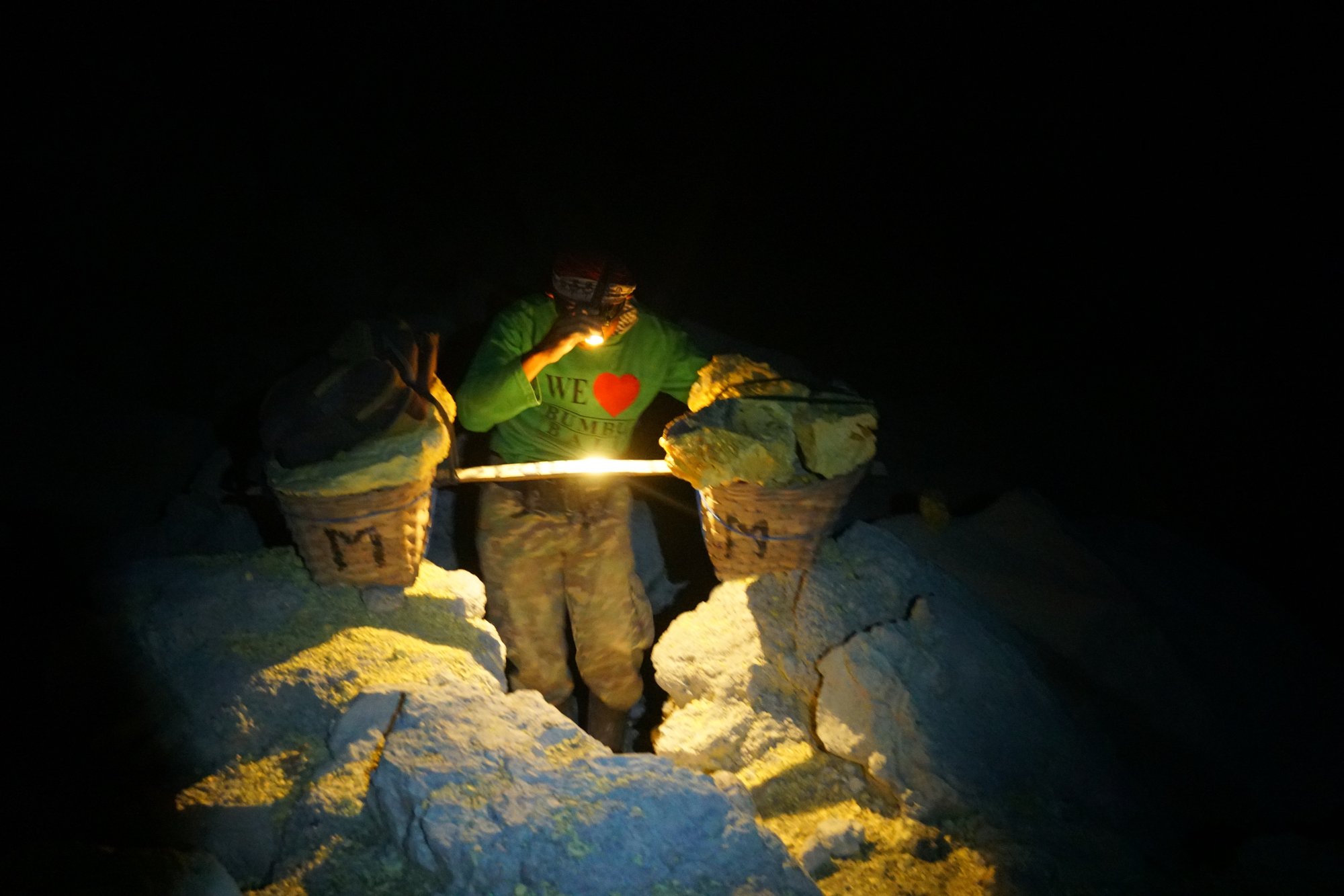 Wat minstens zo indrukwekkend is om te zien zijn de mijnwerkers. Zij winnen de zwavel door het uit te hakken. Daarbij staan ze urenlang in de giftige dampen en hebben ze vaak niet eens een gasmasker op. Vervolgens moeten ze de zwavelbrokken ook nog eens naar boven tillen. Vaak brengen ze wel 70 tot 90 kilo per keer naar boven en maken ze de wandeling heen & terug 3 keer per dag. Wat het ze oplevert? Een schamele €0,08 per kilo... Jeetje, het leven is hard.