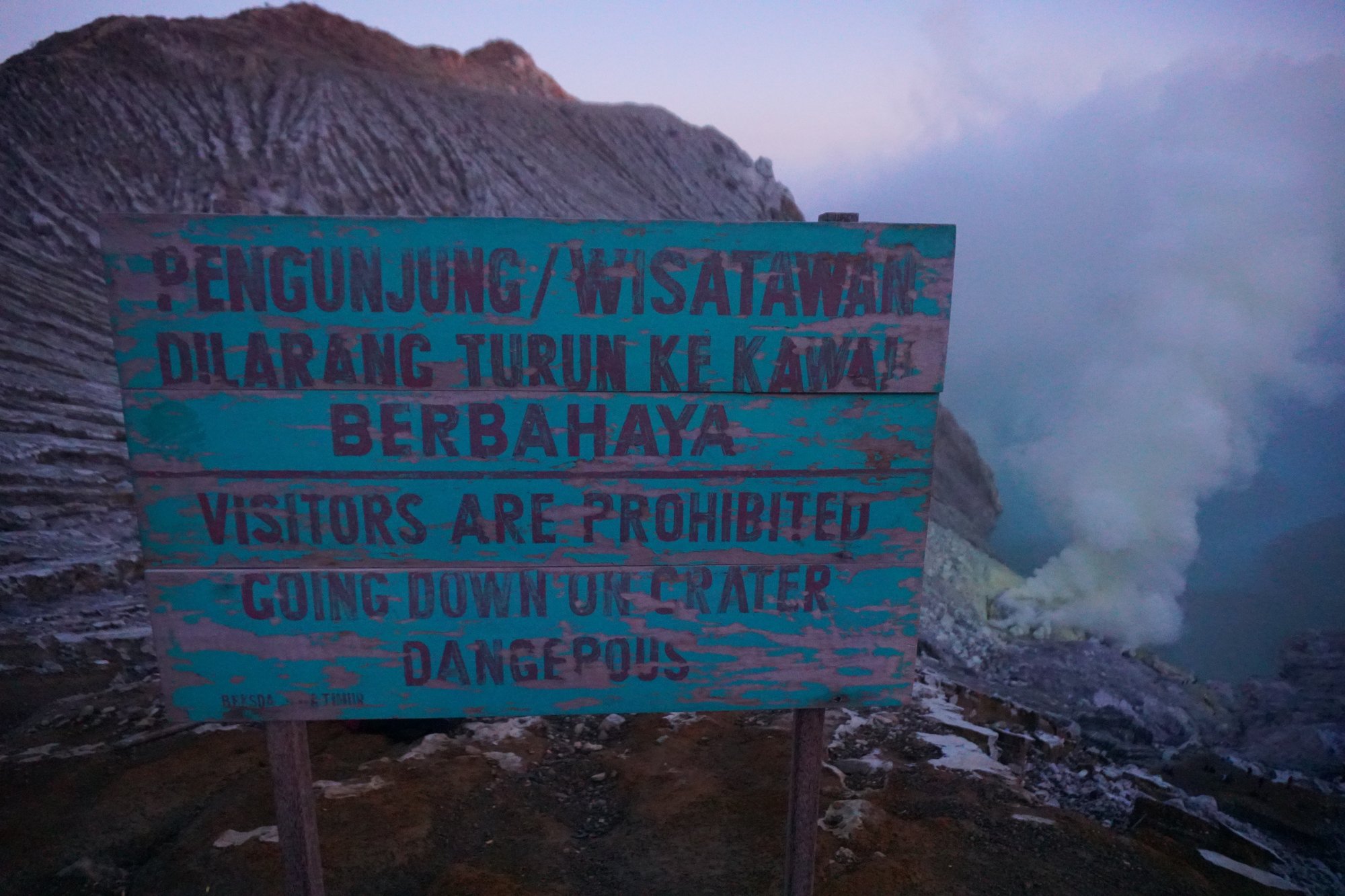 Wat we overigens ook pas zien nu het licht is: de waarschuwingsborden waarop staat dat je als bezoeker niet de krater in mag gaan. Ook vertelt onze gids ons dat er een maand geleden in de krater nog een andere gids is overleden, doordat hij onwel is geworden van de giftige zwavelgassen en vervolgens is gevallen. Laten we zeggen dat het maar goed is dat we dat vooraf allemaal niet wisten! Om eerlijk te zijn weet ik ook niet of dit het meest verantwoorde uitstapje in Indonesië is... Maar mooi en fascinerend is het in ieder geval wel!