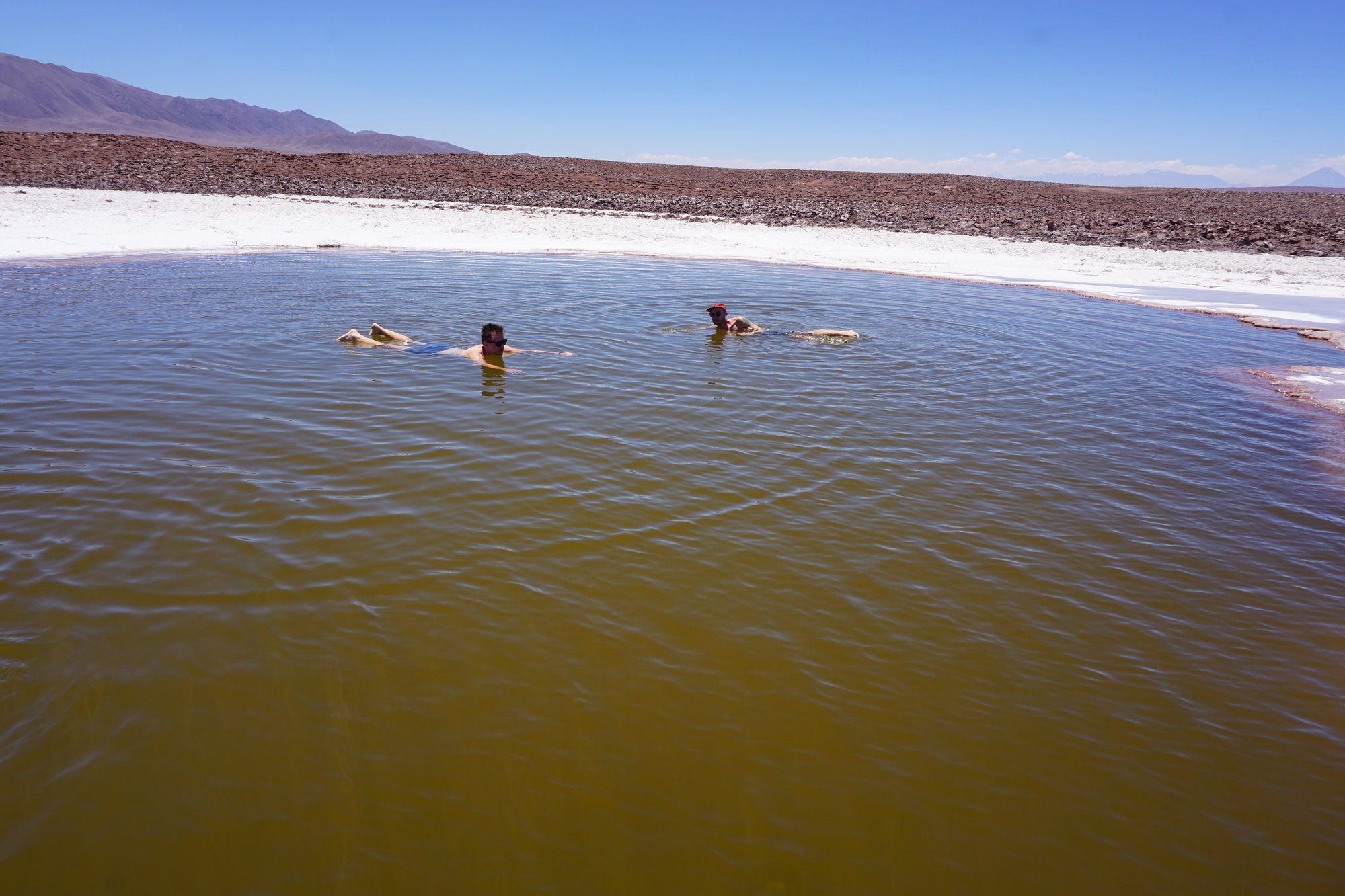 Eenmaal daar aangekomen zijn we blij dat we hebben doorgezet en niet naar Laguna Cejar zijn gegaan. Het is hier lekker rustig en de blauwe meertjes zijn ook nog eens ontzettend mooi. In totaal zijn er zo’n 7 meren en in de eerste en achterste mag je zwemmen. We kleden ons om en haasten ons naar het eerste meer, maar eenmaal daar staan we toch wat twijfelend aan de waterkant. Het water is ijskoud! Maar natuurlijk gaan we er toch in. Het drijven in het water is echt raar. Wel heel tof om een keer mee te maken!