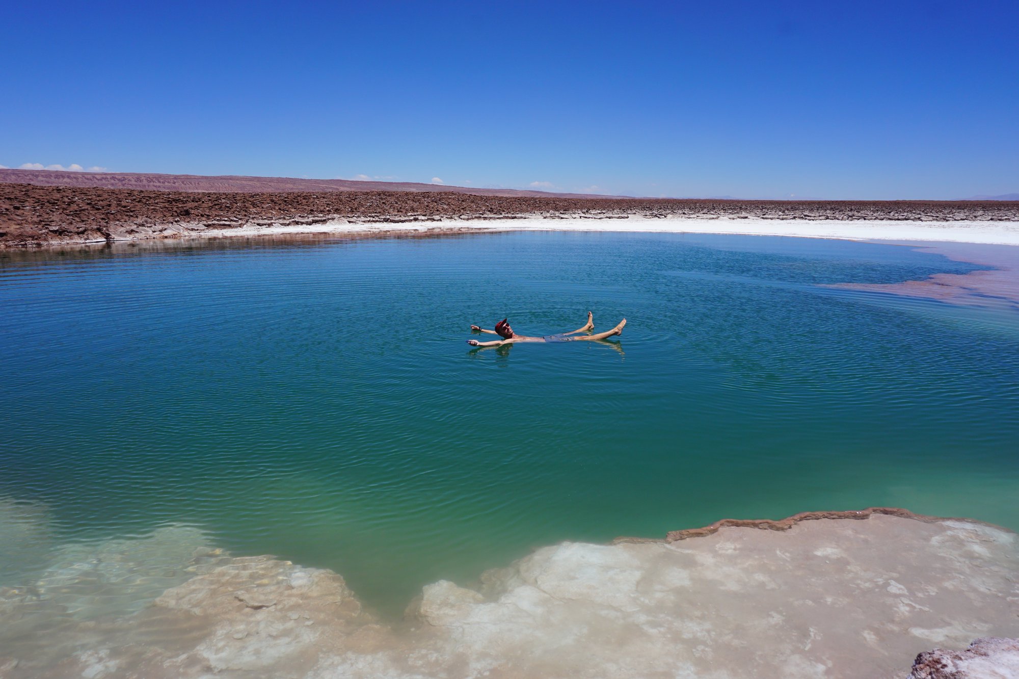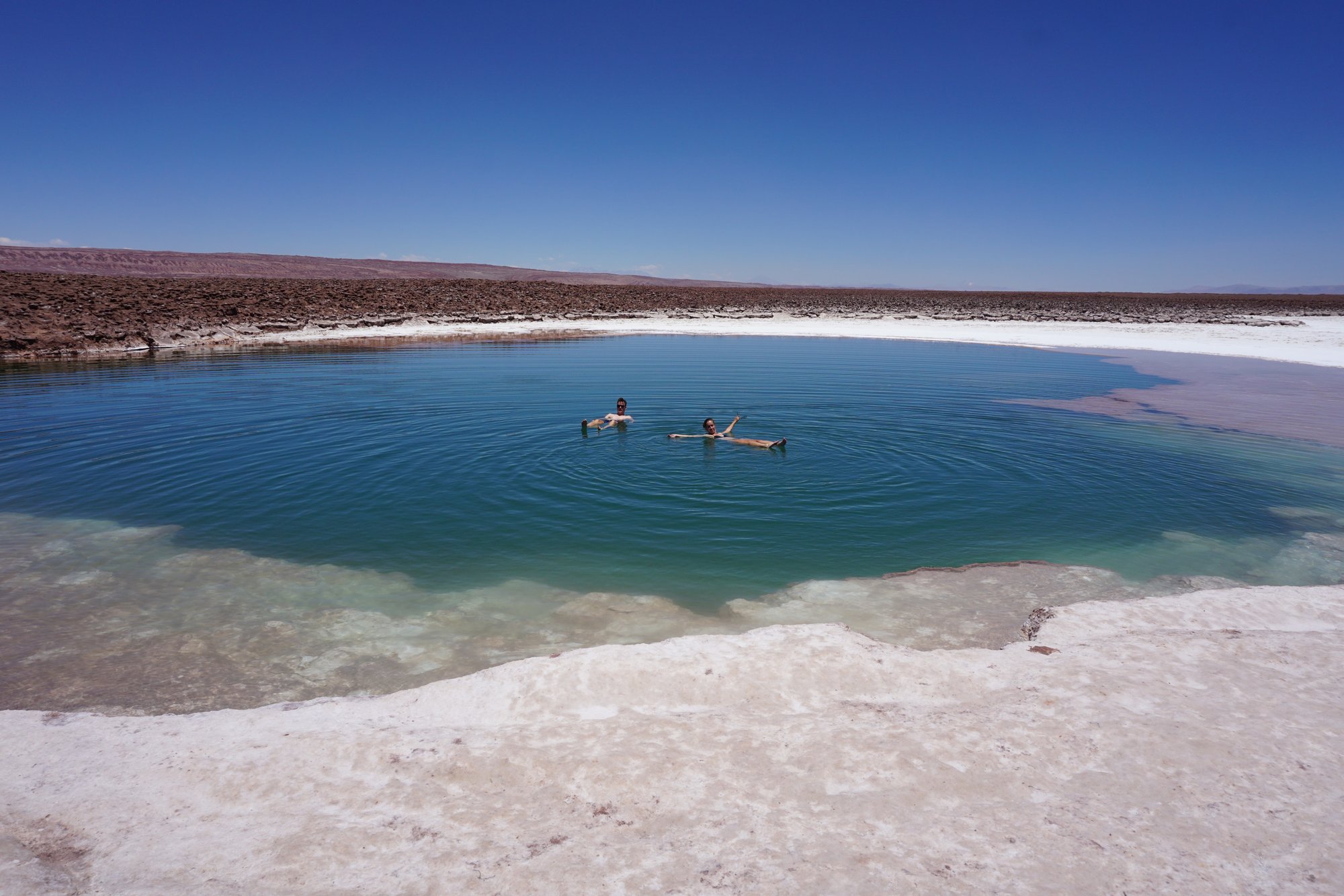 Na deze prachtplek is het tijd voor een compleet nieuwe ervaring: drijven in het water. Doordat enkele meren in de Atacama woestijn zo ontzettend zout zijn (zelfs zouter dan de beroemde Dode Zee), blijf je erin drijven. Dat willen we weleens ervaren! In de Atacama woestijn heb je twee keuzes voor deze unieke ervaring: het dure en populaire Laguna Cejar (entreeprijs: 17.000 Chileense pesos per persoon, omgerekend zo’n 22 euro) of de rustigere en goedkopere Laguna Baltinache (entreeprijs: 5.000 Chileense pesos per persoon, omgerekend zo’n €6,50). Wij kiezen voor de laatste, reizen in Chili is al duur genoeg. ;-)