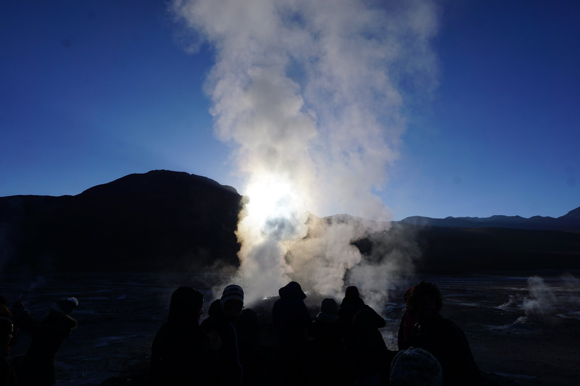 Tot onze 3-daagse Uyuni tour een paar dagen geleden had ik eigenlijk nog nooit een geiser gezien. En nu zijn we gelijk op het op twee na grootste geiserveld ter wereld! Terwijl we vanuit de bus richting het geiserveld lopen, zien we overal om ons heen borrelend water in gaten in de grond en damp uit de bodem omhoog komen. Ondertussen komt de zon langzaam op van achter de bergen. Het is een mystiek plaatje!