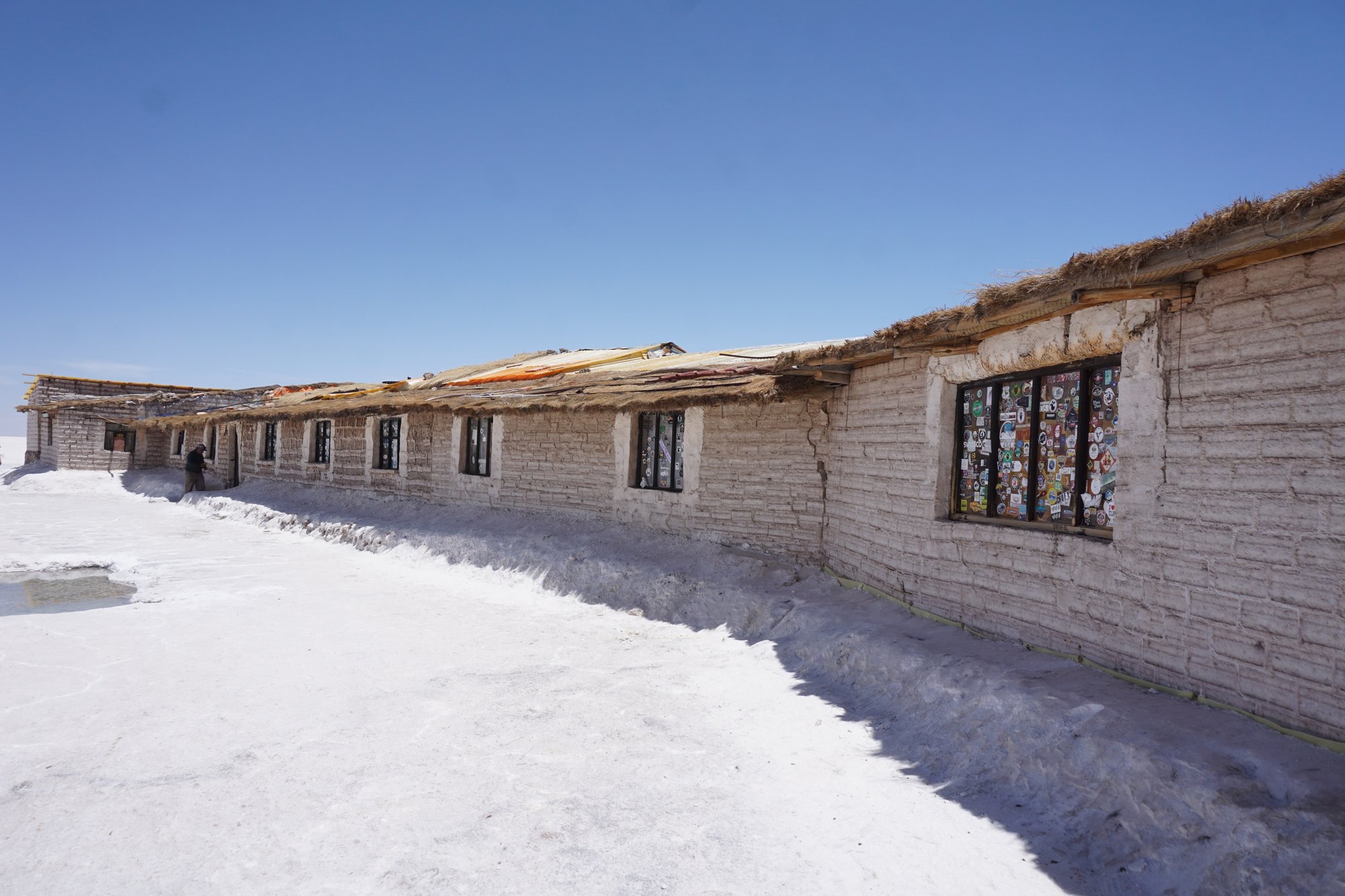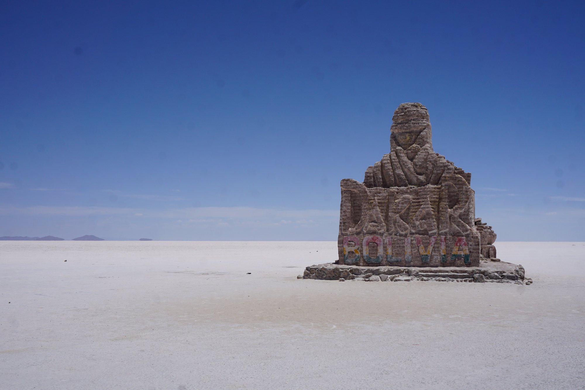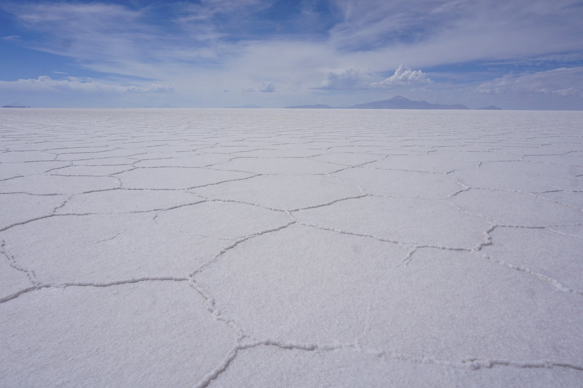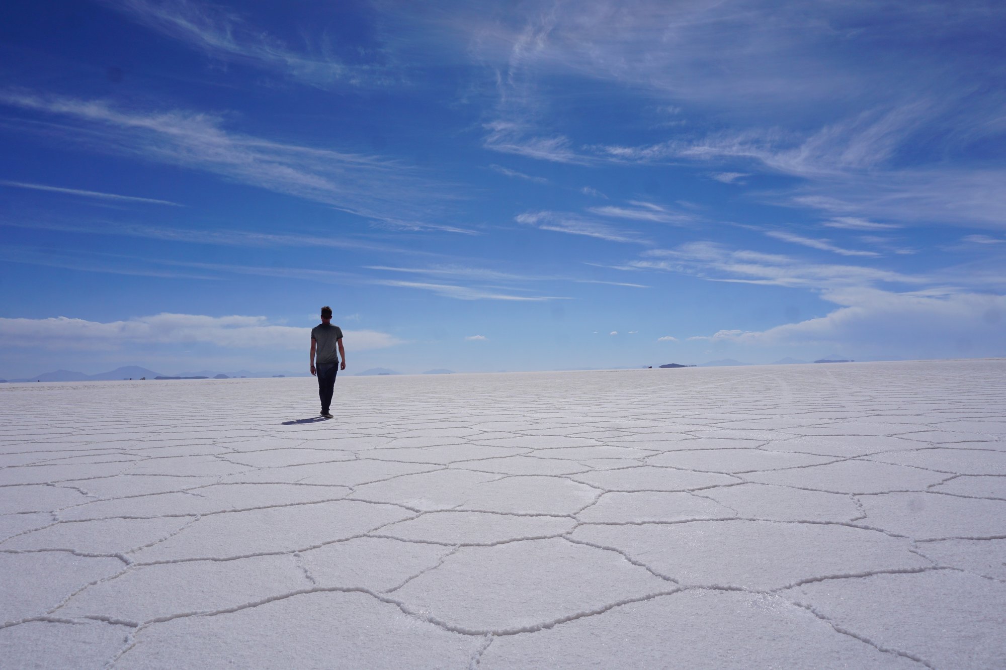 Aan het einde van de ochtend zien we de zoutvlakte voor het eerst. Mijn hart maakt een klein sprongetje, dit is zó mooi! De lucht is felblauw en de grond witter dan wit. Aan het begin van de zoutvlakte staat het oude zouthotel - wat nu niet meer in gebruik is - en krijgen we een smakelijke lunch voorgeschoteld. Daarna rijden we verder en verder de zoutvlakte op... En het wordt alleen maar mooier. Het zout vormt een soort achthoeken op de bodem. Het bizarre is dat je het einde van de zoutvlakte gewoon niet ziet. Waar je ook kijkt, overal ligt zout. Al jaren zie je foto's van Salar de Uyuni en het is net alsof je nu zelf ín zo'n foto bent gestapt. Het landschap is bizar mooi!