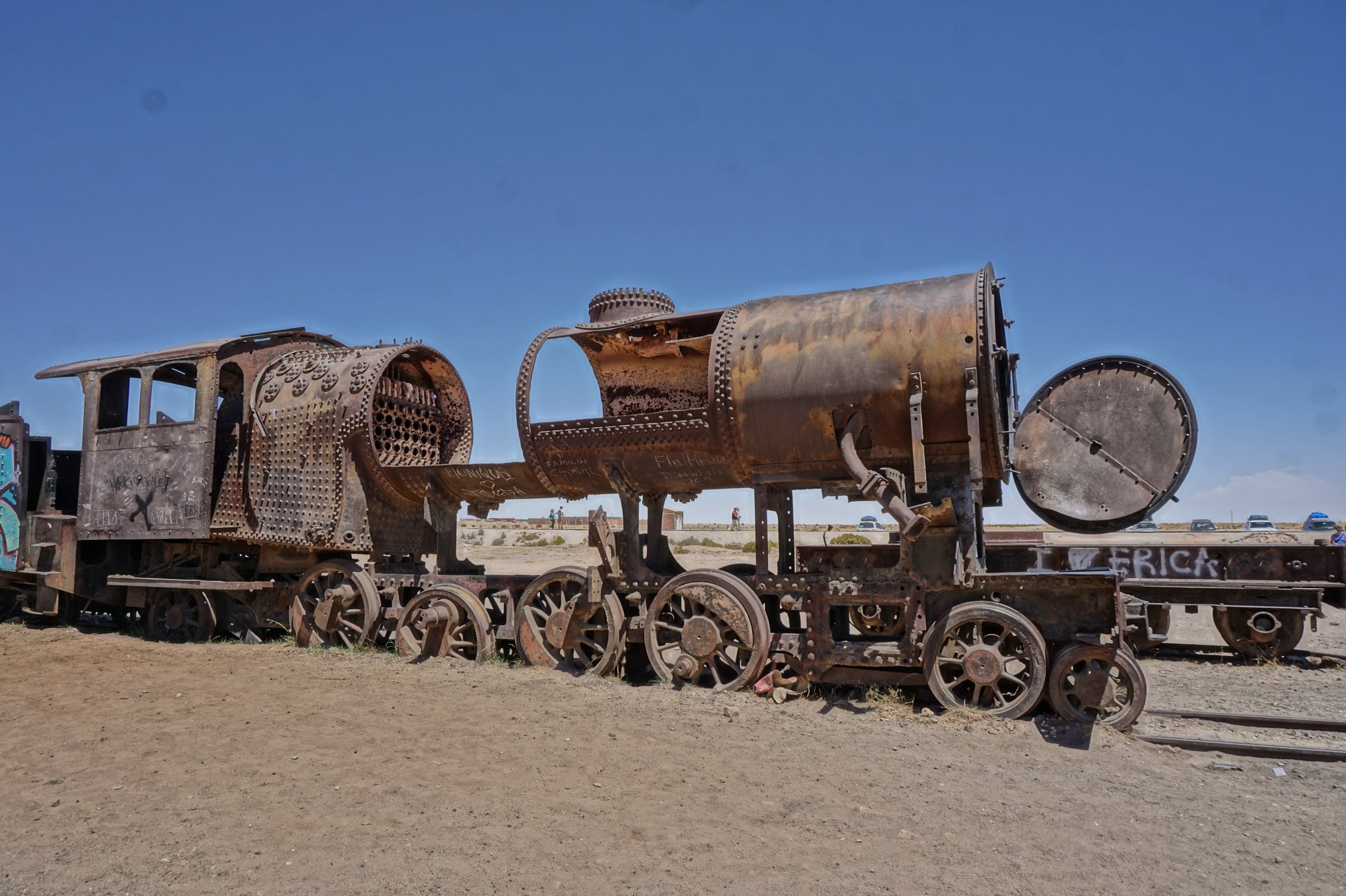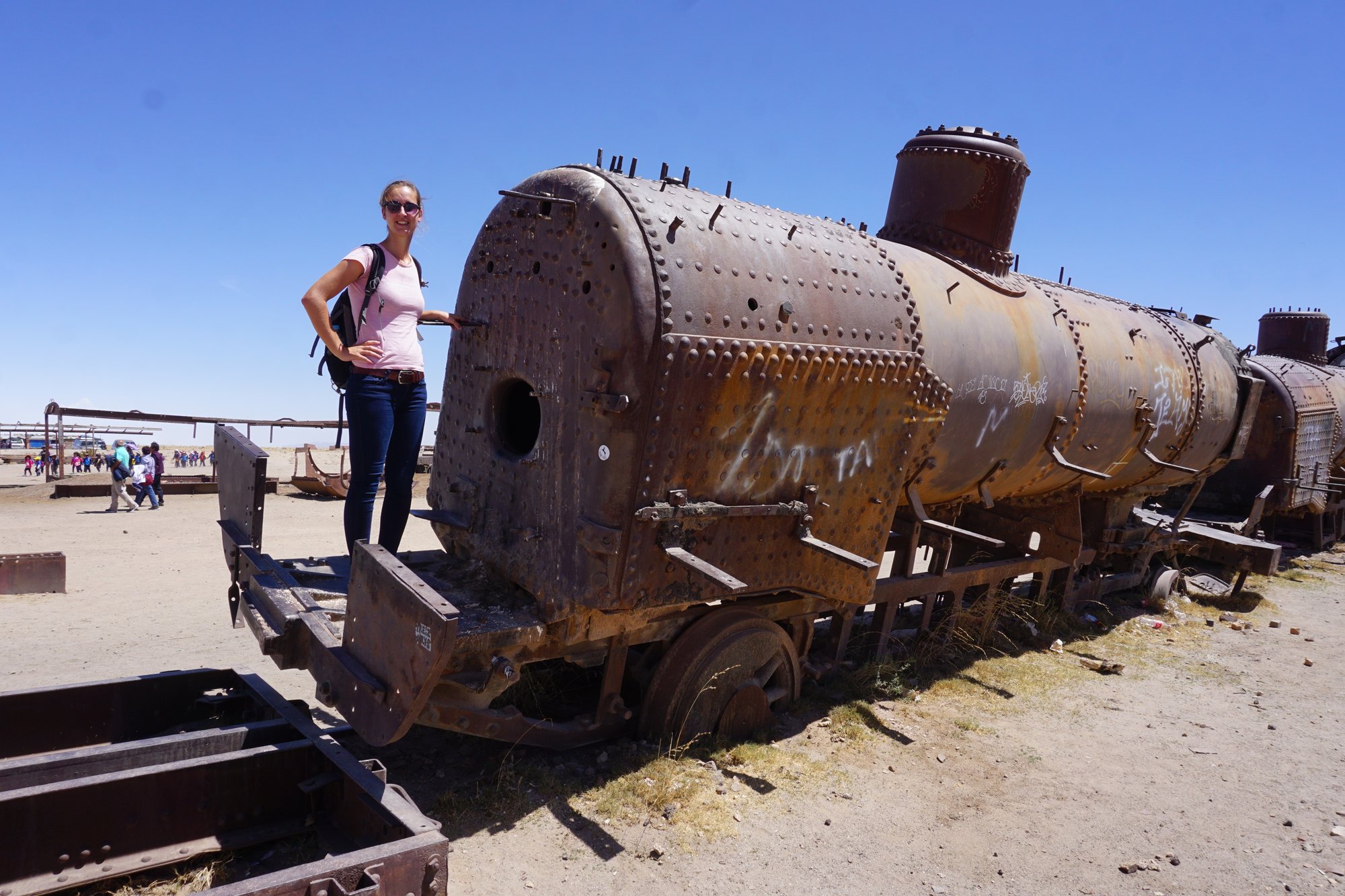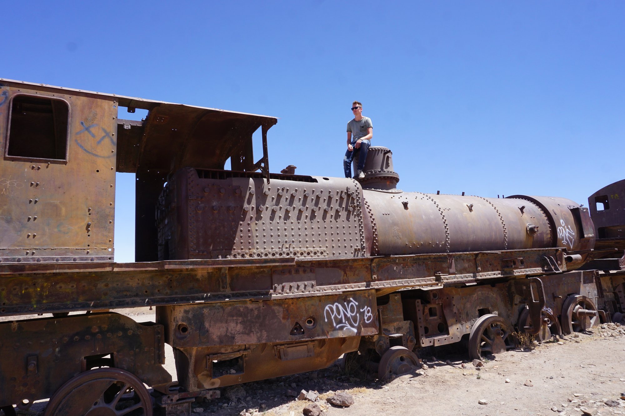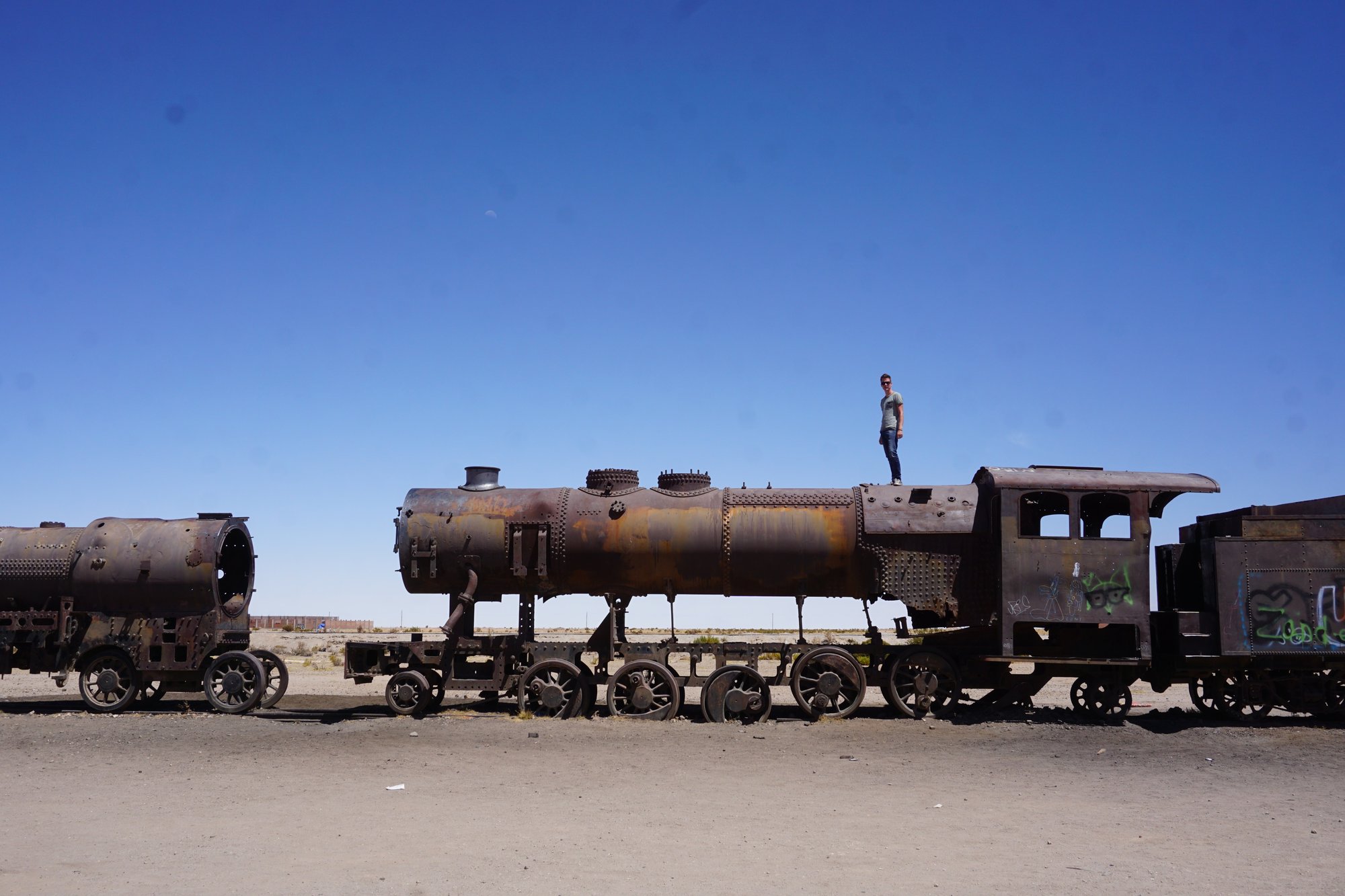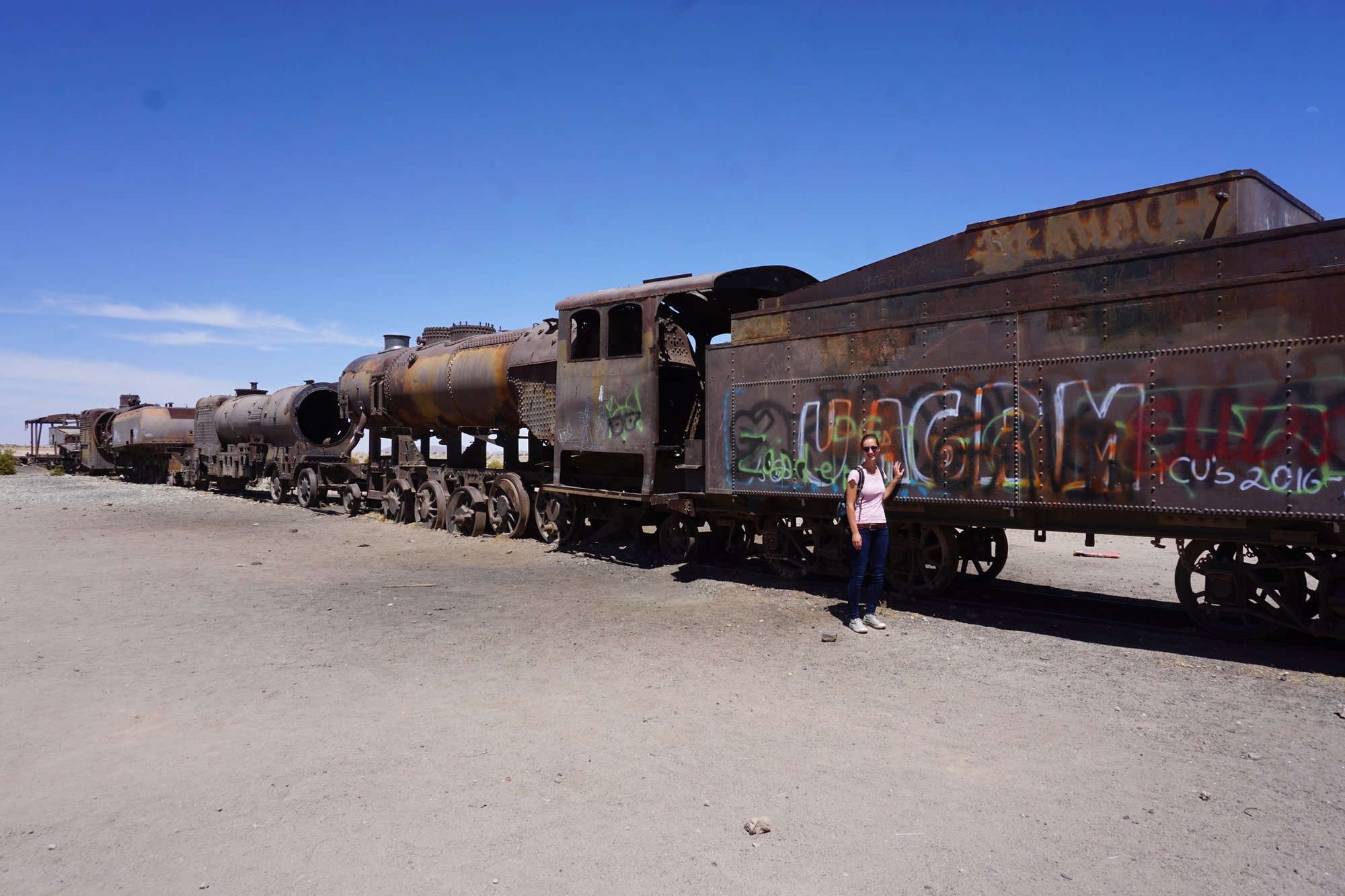 Om 10 uur melden we ons bij het tourbureau, ontmoeten we onze gids en 4 andere groepsleden en gaan we op pad. Yes, zoveel zin in! Na een paar minuten in de jeep komen we al aan bij onze eerste stop: de 'Train Cemetery'. Op deze plek staan oude treinen die al een hele tijd niet meer gebruikt worden. De verlaten treinwagons zijn bespoten met graffiti en zichtbaar verwaarloosd. Het is een fotogenieke plek!