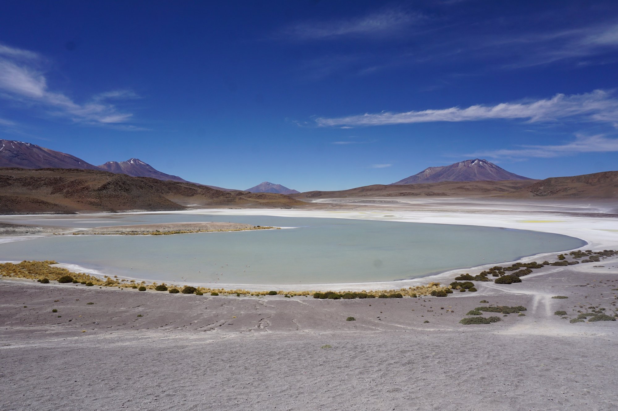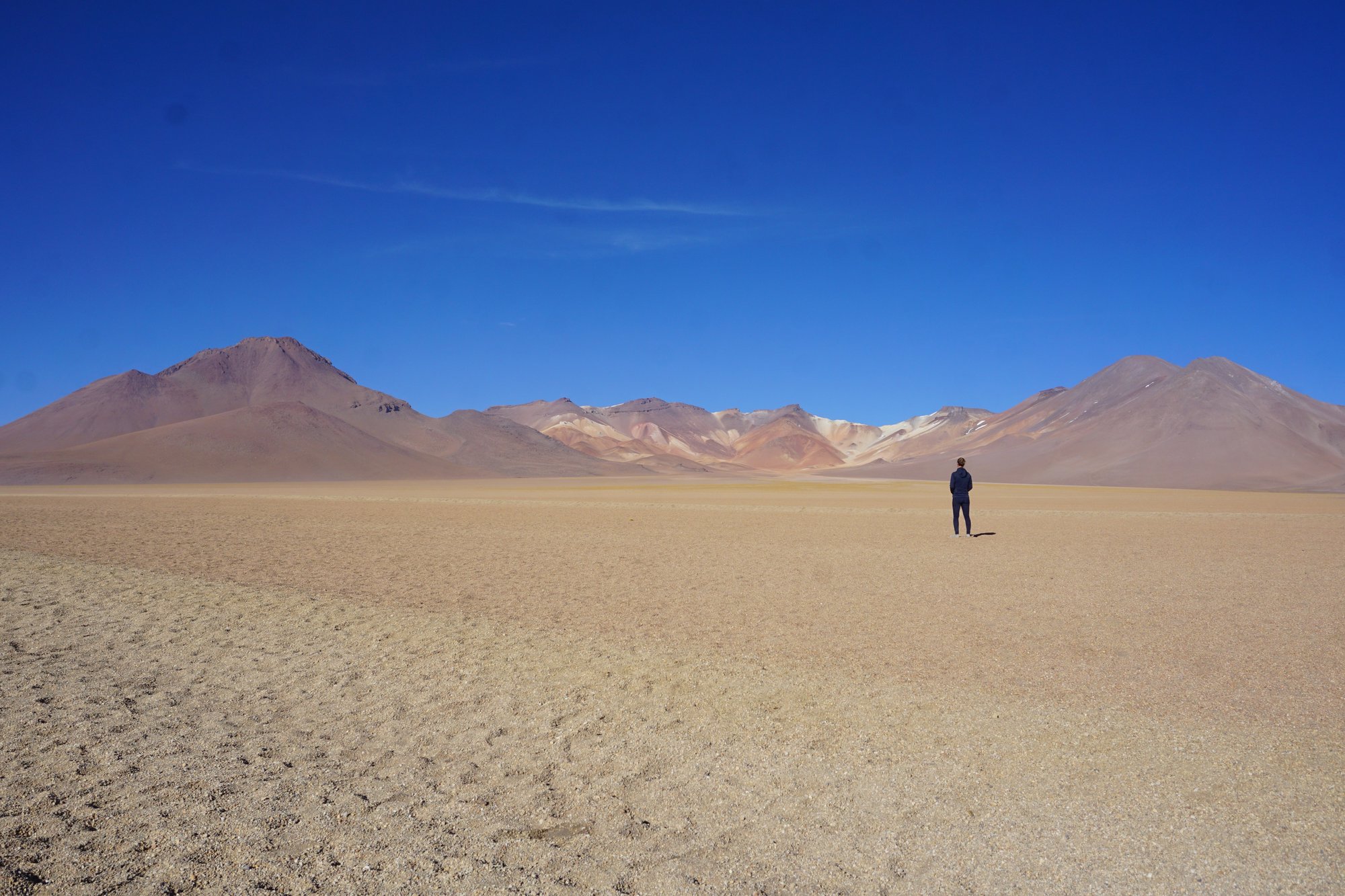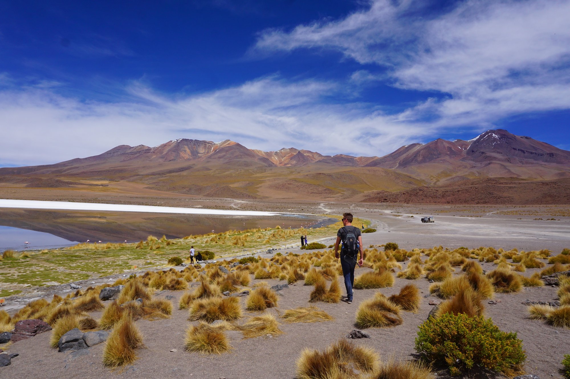 Op de tweede dag van de tour laten we de zoutvlakte achter ons. Maar we krijgen er minstens zulke mooie landschappen voor terug. We rijden door de middle-of-nowhere over uitgestrekte vlaktes. Constant worden we omringd door bergen en vulkanen en regelmatig stoppen we bij een felgekleurd meer vol flamingo's. Het is waanzinnig!