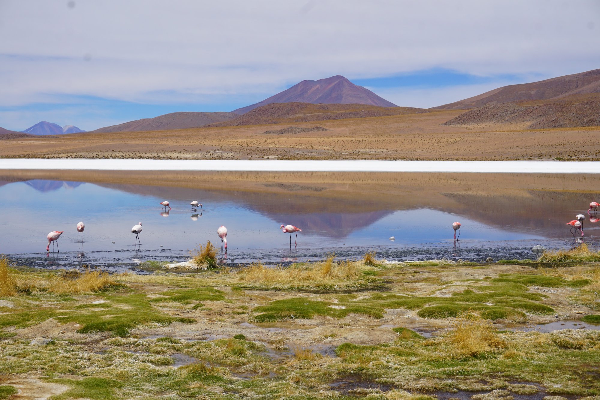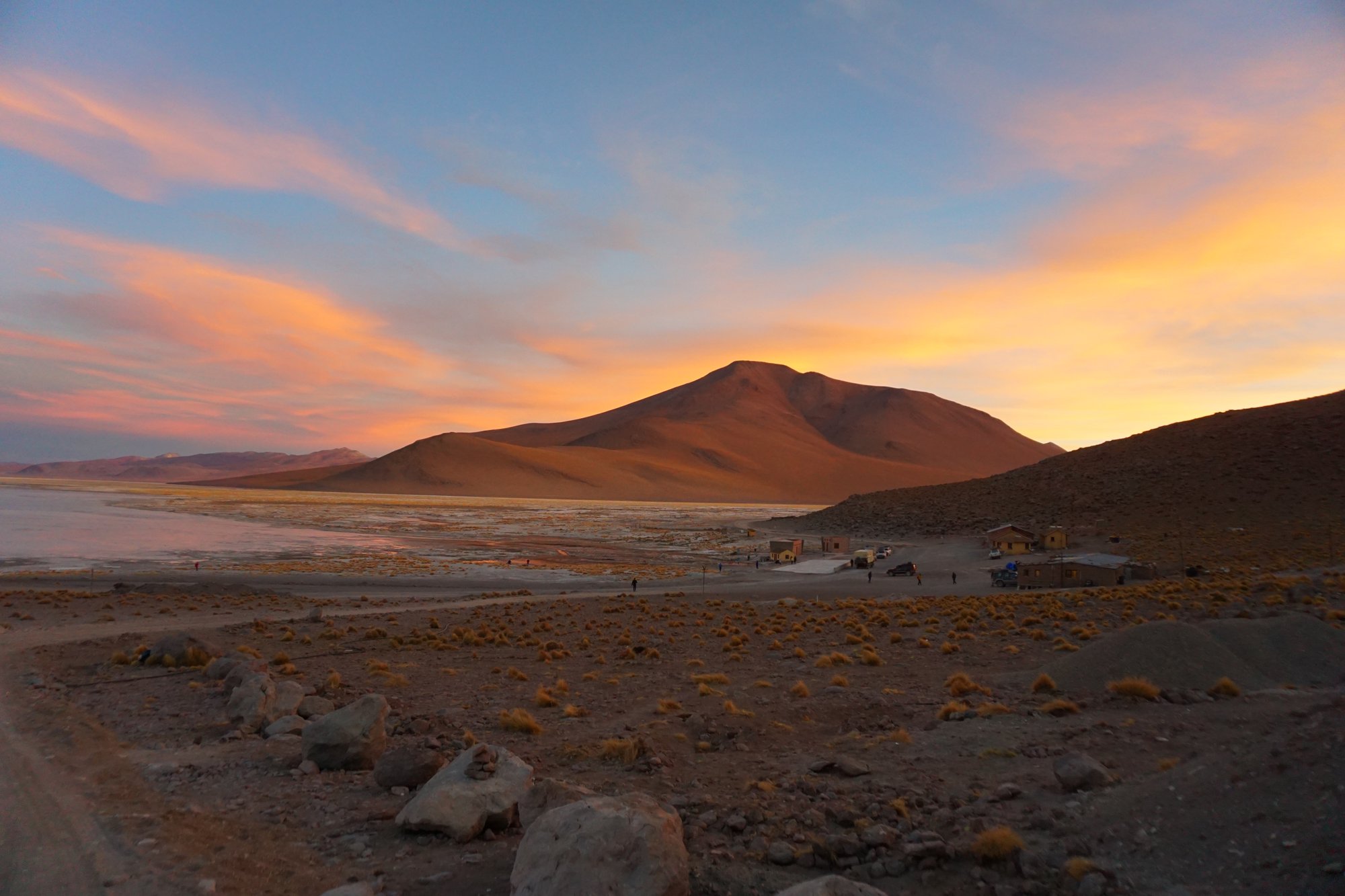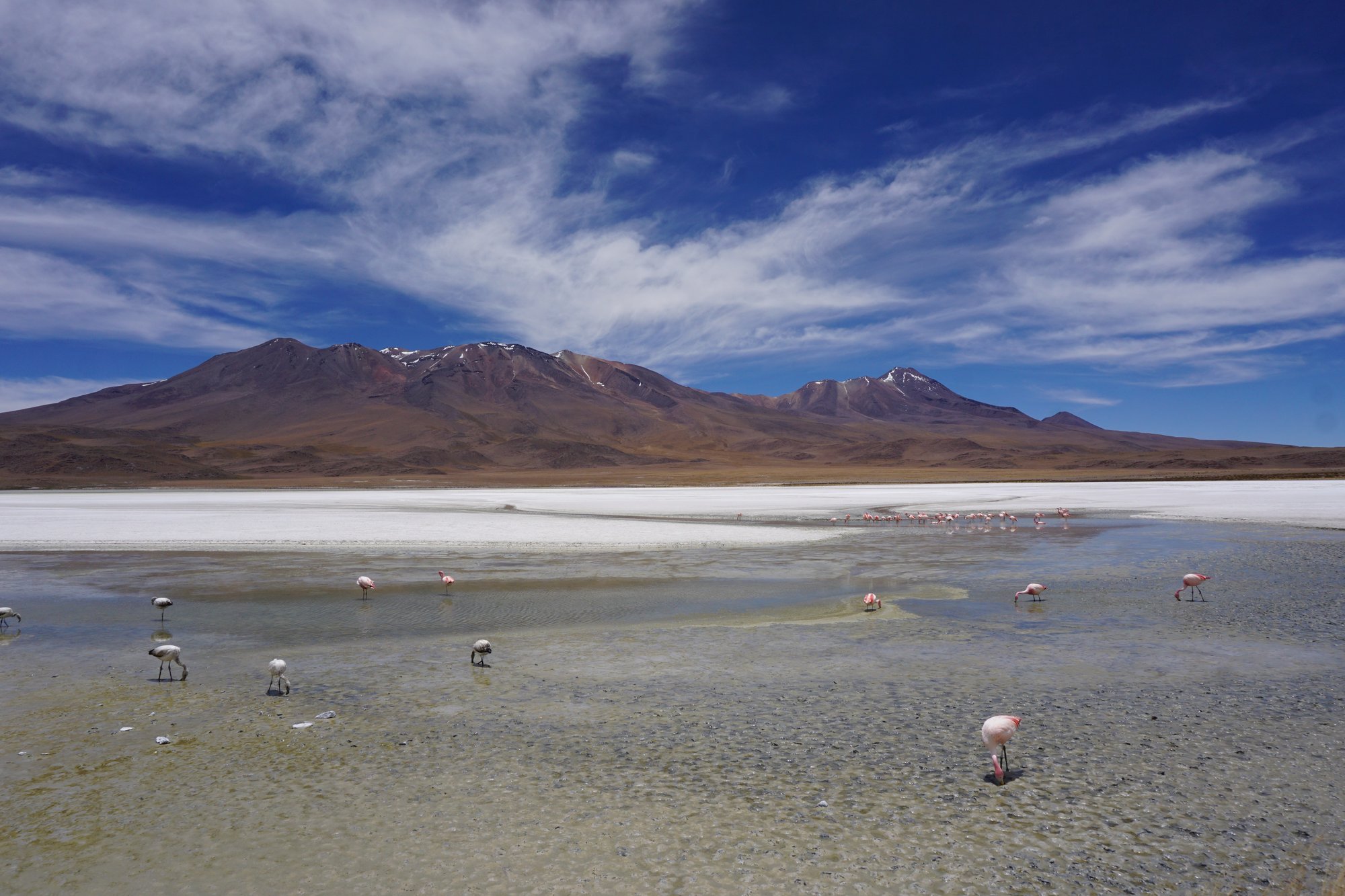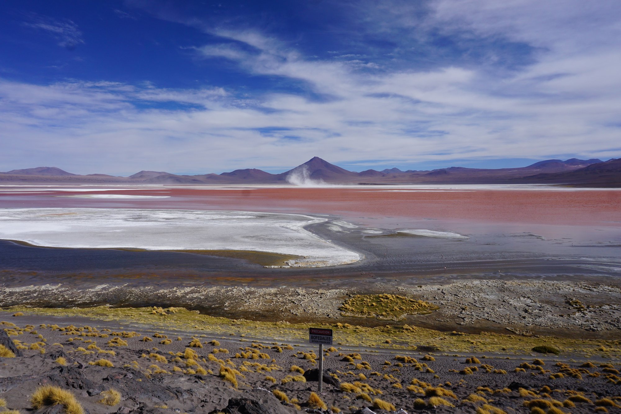 Op de tweede dag van de tour laten we de zoutvlakte achter ons. Maar we krijgen er minstens zulke mooie landschappen voor terug. We rijden door de middle-of-nowhere over uitgestrekte vlaktes. Constant worden we omringd door bergen en vulkanen en regelmatig stoppen we bij een felgekleurd meer vol flamingo's. Het is waanzinnig!