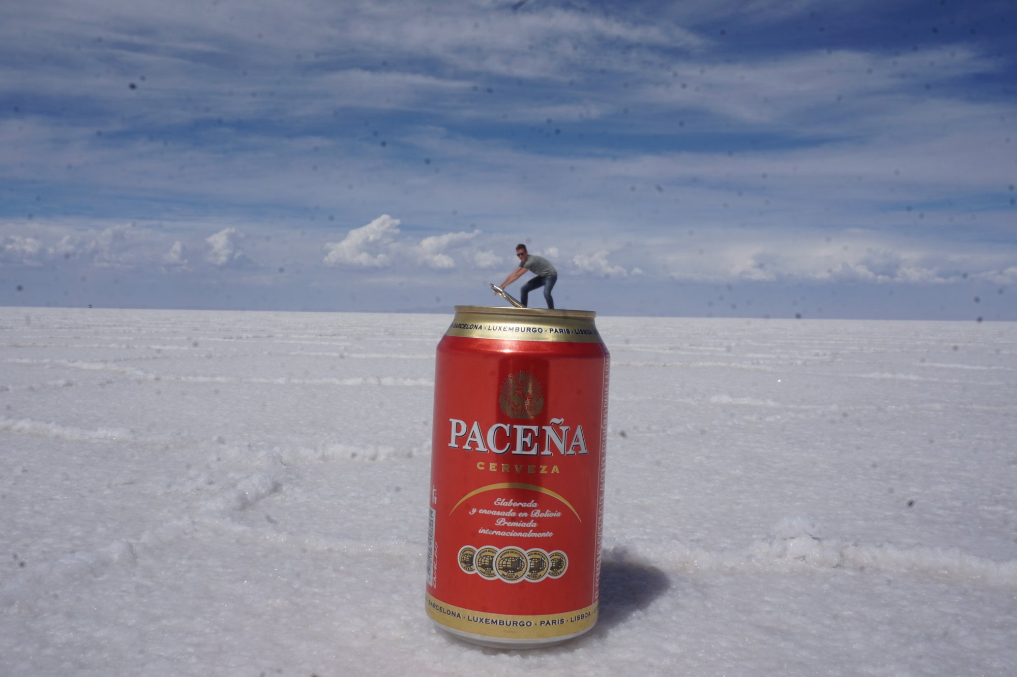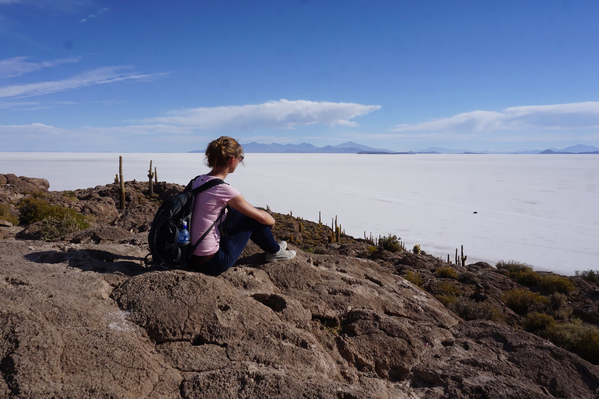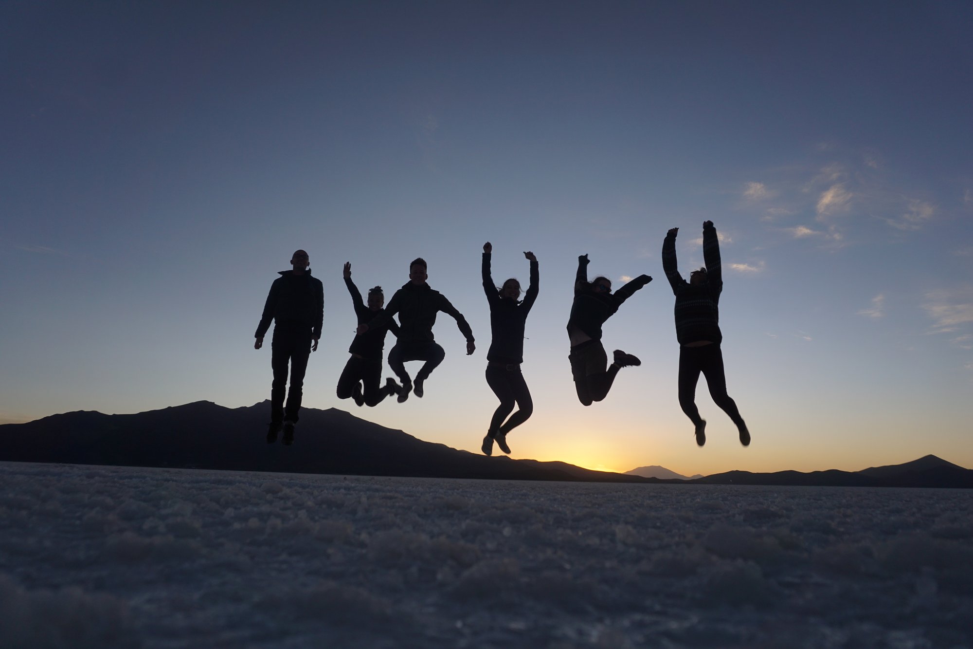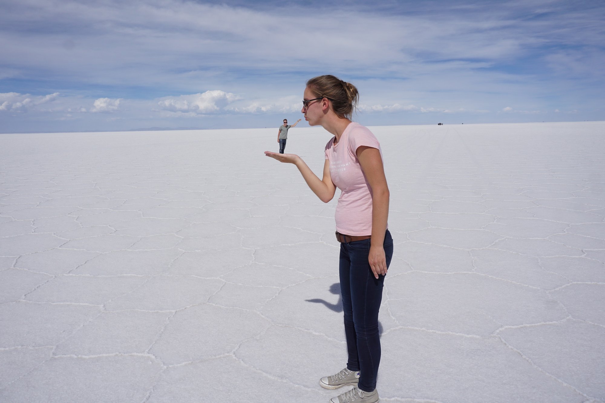 Midden op de zoutvlakte stopt onze gids de jeep en is het tijd voor foto's. Door de weidsheid van de zoutvlakte kun je grappige foto's maken waarbij je speelt met het perspectief. Het blijkt nog best lastig om precies goed te gaan staan, maar onze gids is een ware expert. Zie hier het resultaat!