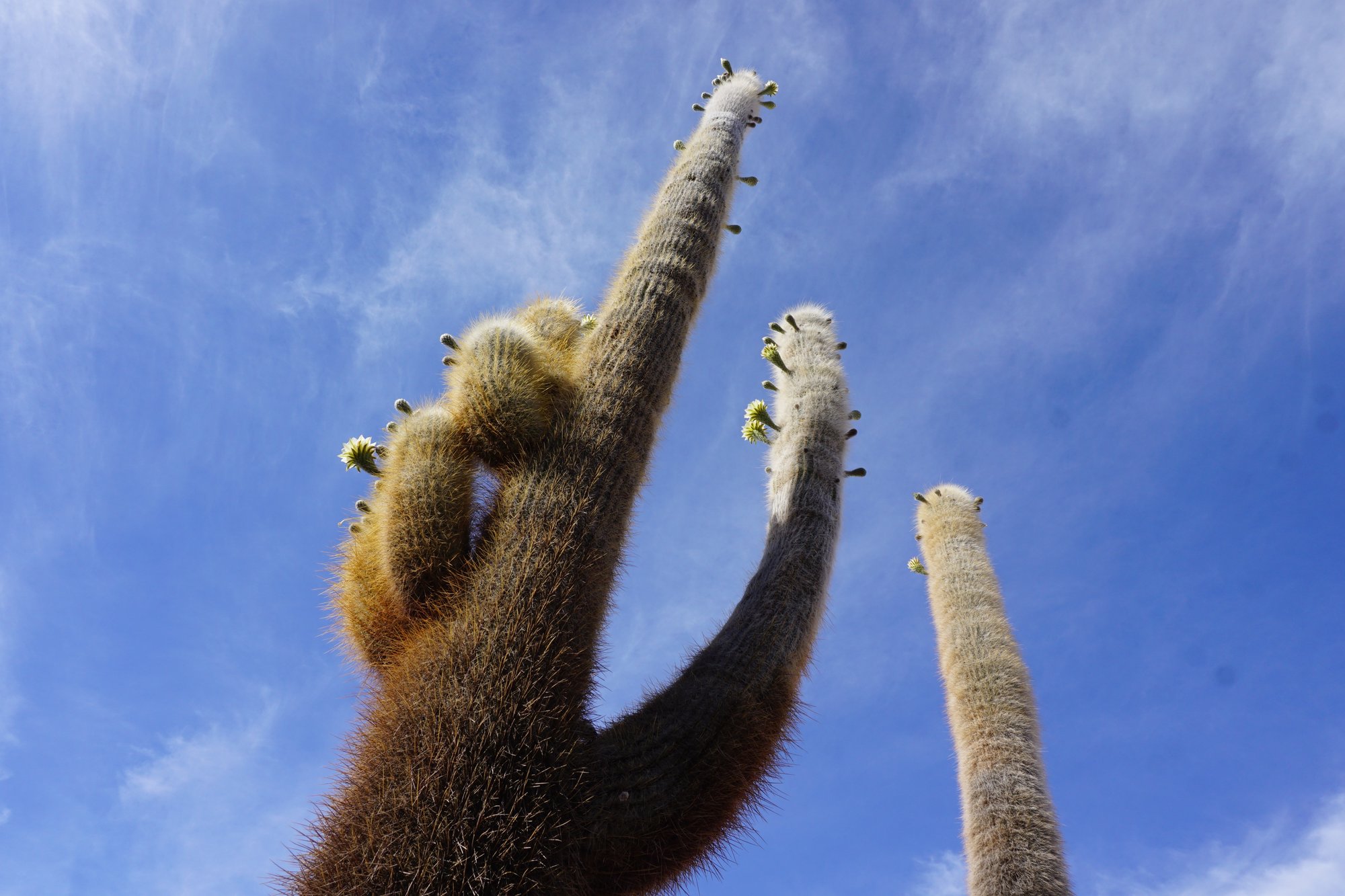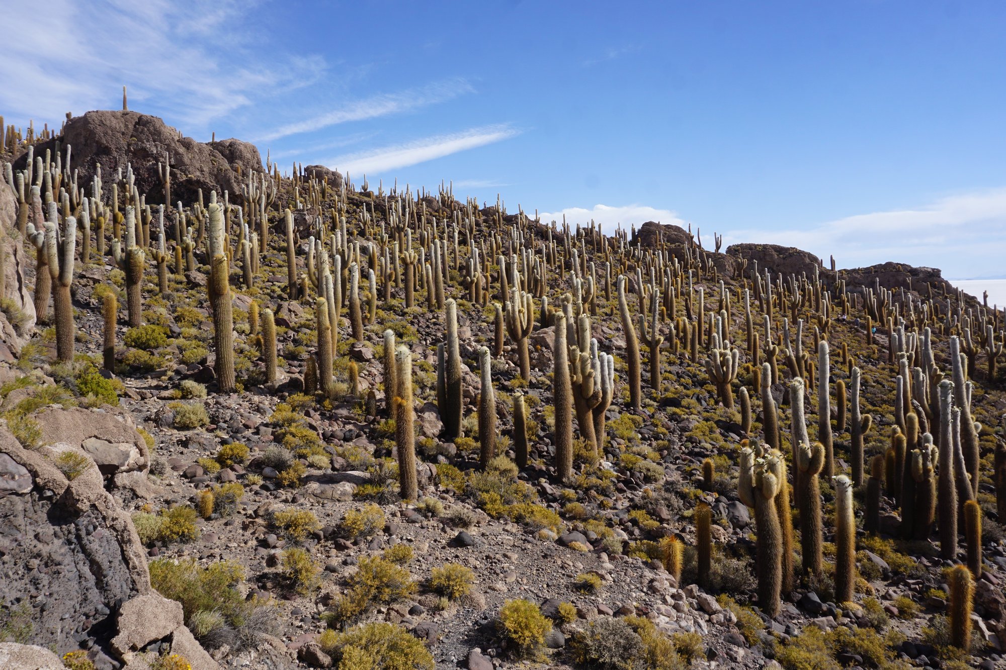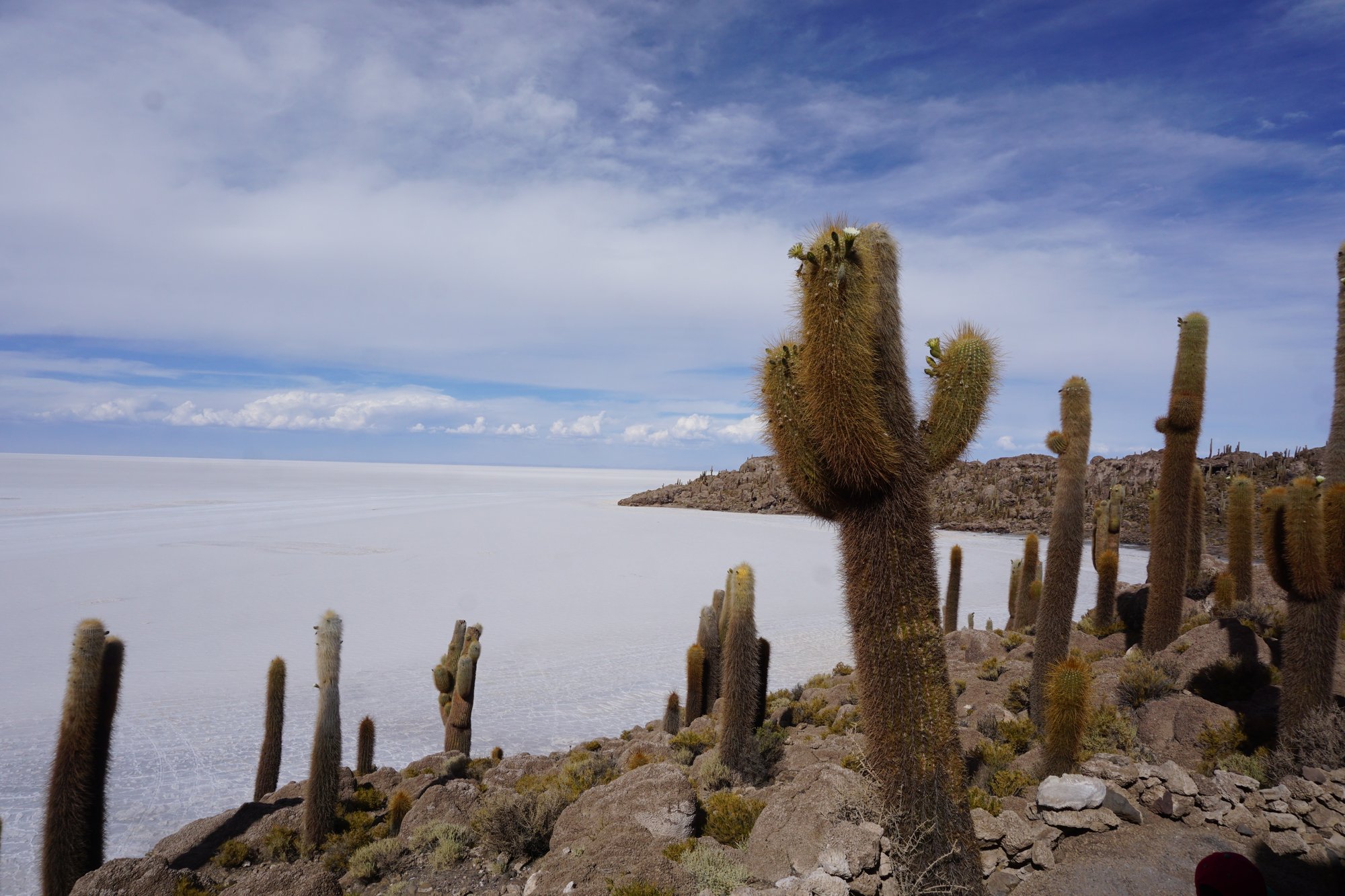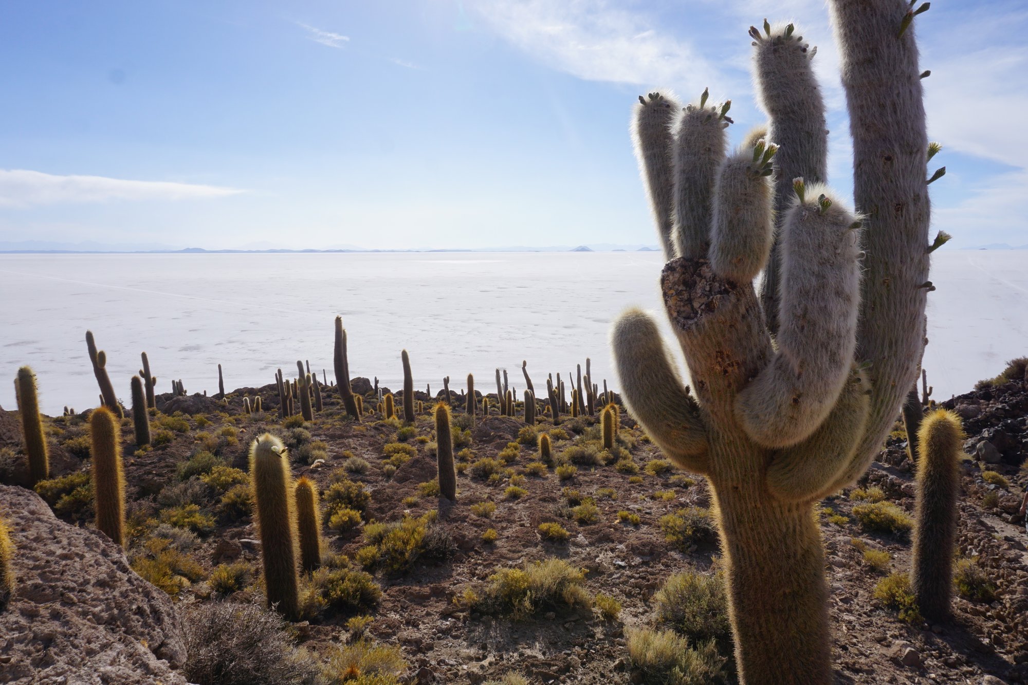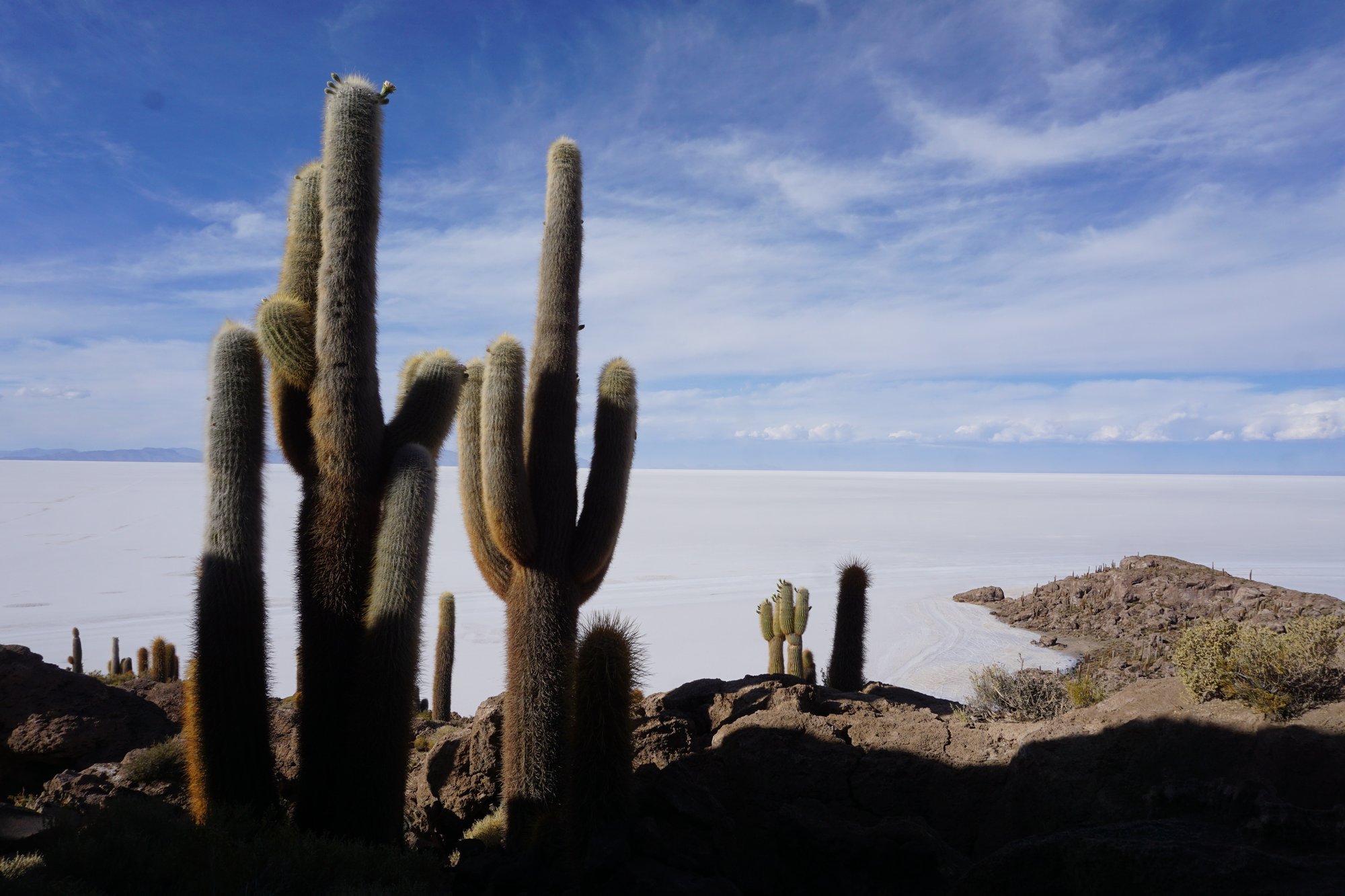 Na de 'fotoshoot' gaan we naar Cactus Eiland, ofwel Isla Incahuasi. We hebben al eerder cactussen gezien, maar niet zulke grote! Sommige zijn wel 10 meter hoog en net zo dik als een flinke boom. Isla Incahuasi staat er helemaal vol mee! De combinatie van de cactussen met de witte zoutvlakte zorgt voor een spectaculair plaatje.