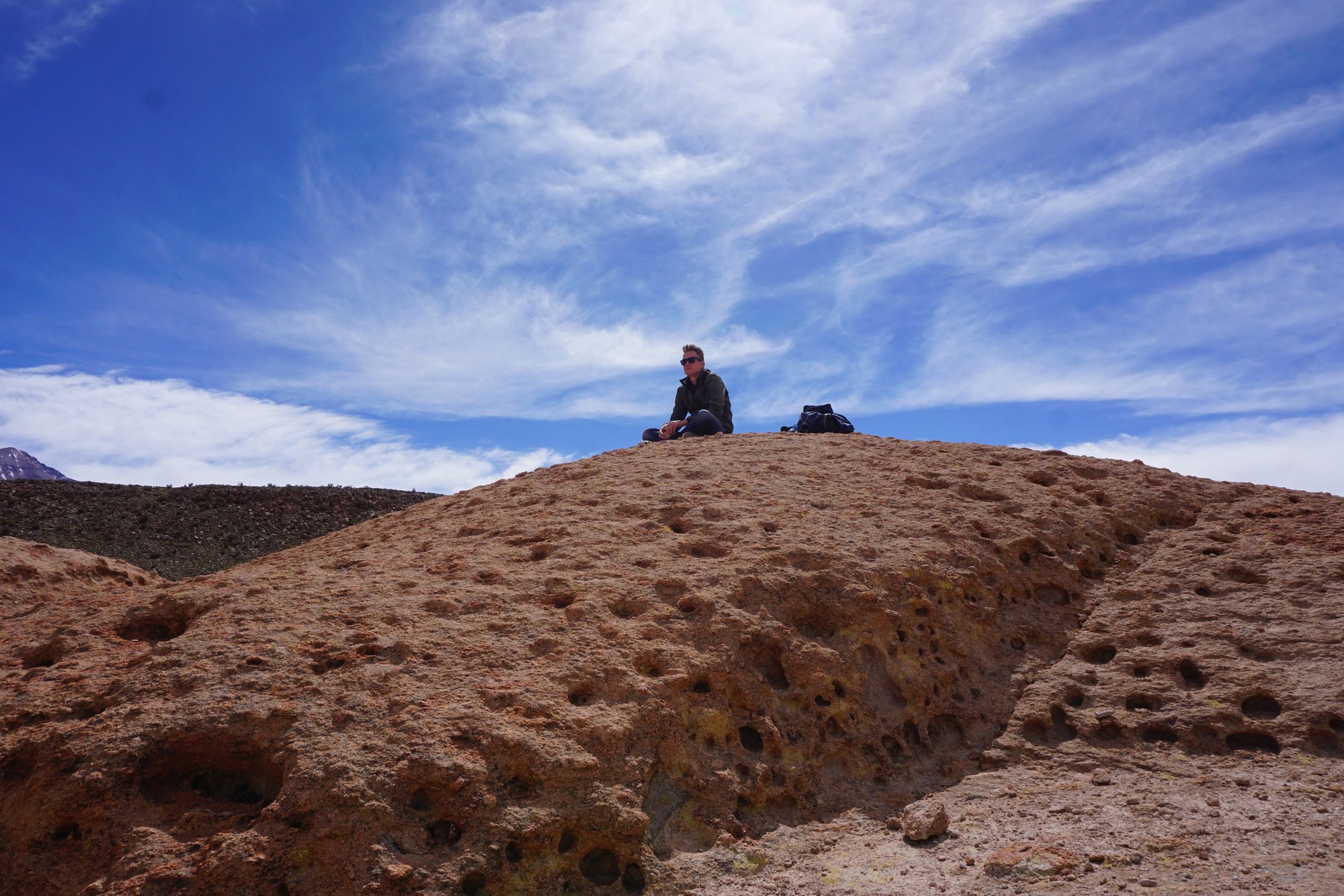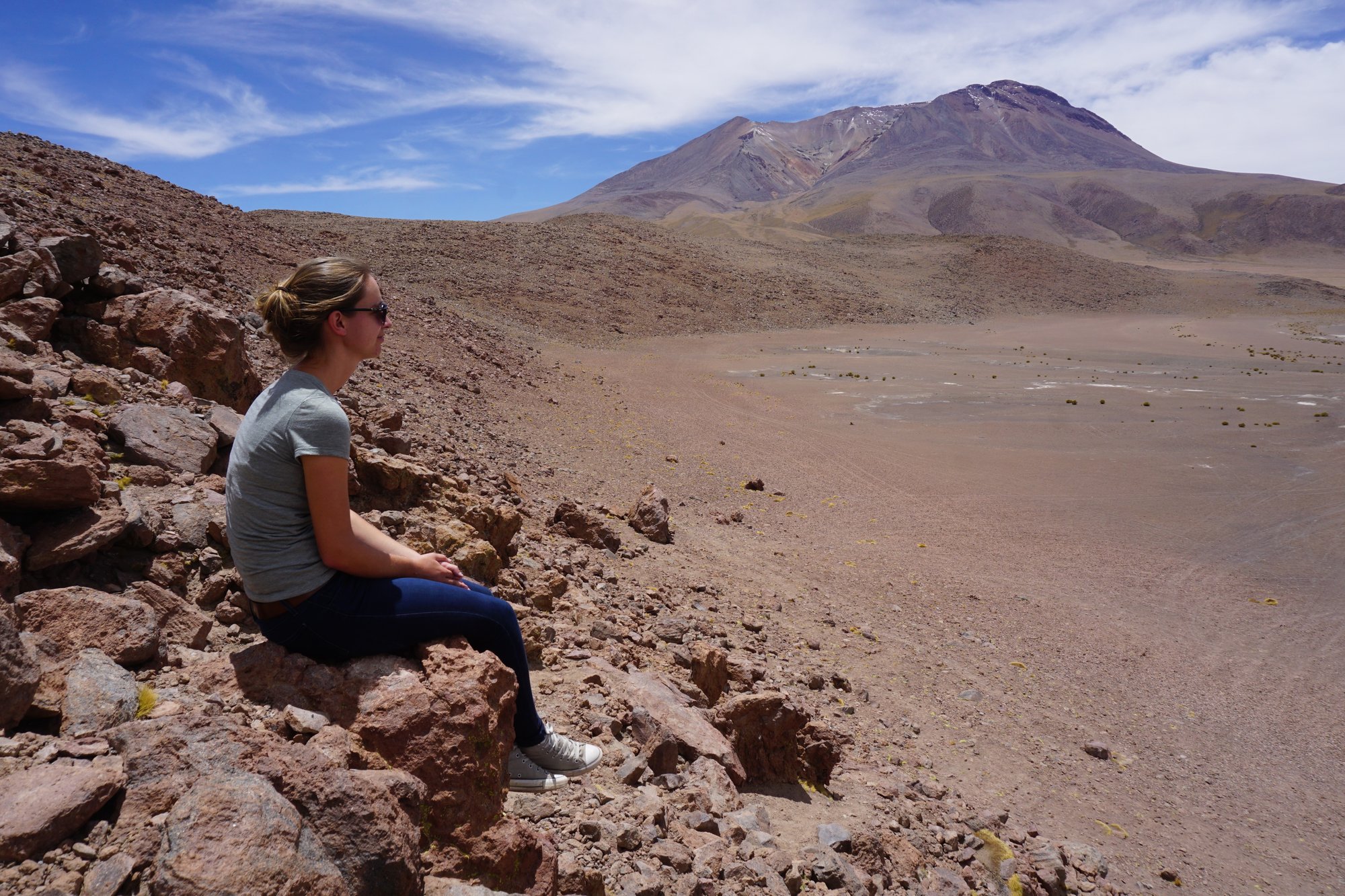 Onze gids zet de jeep stil bij uitkijkpunten over vulkanen, gekleurde meren met flamingo's, woestijnlandschappen en op het laatst stoppen we bij borrelende geisers. We zijn vandaag op grote hoogte en soms waait het héél hard. Het is maar goed dat we dikke kleren bij hebben, maar dan nog is het op sommige plekken erg koud! Maar dat mag de pret niet drukken, want wat genieten we van dit landschap. De uitgestrektheid en ongereptheid maakt ongelofelijke indruk. Waar ter wereld rijd je urenlang in zulke fascinerende natuur?!